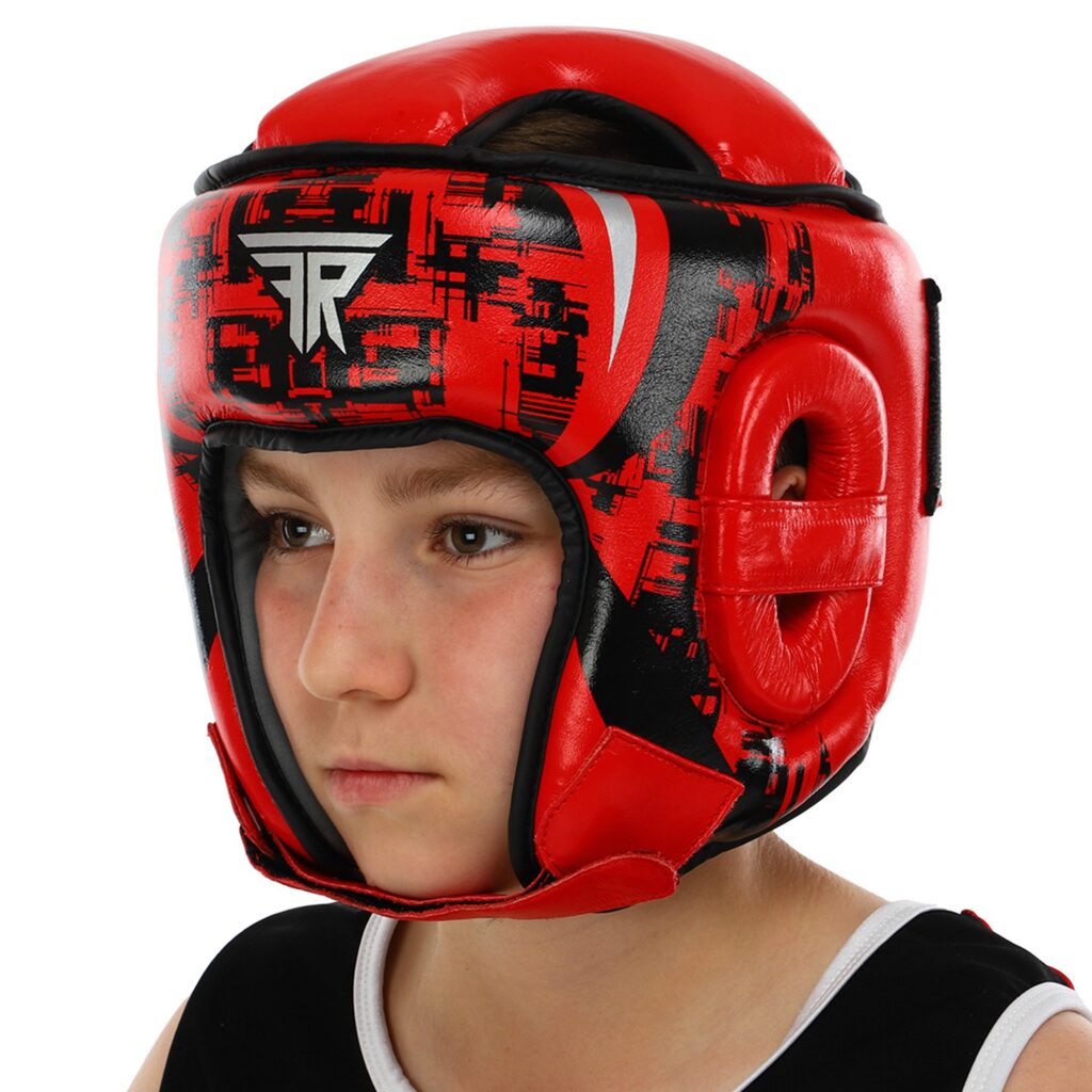 Шлем детский боксерский открытый кожаный красный-черный
