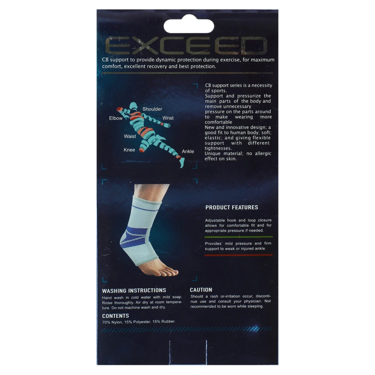 EXCEED представляет собой универсальный бандаж, который подходит для любой окружности голеностопа благодаря своей эластичности. Изготовлен из прочного и одновременно мягкого материала — комбинации нейлона, полиэстера и резины, — он плотно облегает ногу, не вызывая дискомфорта. Эластичность материала обеспечивает оптимальную компрессию, что способствует улучшению кровообращения и уменьшению отеков. Материалы, из которых изготовлен бандаж, обладают высокой воздухопроницаемостью, что предотвращает перегрев кожи и накопление влаги во время длительного ношения.