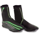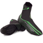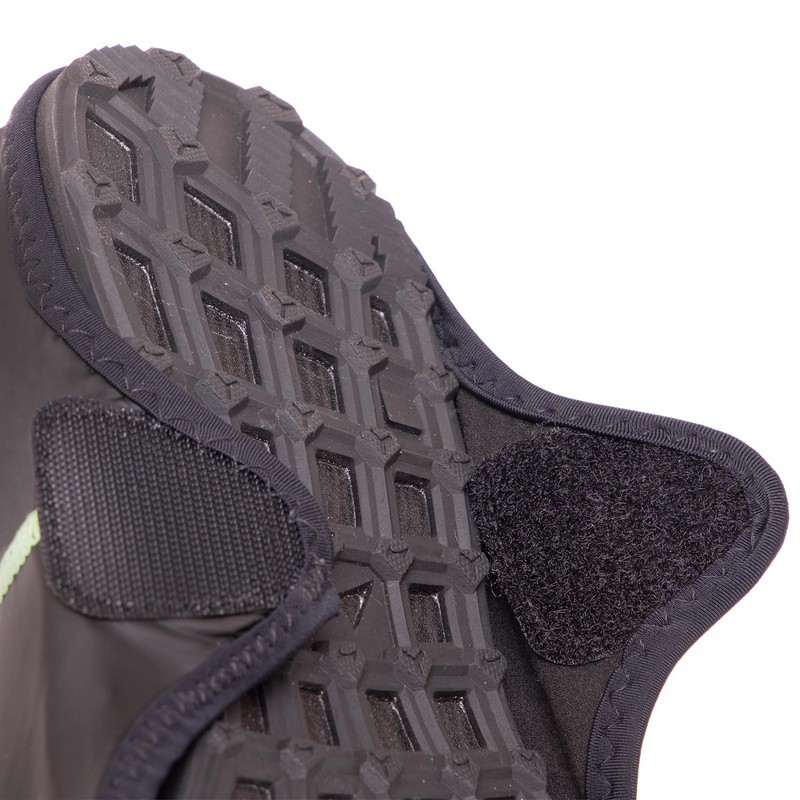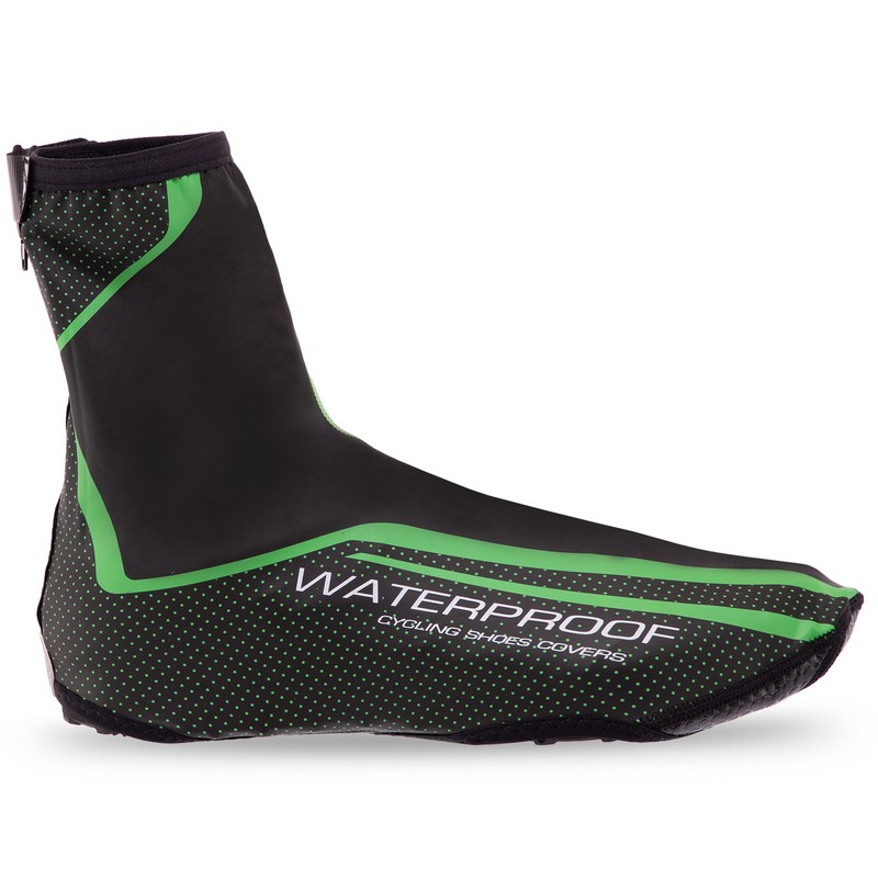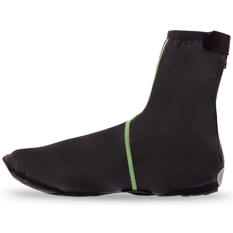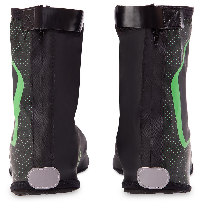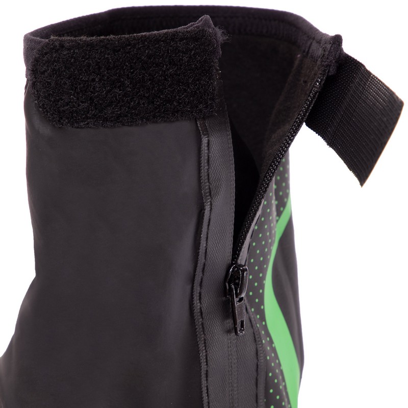 Велосипедные бахилы изготовлены из полиэстера с добавлением эластана, покрытого полиуретаном высокого качества. Материал блокирует воду, ветер и грязь, защищая ноги спортсмена и предотвращая загрязнения и механические повреждения обуви. Молния позволяет быстро надевать и снимать аксессуар, она также защищена от попадания внутрь влаги и ветра. Для лучшего прилегания и надежной фиксации предусмотрены две липучки на щиколотке и стопе. Прочная резинка в верхней части предотвращает скатывание велобахил во время езды. Светоотражающие элементы, расположенные на пятках, повышают безопасность при езде в ночное время.