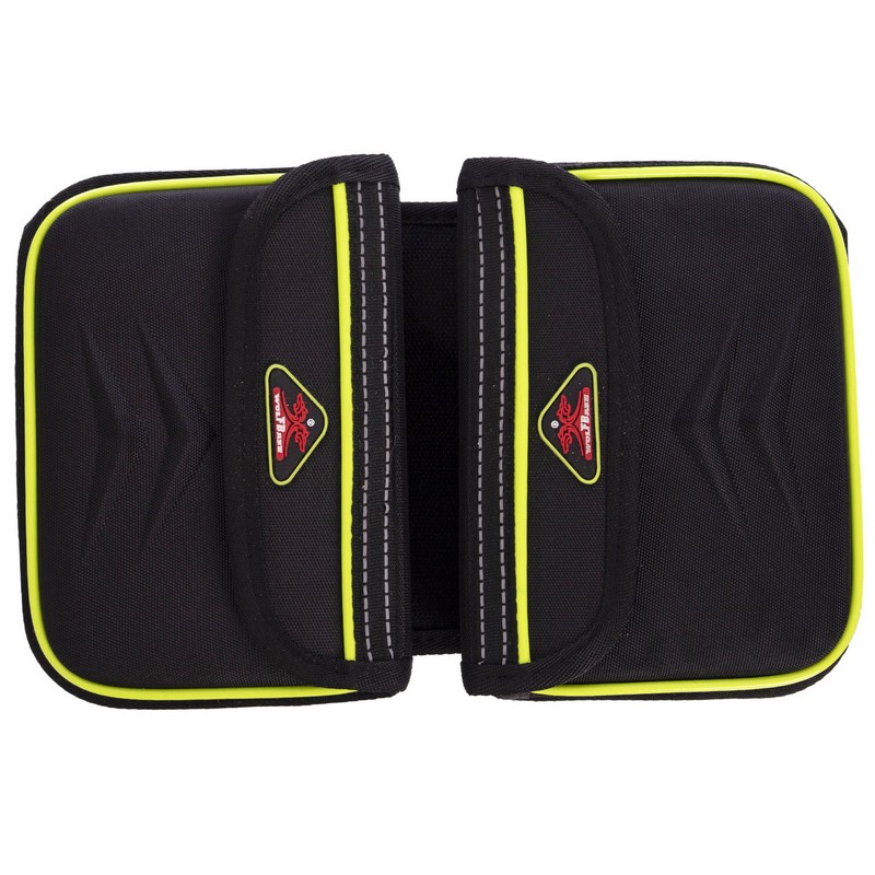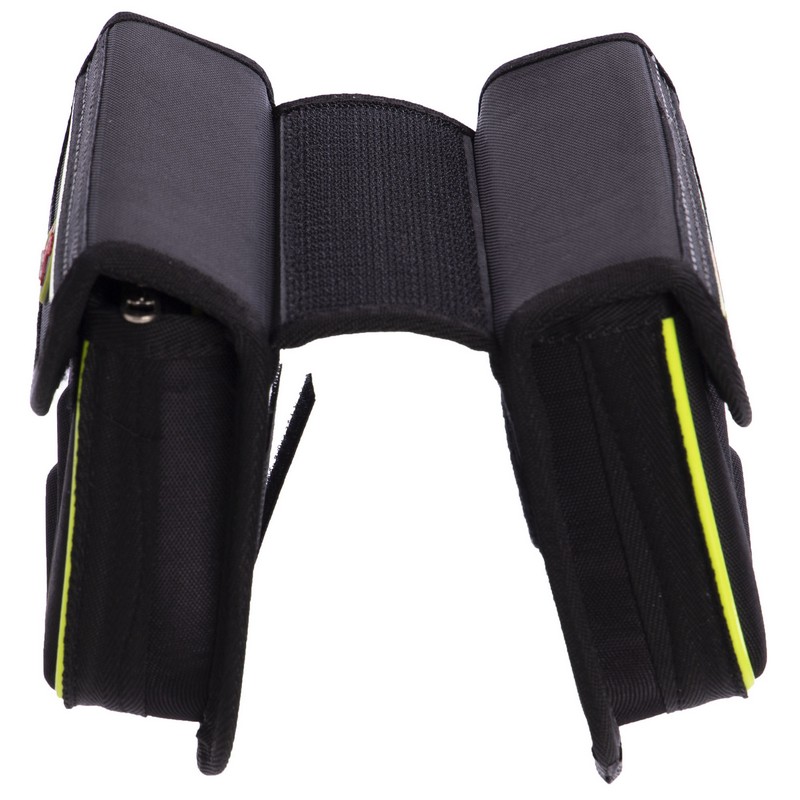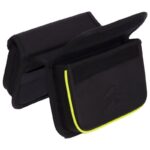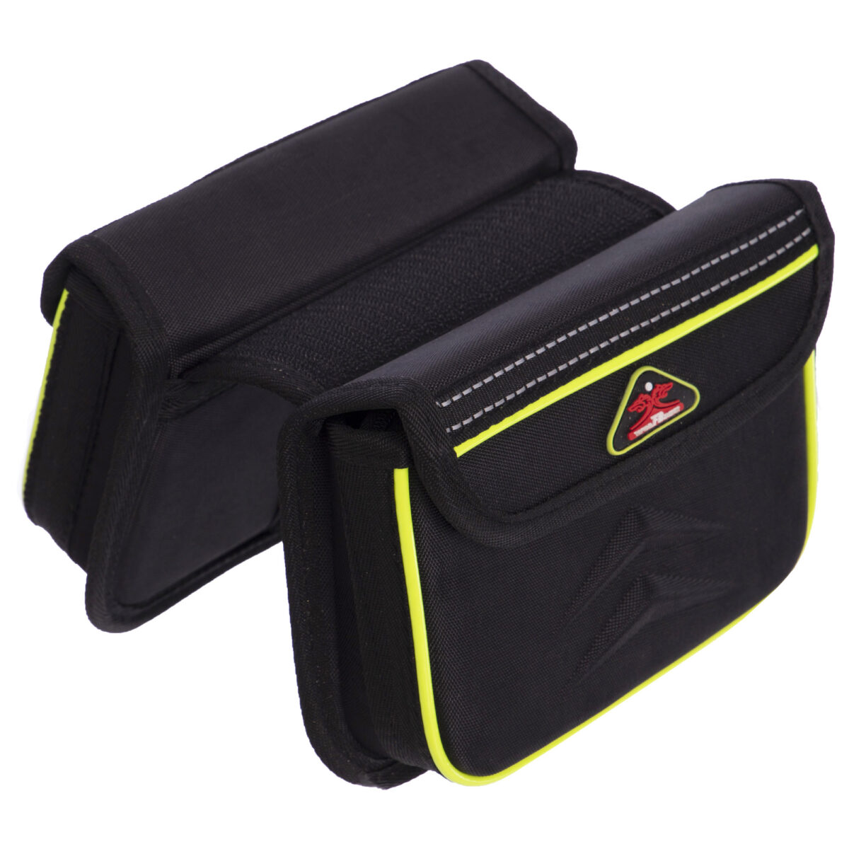 Двойная велосумка имеет удобную форму и небольшой размер. Несмотря на это, в ней достаточно места для важных мелочей. Сумка состоит из двух отделений, которые закрываются на липучку. Крепление на раму универсальное и состоит из ремней и пары липучек. Такой вариант фиксации подойдёт к любому велосипеду.