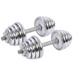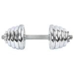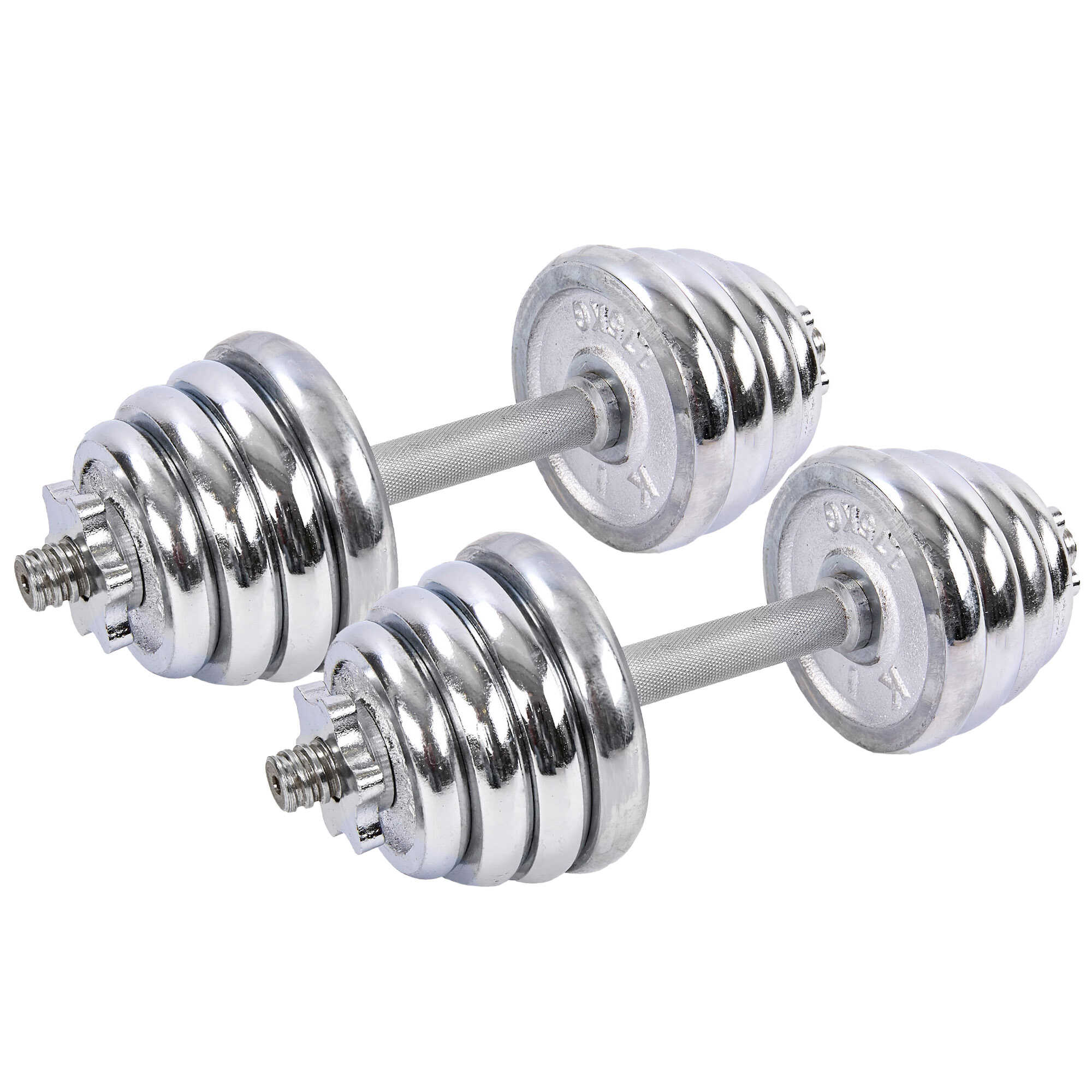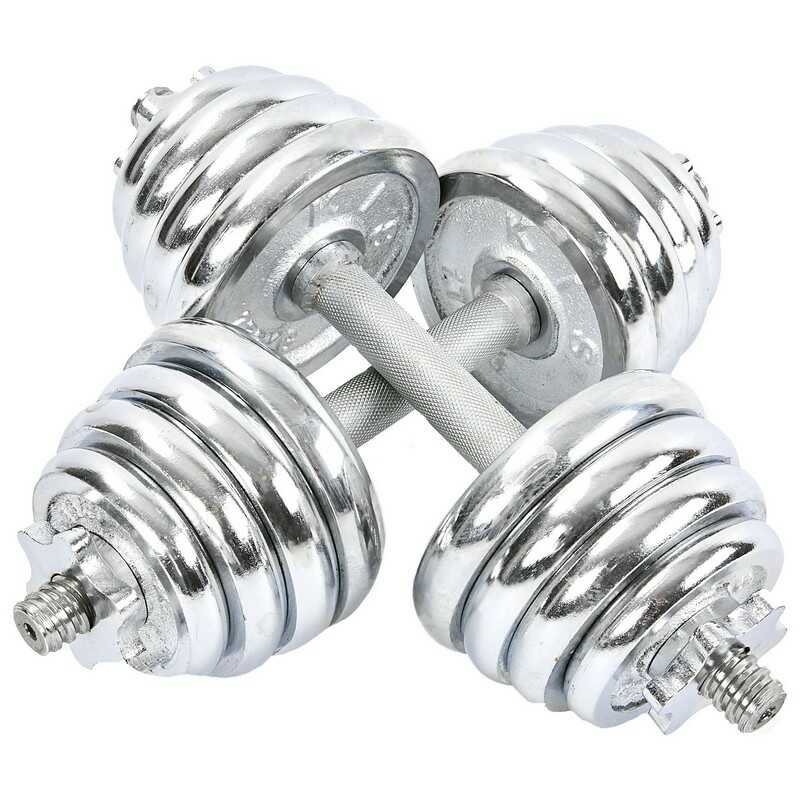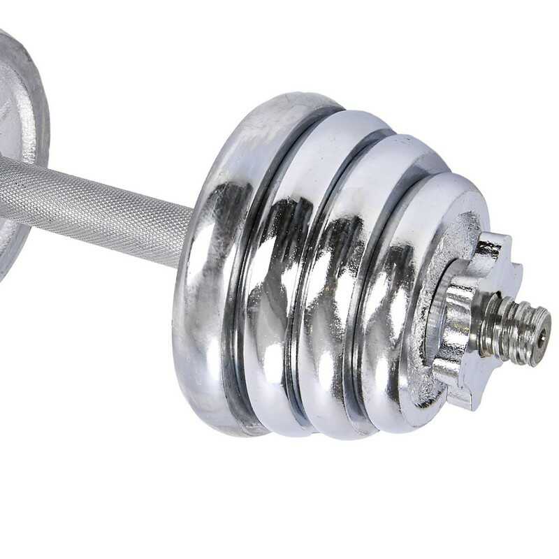 Гантели изготовлены из высококачественной хромированной стали и имеют стильный, эстетически привлекательный дизайн. Комплект включает в себя два грифа, два замка и набор весовых блинов. Для обеспечения максимального комфорта и безопасности тренировок на центральную часть грифов (область захвата) нанесены насечки, что предотвращает скольжение ладони. В то же время звездообразные замки (гайки Вейдера) позволяют быстро собрать/разобрать гантели и обеспечивают надёжную фиксацию блинов – они не болтаются и тем более не могут упасть
