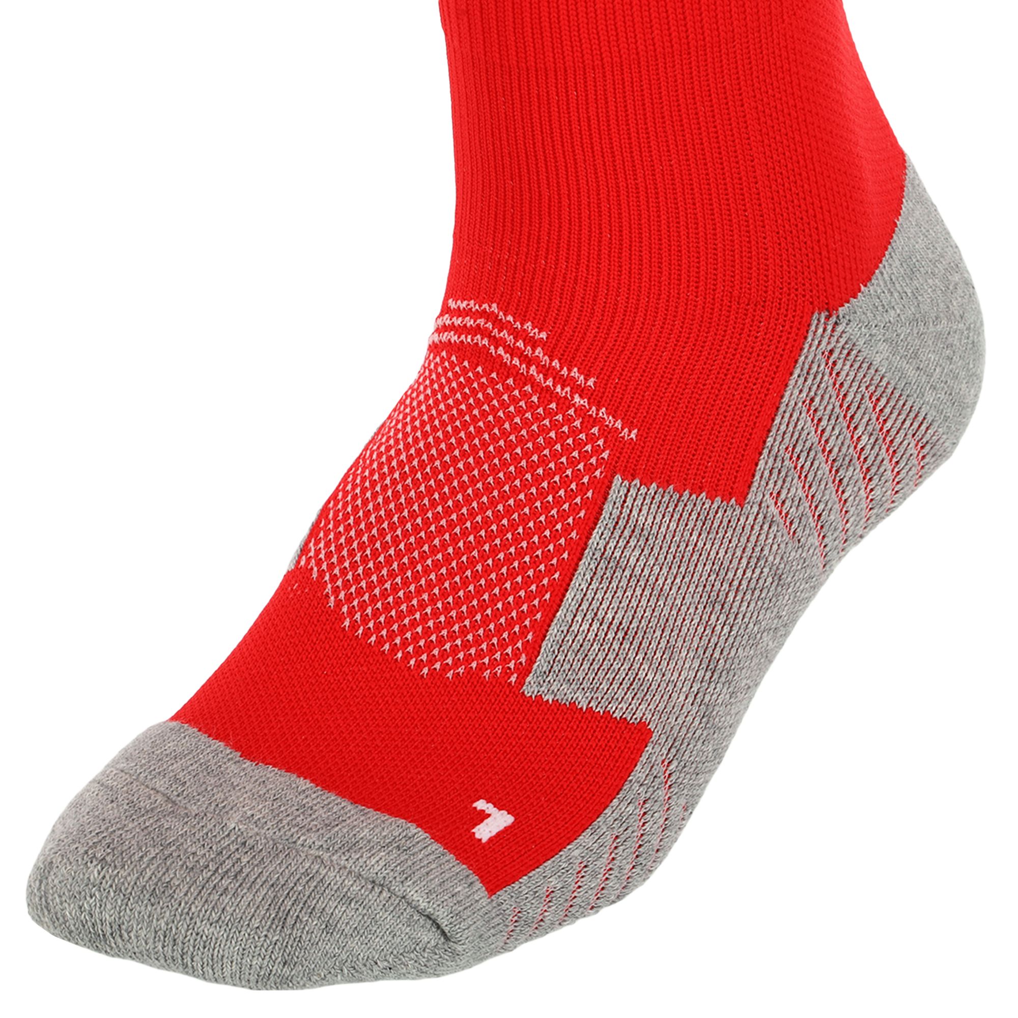 Гетры имеют анатомический крой до колена, надежно защищают ноги игрока от травм и выполняют компрессионную поддержку мышц. Плотную посадку обеспечивают эластичные вставки на подошве и своде стопы. Широкие резинки для фиксации не сдавливают ногу. Тонкие, еле ощутимые швы на носках гетр обеспечивают комфорт в носке и плотное прилегание стопы к кроссовкам.