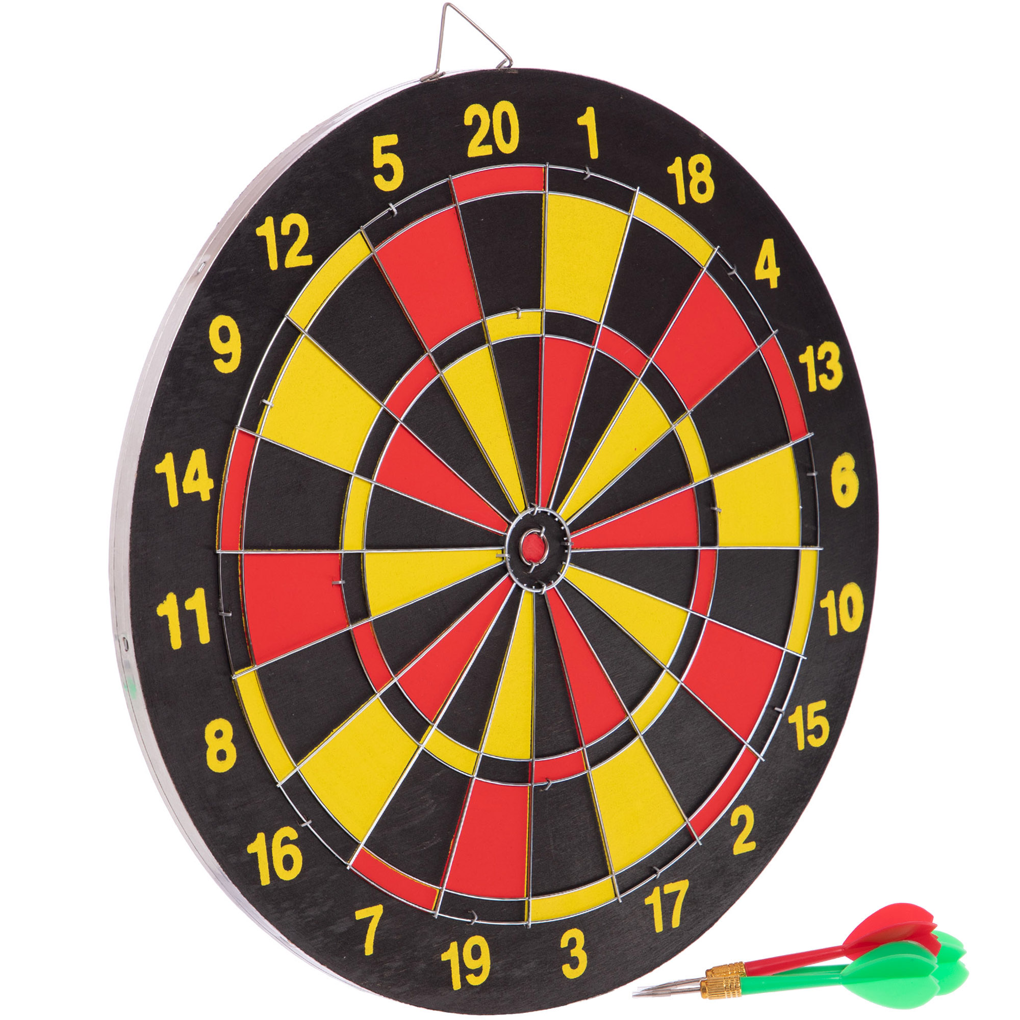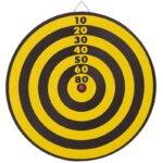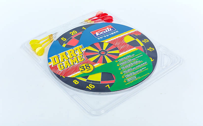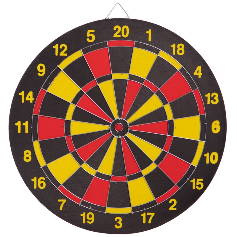Мишень для игры в дартс изготовлена из прессованного картона. Изделие имеет окантовку из стальной круглой проволоки и комплектуется набором дротиков. Дротики изготовлены из полиэтилена и хорошо сбалансированы. Иглы изготовлены из стали. Каждый дротик весит по 8 грамм. Мишень для игры в дартс имеет отличную от классической расцветку игрового поля. Сектора окрашены красным и желтым цветами. На мишень методом печати нанесены цифры. Крупный размер цифр позволяет игроку с расстояния рассмотреть их. Изделие имеет двусторонний дизайн, что позволяет упражняться в точности на разных вариантах мишеней.