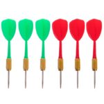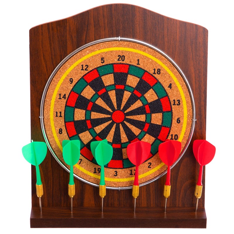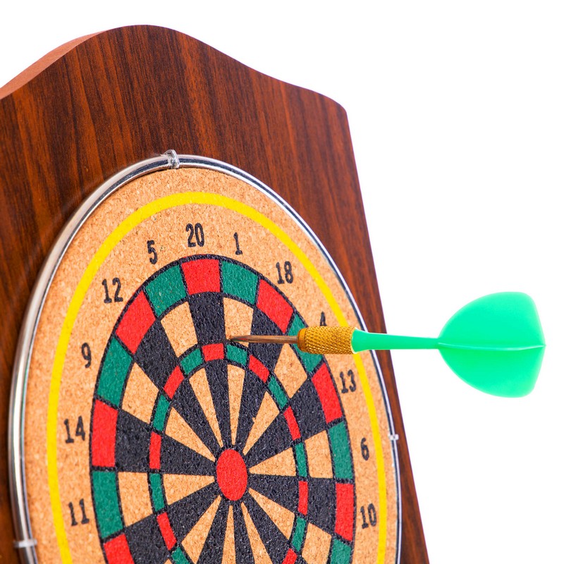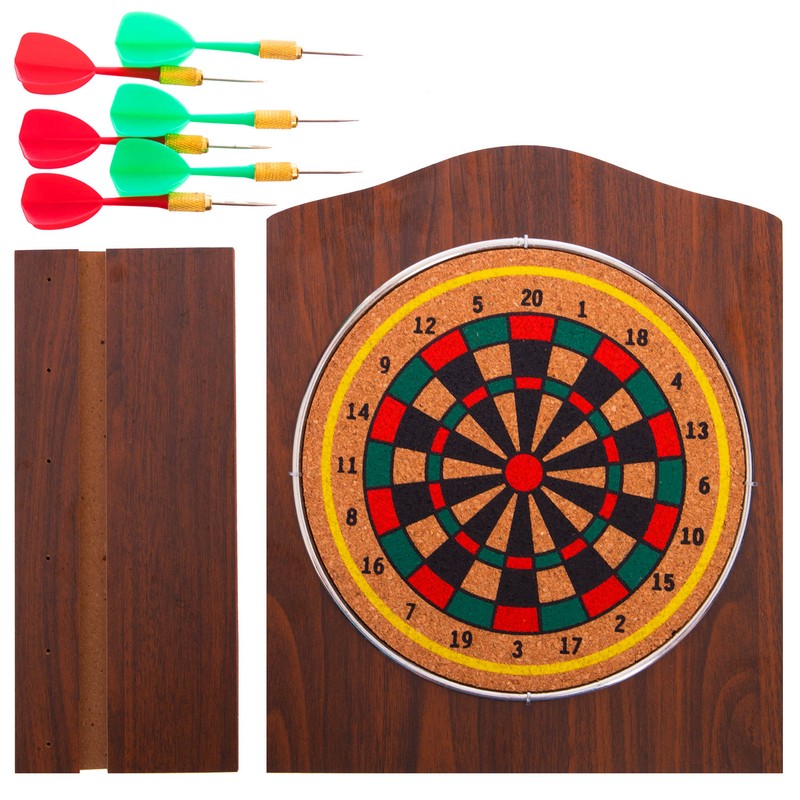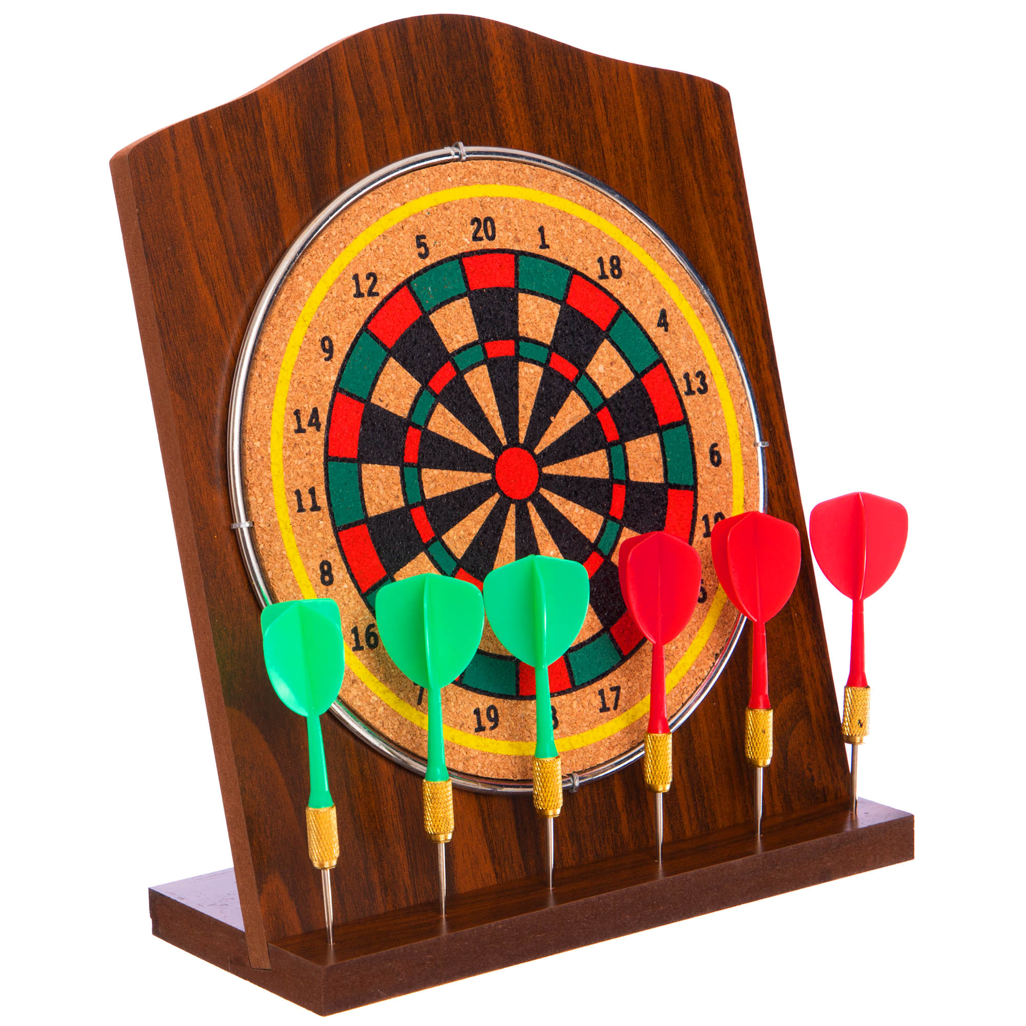 Настольная мишень для игры в дартс изготовлена из мягкой пробковой древесины, которая отличается долговечностью и не вредит наконечникам дротиков. Конструкция имеет устойчивую форму и компактные размеры. На передней части расположена зона для попадания с классическим разделением на сектора, линию удвоения, утроения и “яблочко”. Границы мишени обозначены металлической проволокой. В комплект включены 6 легких сбалансированных дротиков, которые обеспечивают точность броска. Наконечники дротиков выполнены из стали, а хвостовик — из легкого полиэтилена. Настольный дартс упакован в цветную, подарочную коробку.