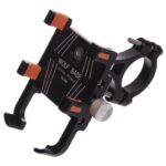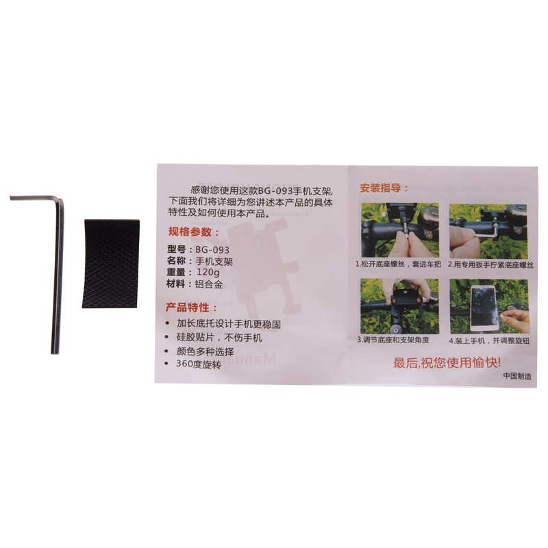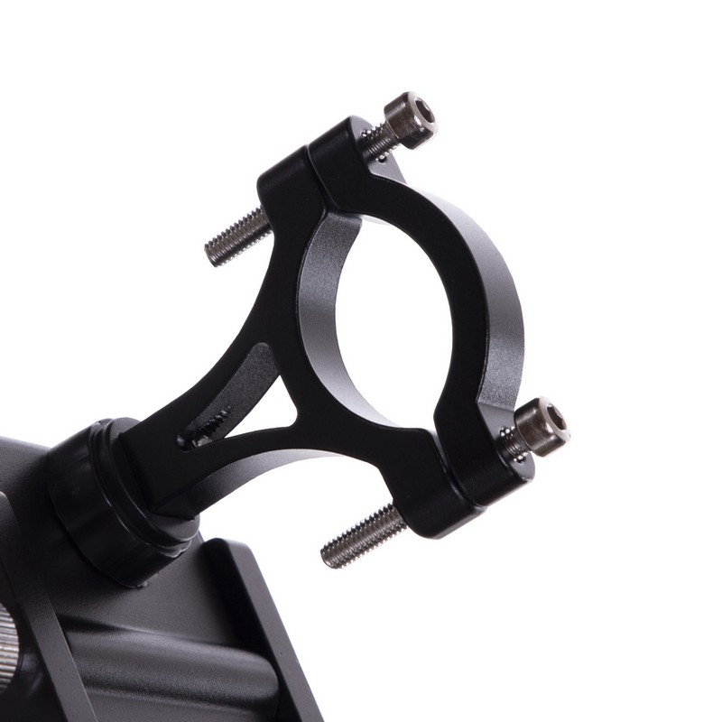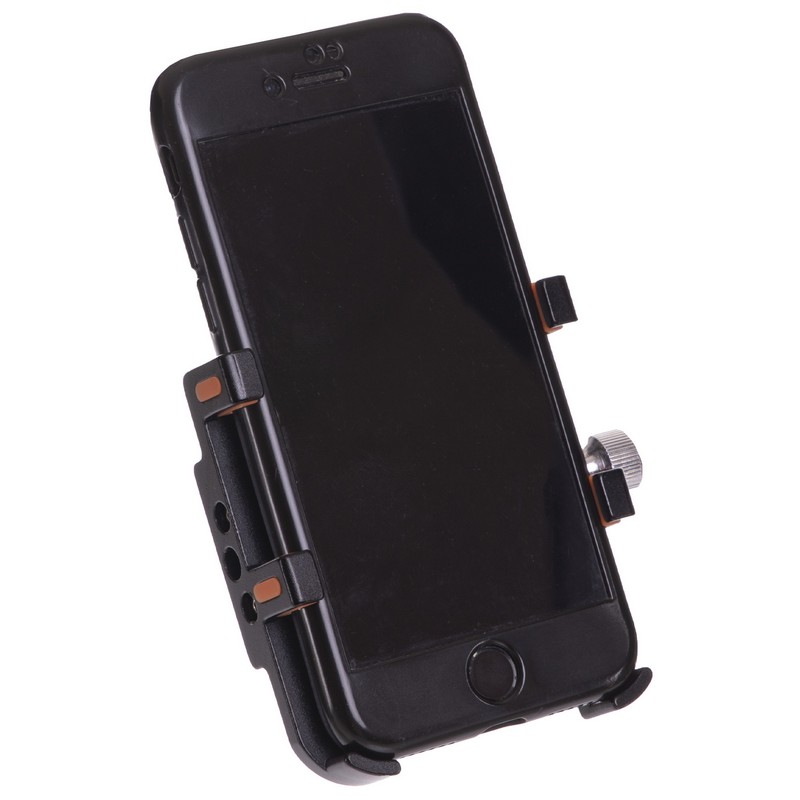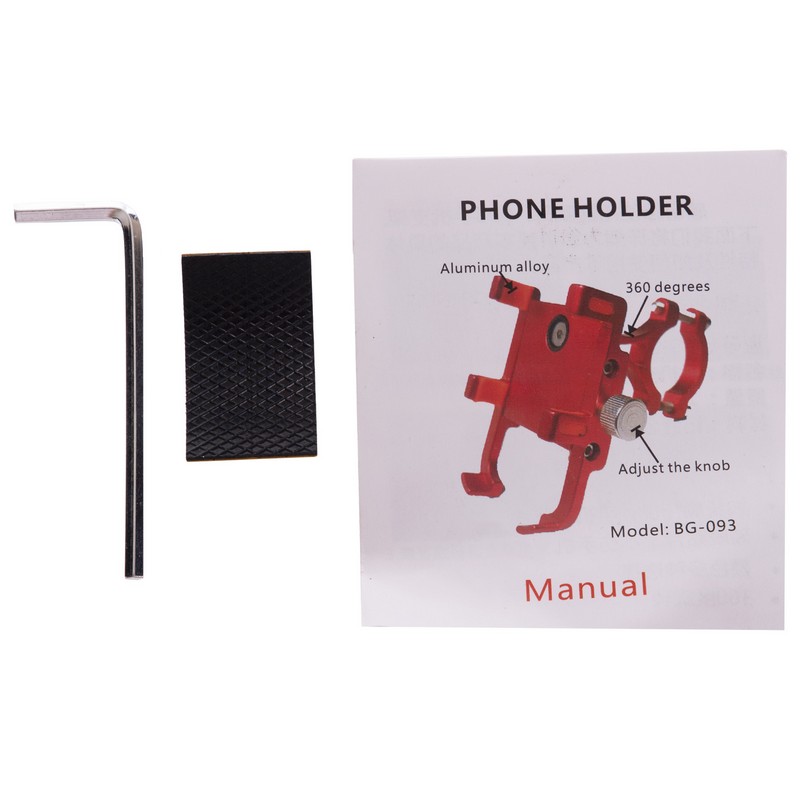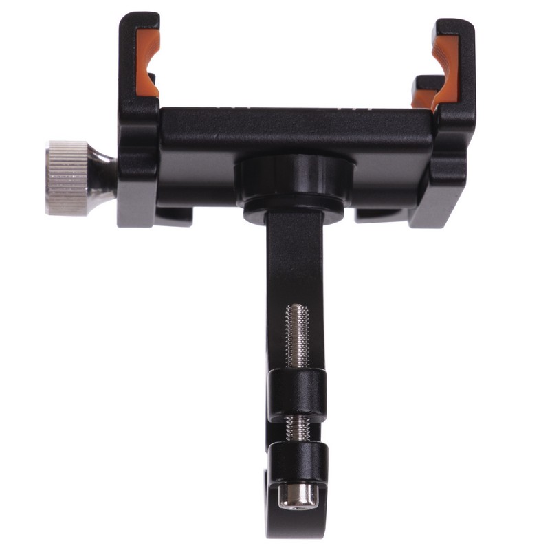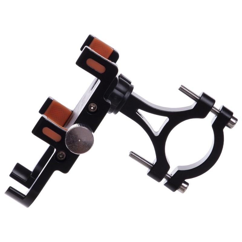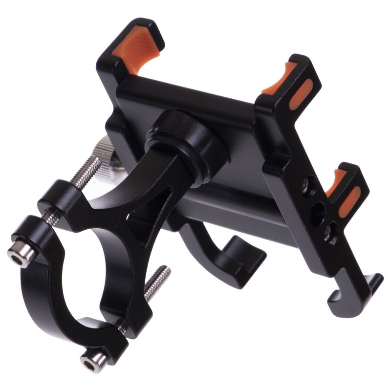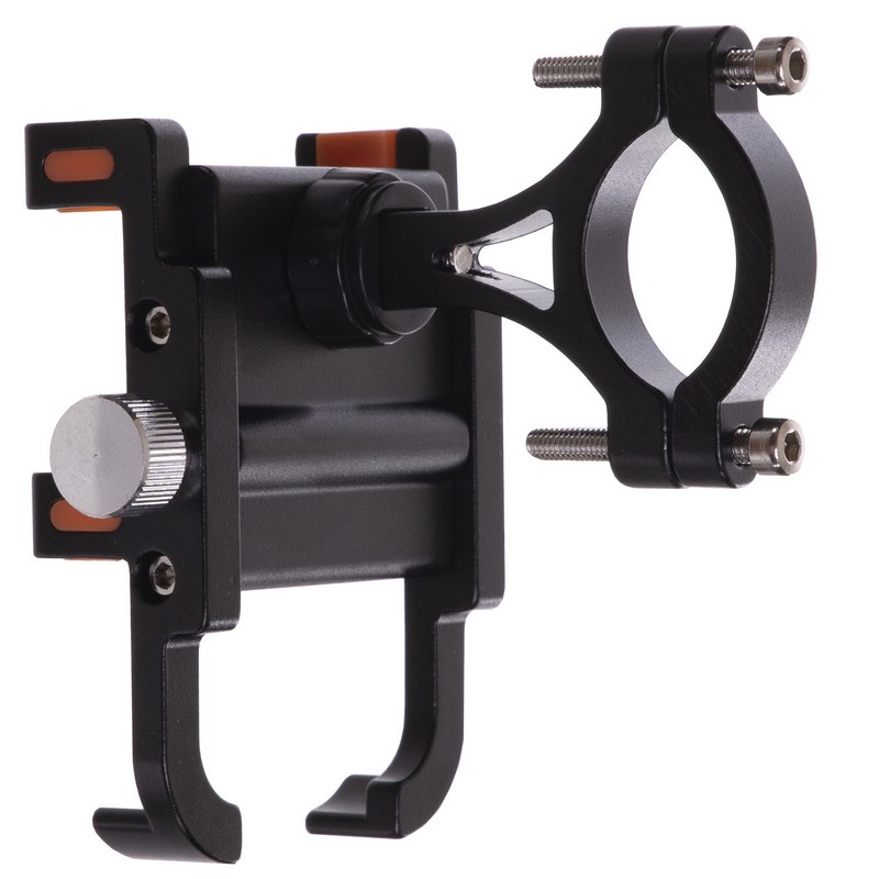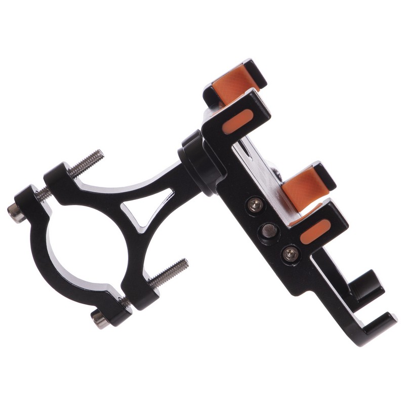 Раздвижная конструкция держателя изготовлена из алюминия и оборудована специальными нескользящими вставками, которые защищают телефон от вибрации и предотвращают его выпадение на участках с неровной трассой. В самом узком положении конструкция имеет ширину 50 мм, а в самом широком — 95 мм. Это позволяет зафиксировать смартфоны разного размера, в том числе и устройства в чехлах или противоударных бамперах. Установить держатель на руль позволяет винтовой зажим.