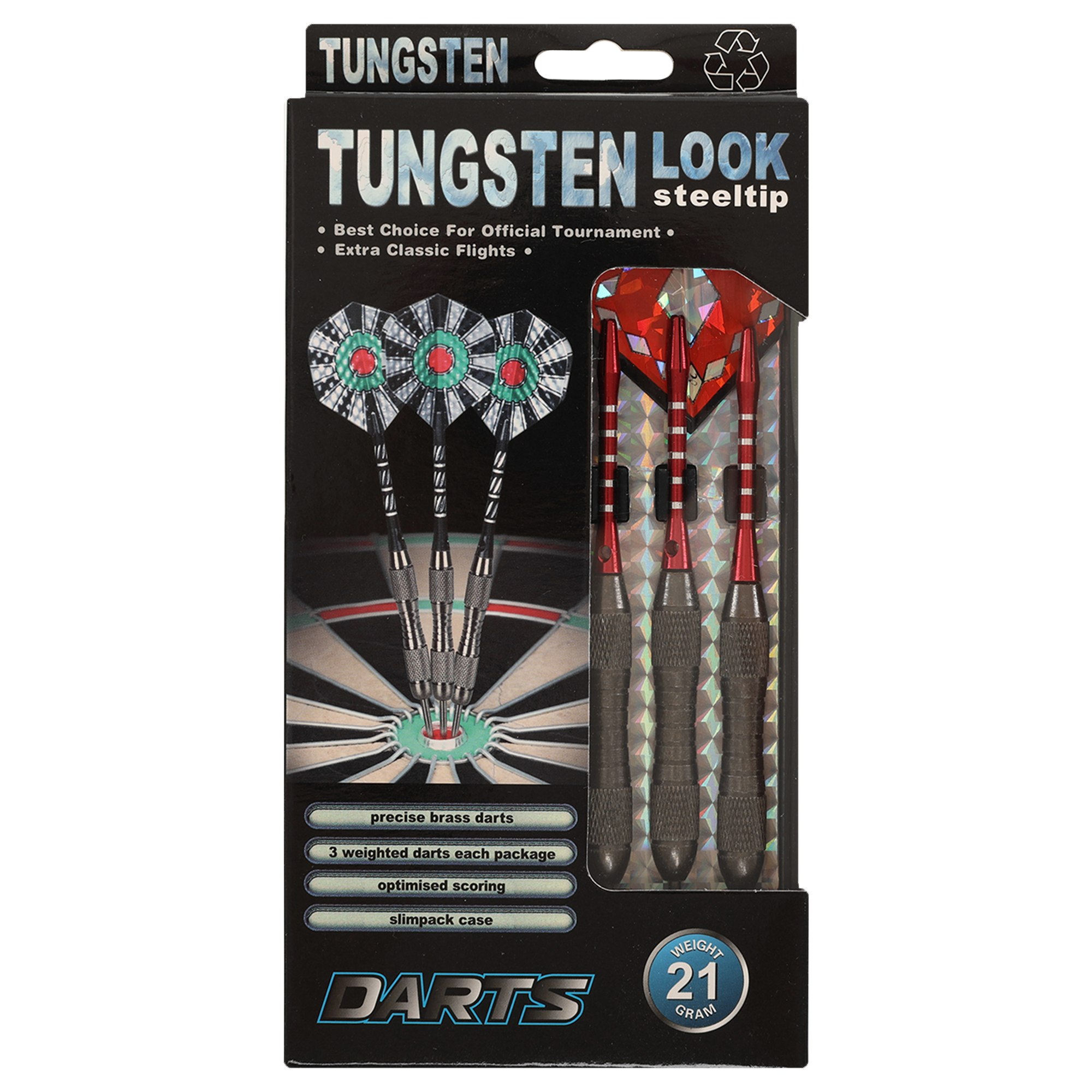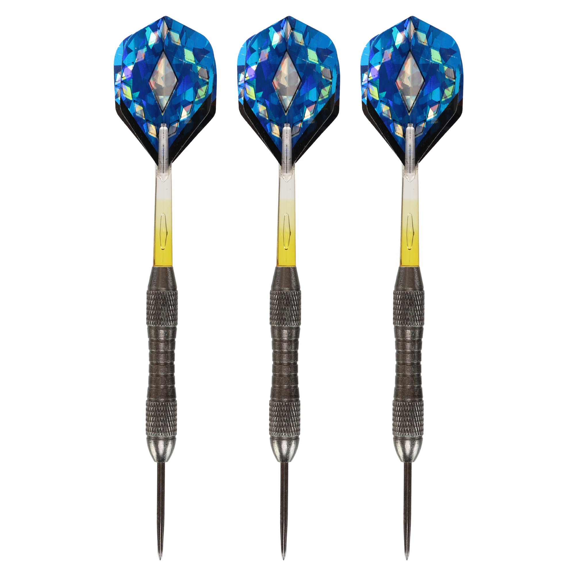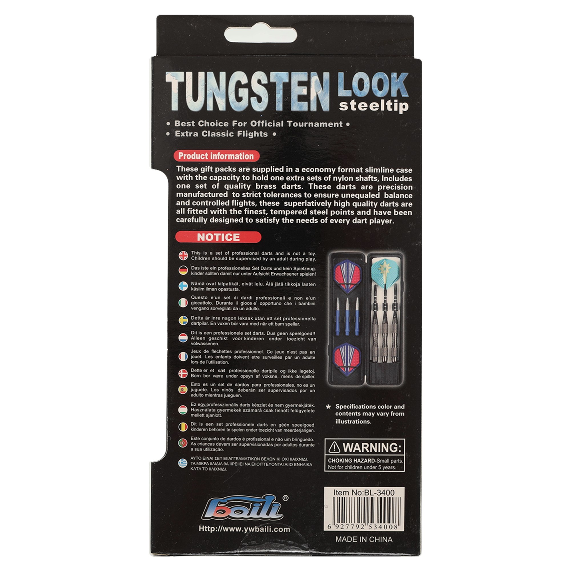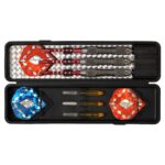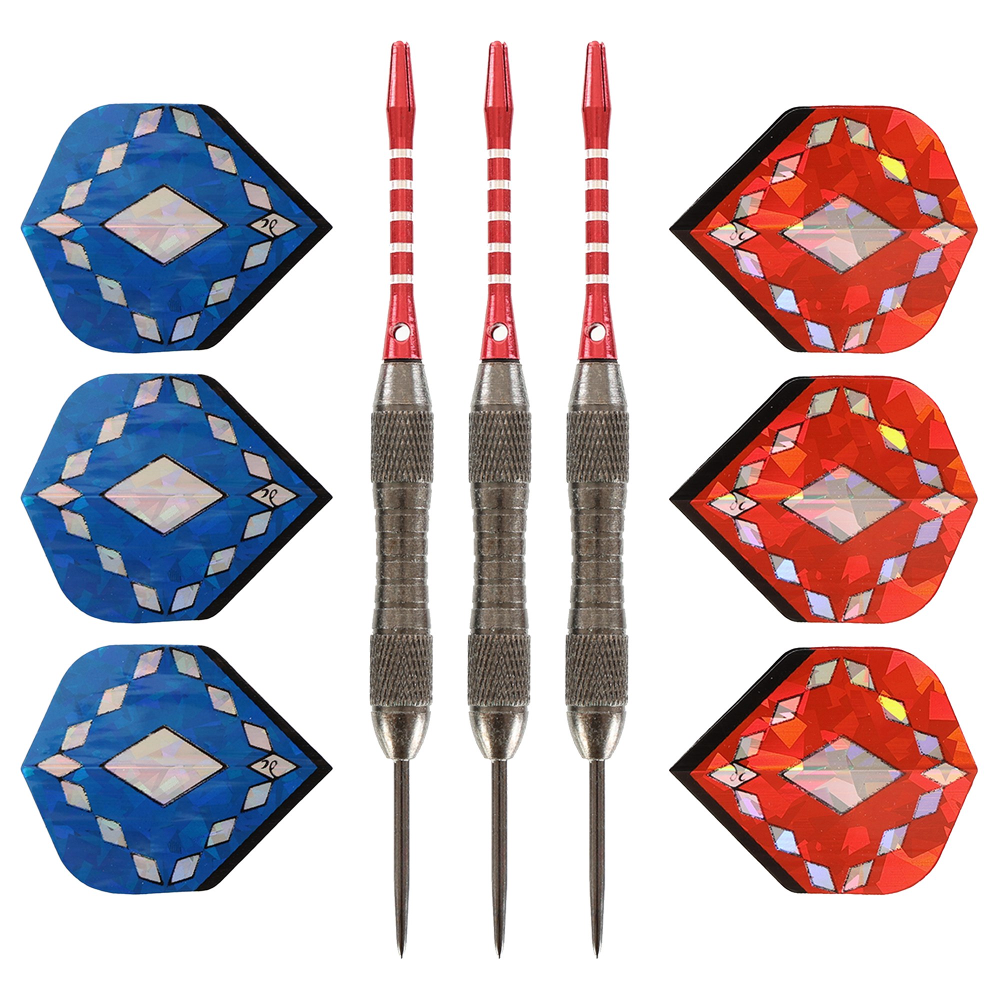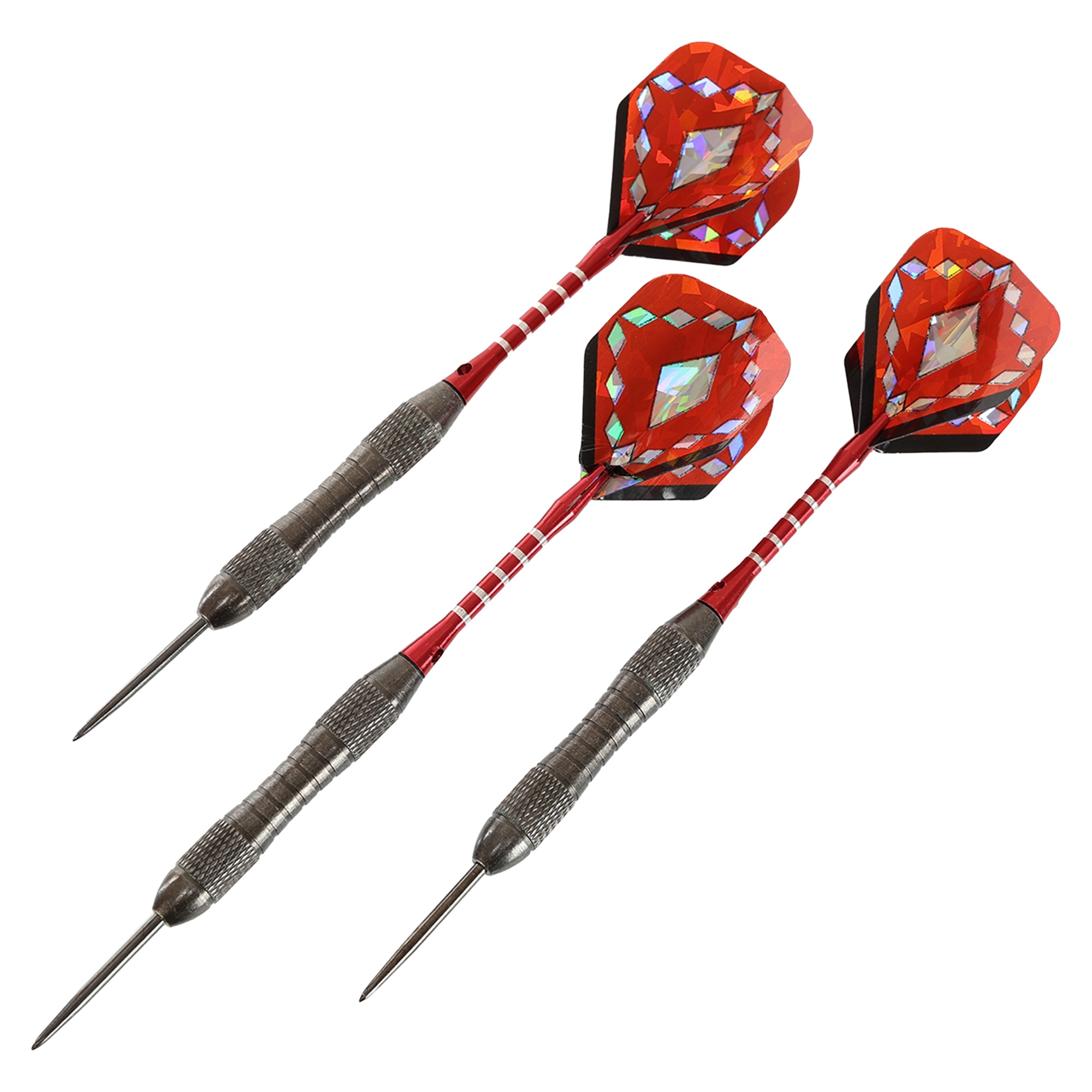 В набор входит три дротика с прочными иглами из стали, баррелями из вольфрама и хвостовиками из алюминия и пластика. Вольфрамовый баррель отличается долговечностью и устойчивостью к износу, а алюминиево-пластиковый хвостовик позволяет удерживать баланс при полете.