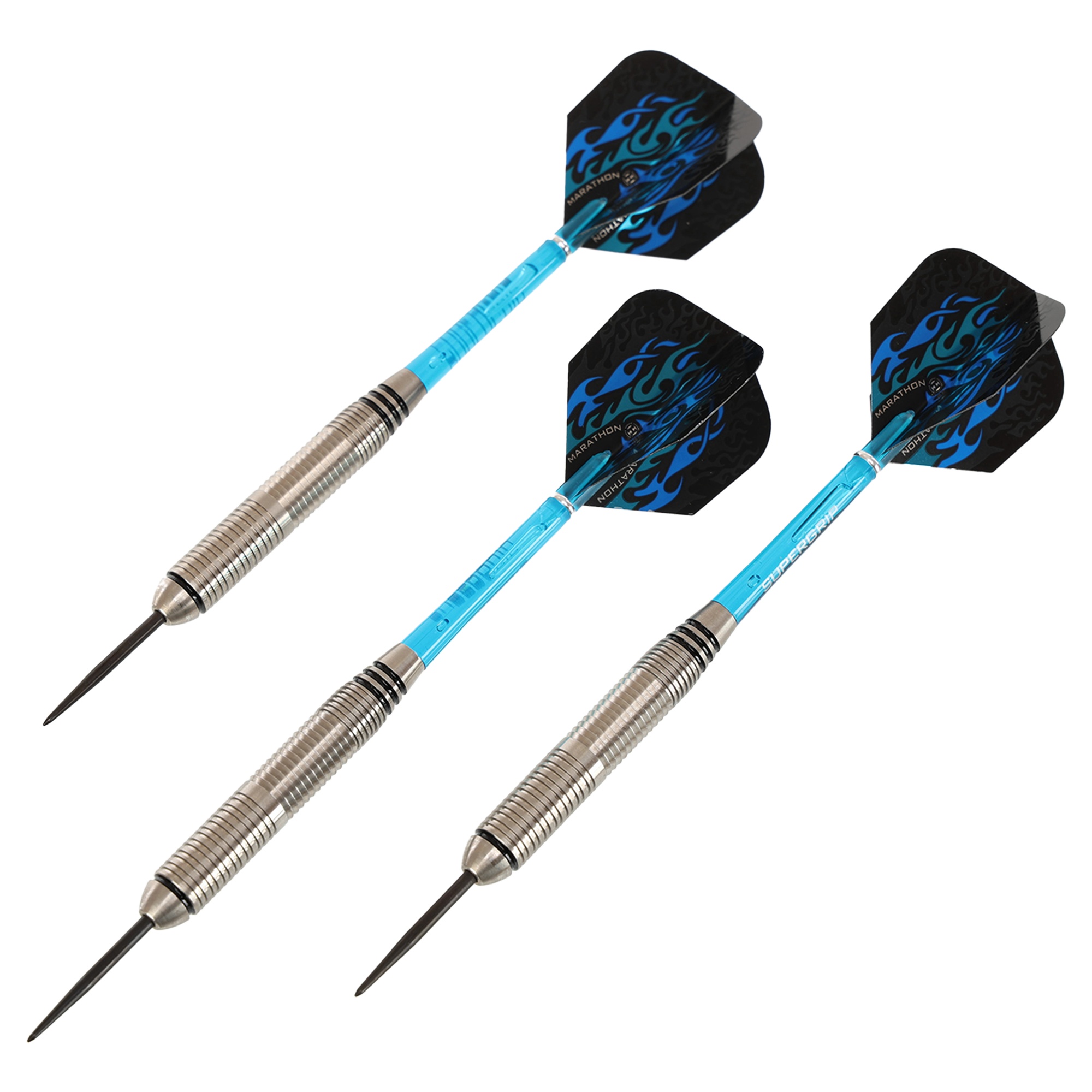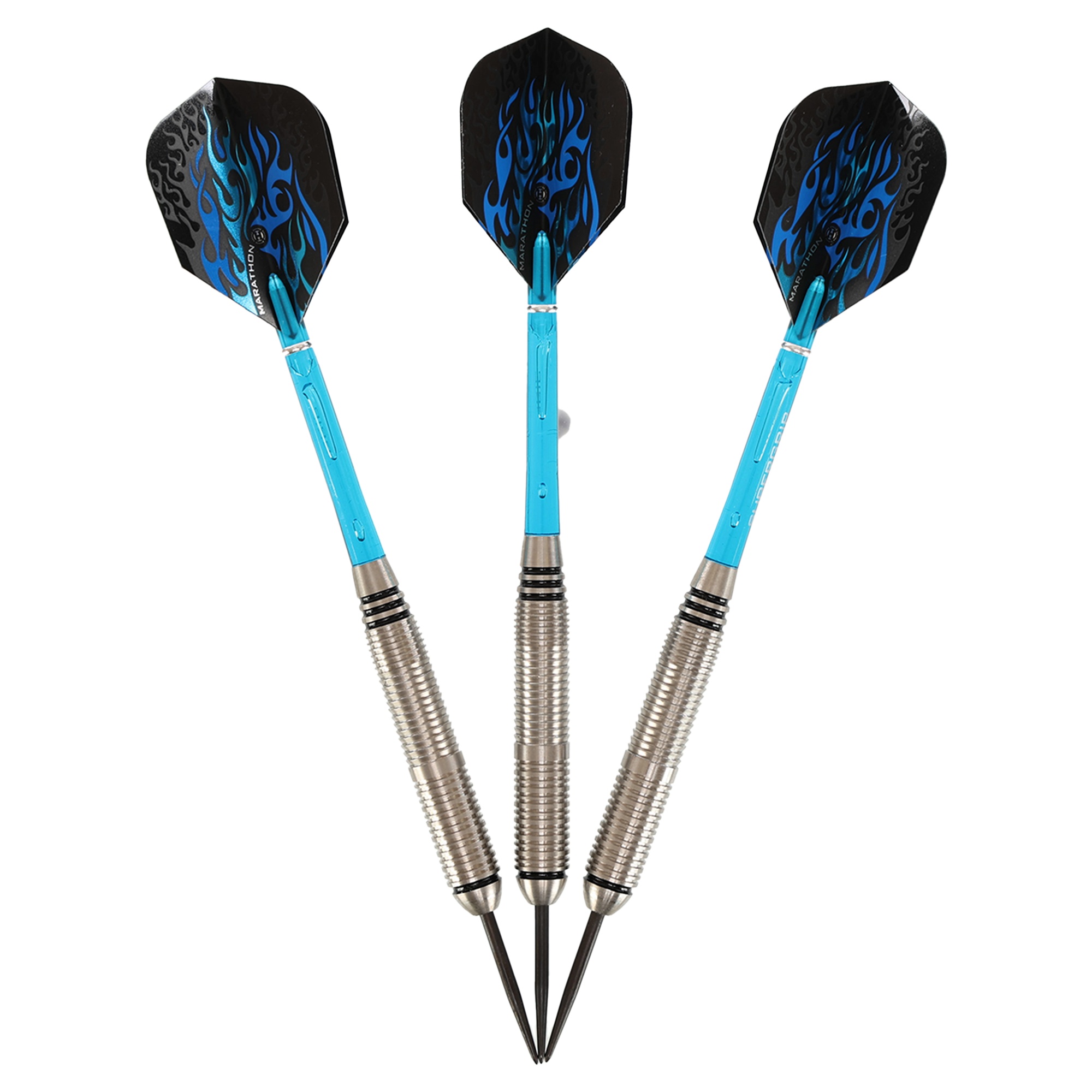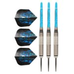 Хвостовики из прочного поликарбоната Supergrip Medium Aqua оснащены металлическими зажимными кольцами, которые надежно фиксируют оперение, предотвращая его смещение даже во время самых динамичных игр. Игла дротика изготовлена из прочной стали, обеспечивая долговечность и остроту для точного попадания в мишень, будь то картонная или сизалевая.