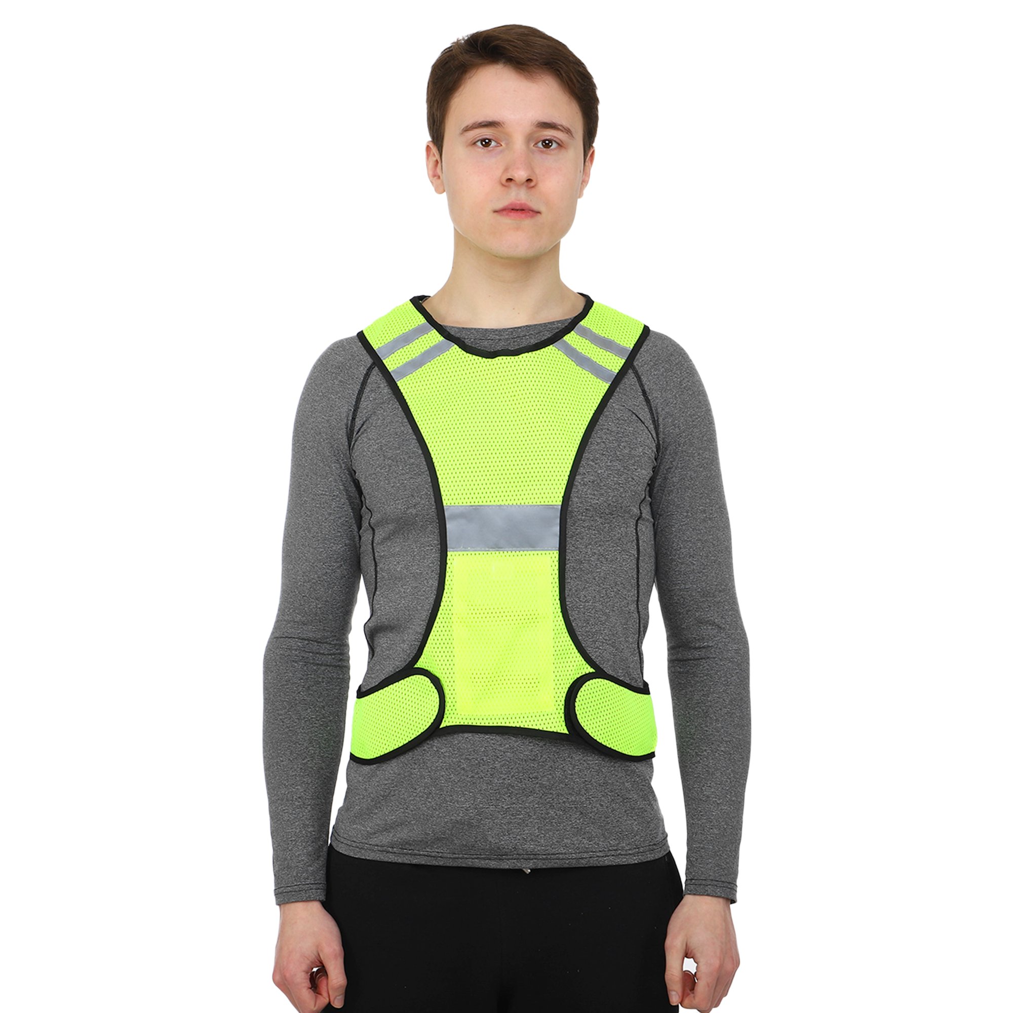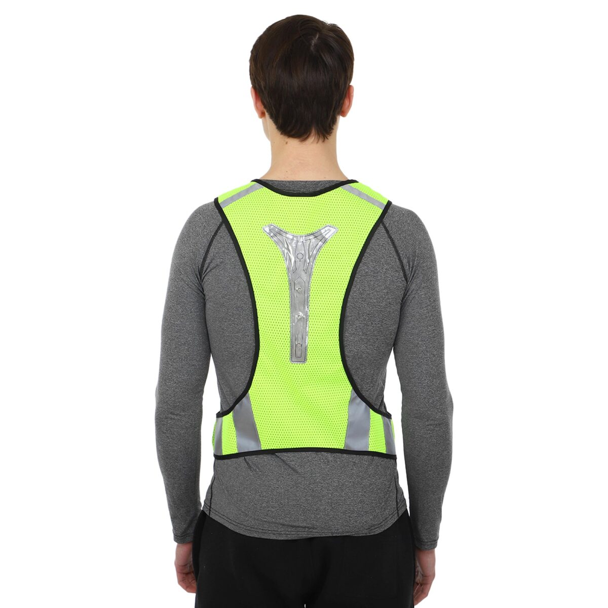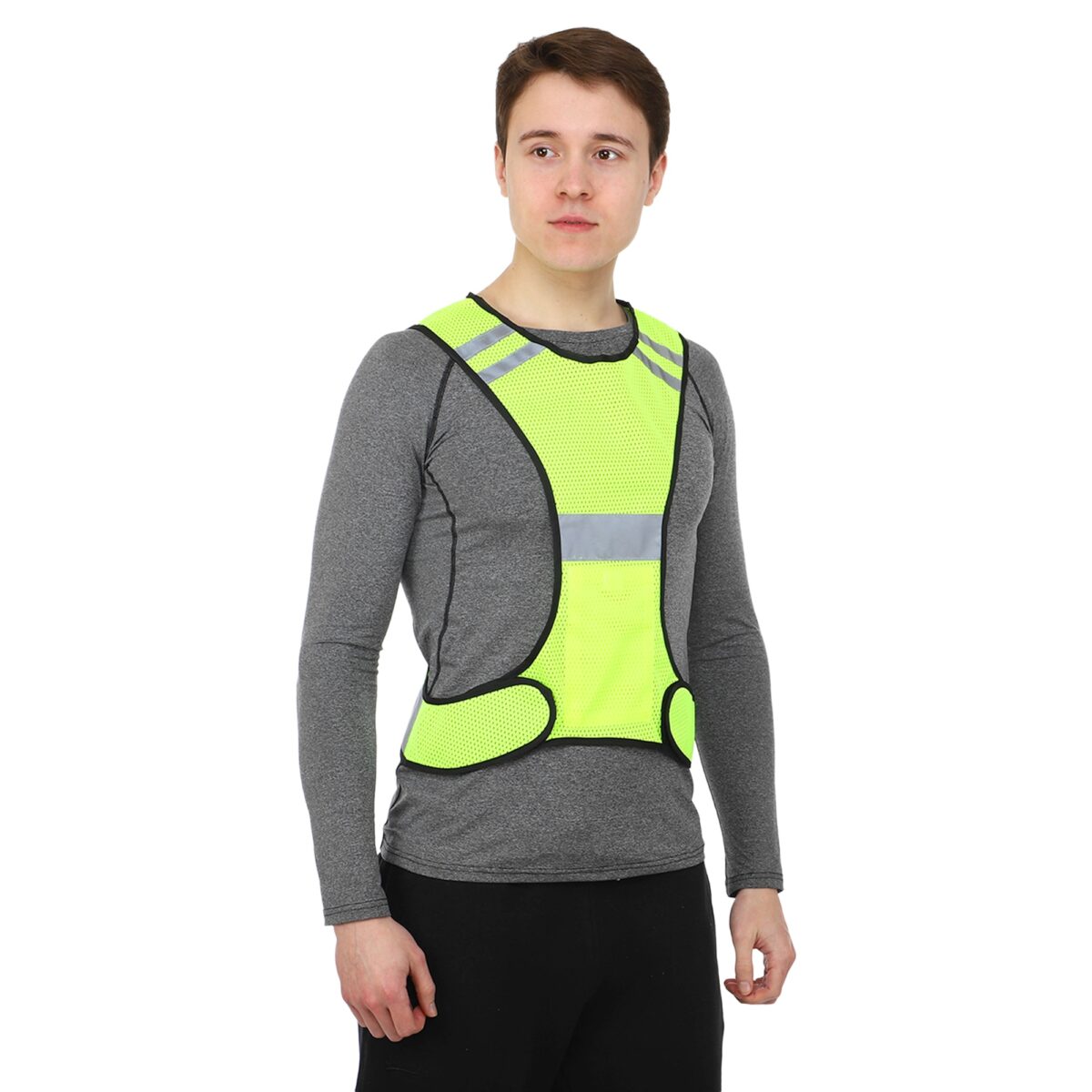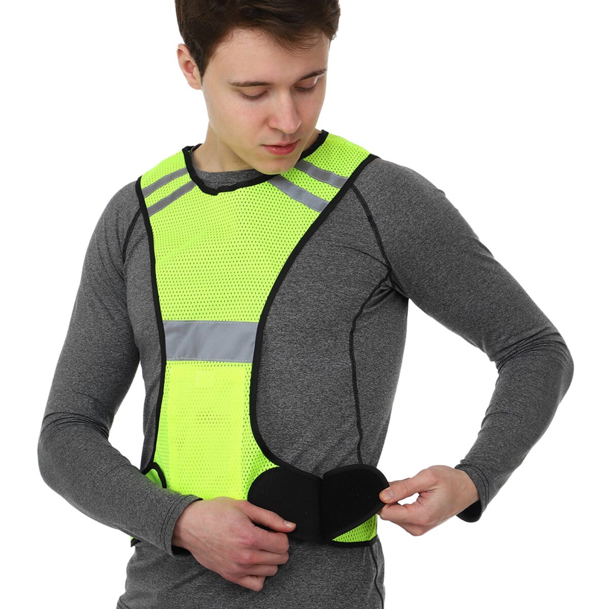 Светоотражающий жилет имеет универсальный размер и предназначен для тренировок на улице в темное время суток. На груди и спине на жилете расположены светоотражающие вставки. На спине расположены 3 светодиодные лампочки, которые работают от аккумулятора.