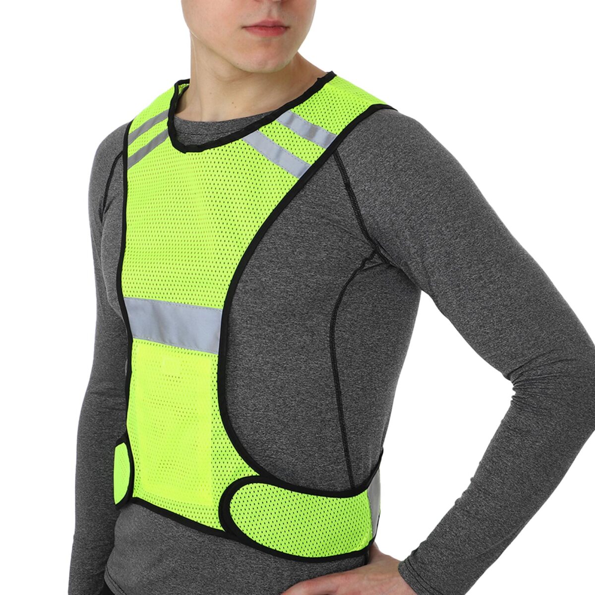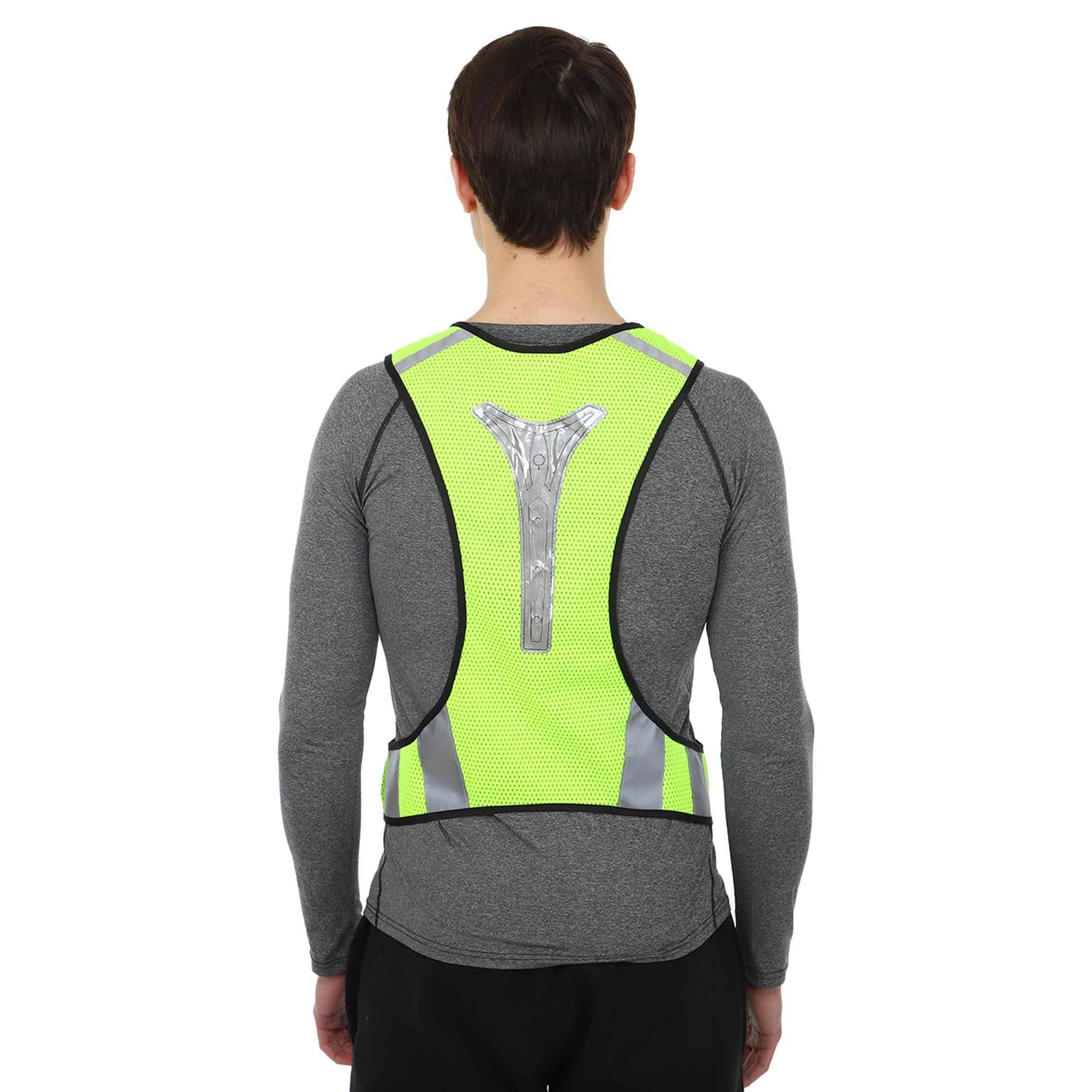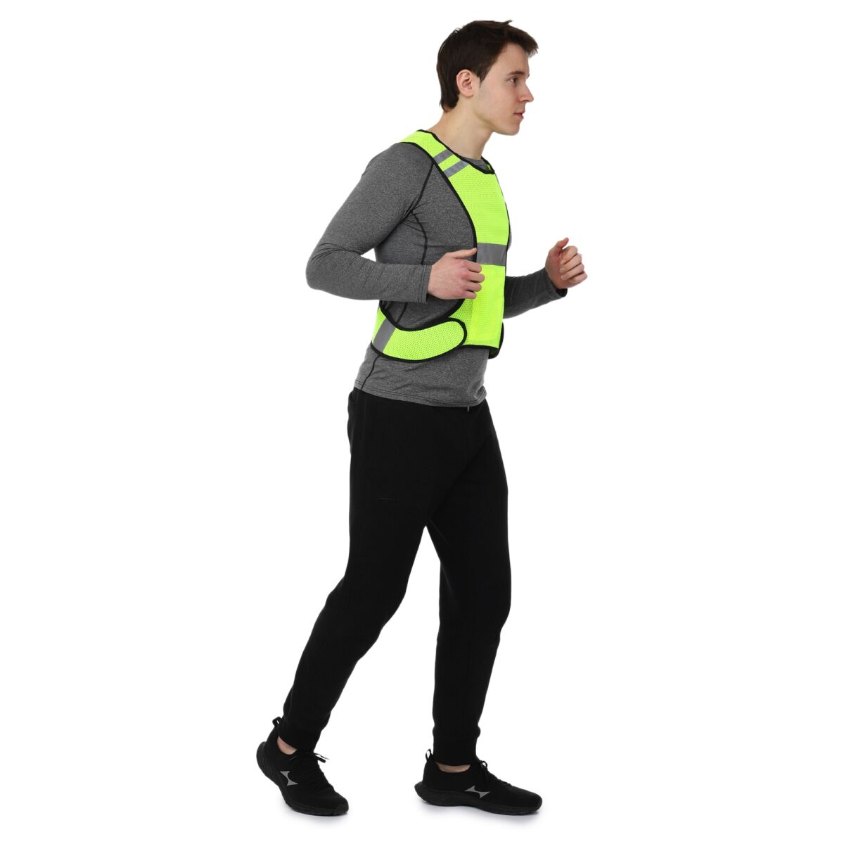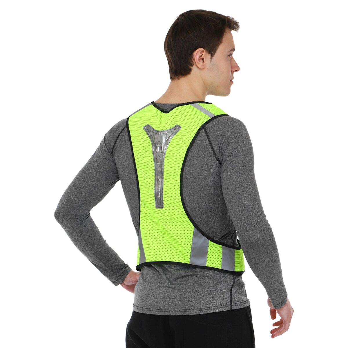 Светоотражающий жилет имеет универсальный размер и предназначен для тренировок на улице в темное время суток. На груди и спине на жилете расположены светоотражающие вставки. На спине расположены 3 светодиодные лампочки, которые работают от аккумулятора.