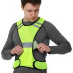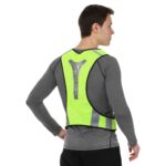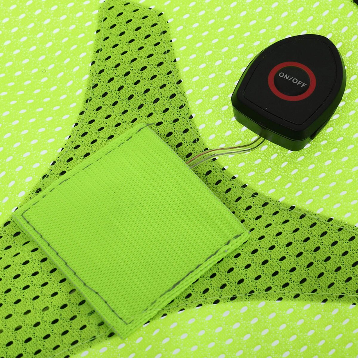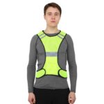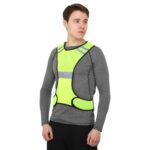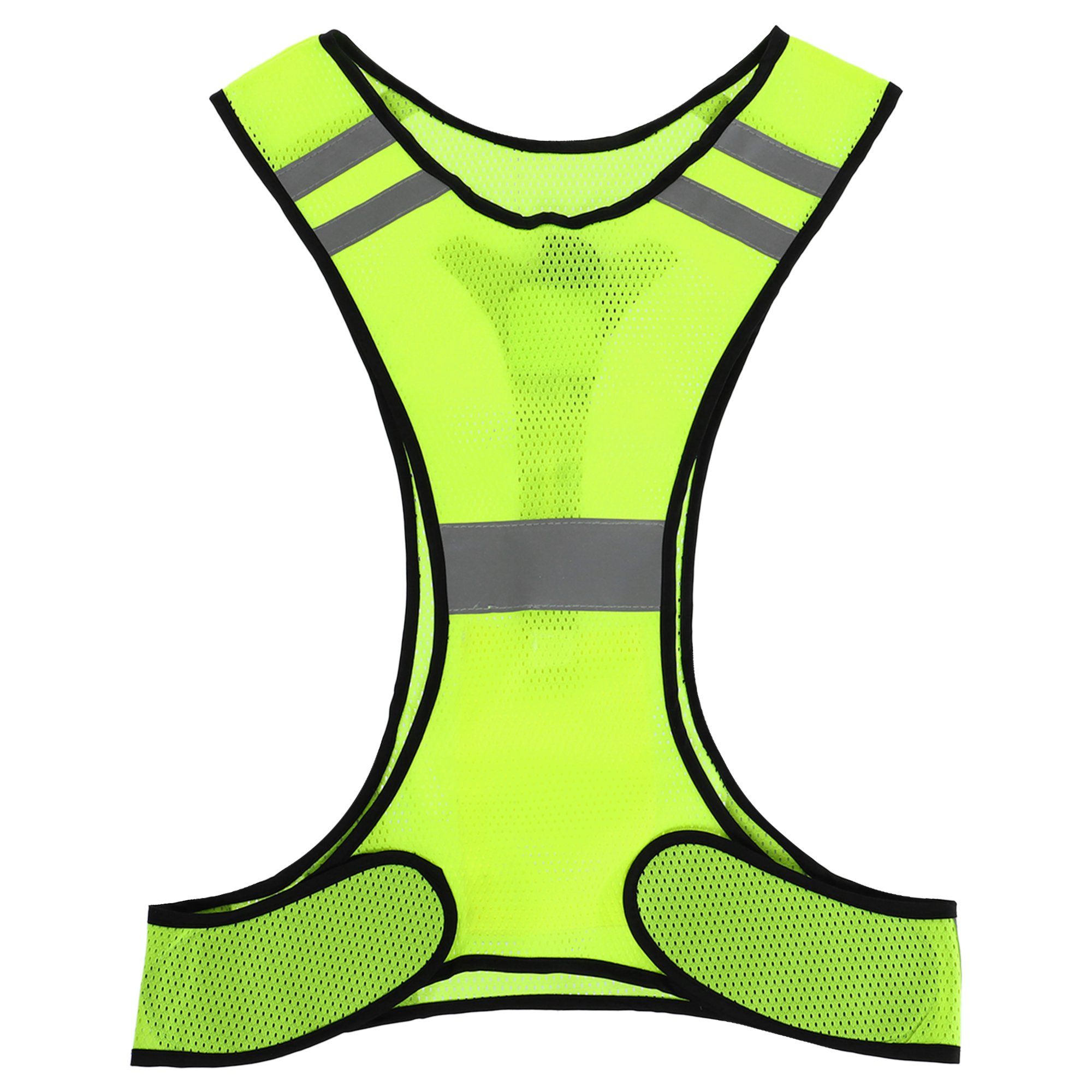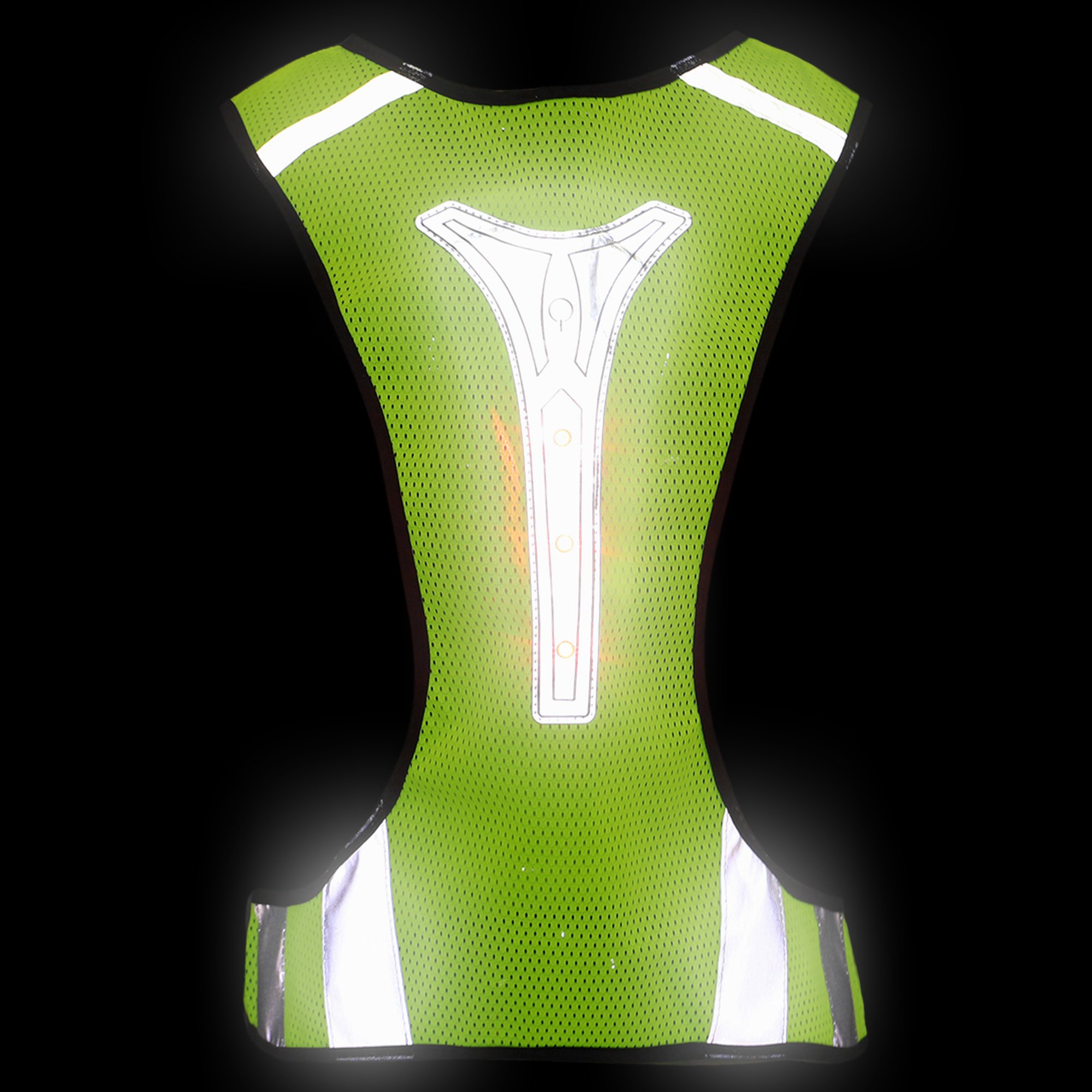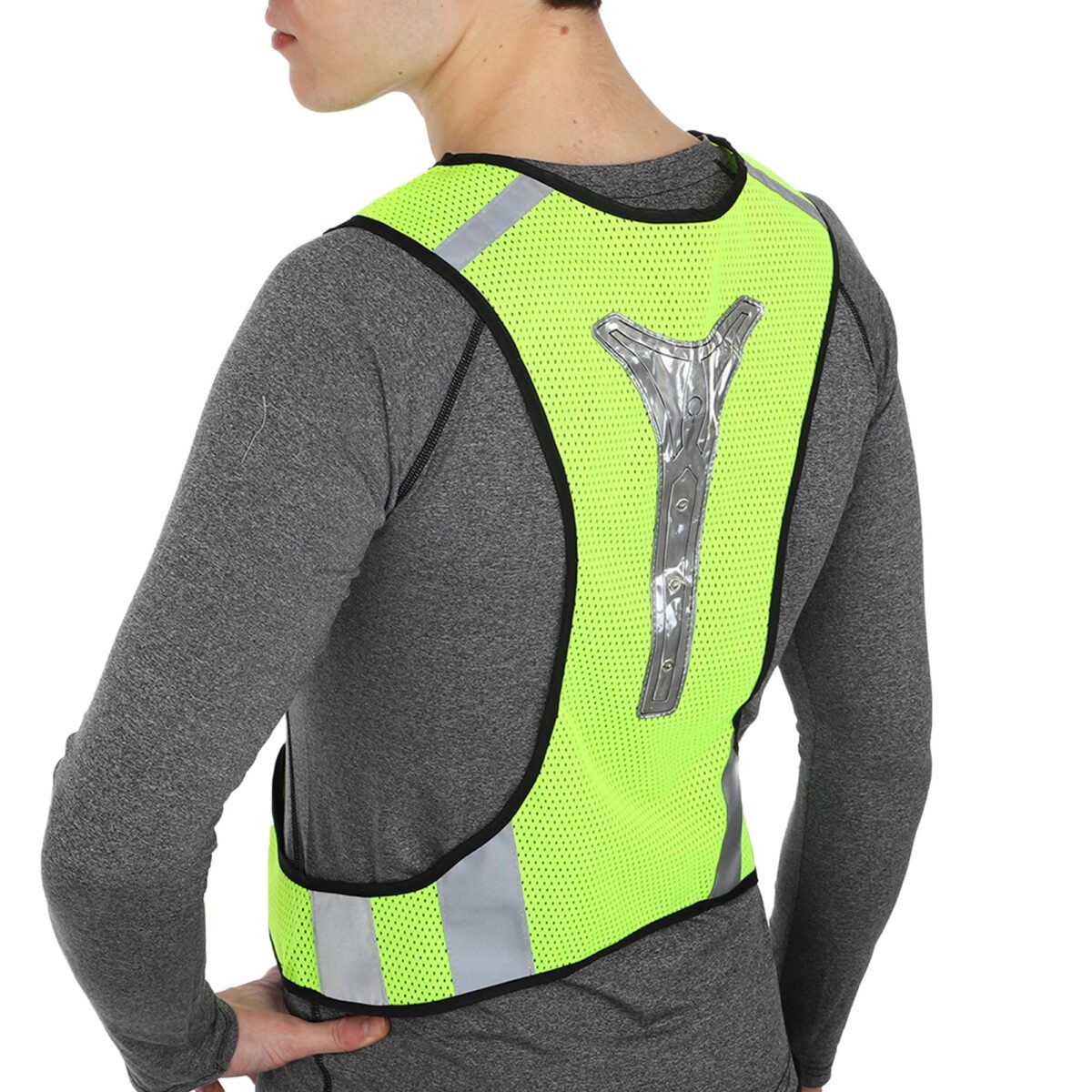 Светоотражающий жилет имеет универсальный размер и предназначен для тренировок на улице в темное время суток. На груди и спине на жилете расположены светоотражающие вставки. На спине расположены 3 светодиодные лампочки, которые работают от аккумулятора.