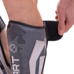 Защита изготовлена из прочного материала — полиуретана. На внутренней стороне мягкая подкладка, которая амортизирует удары. Аксессуар крепится к ноге с помощью ремешков на липучках.