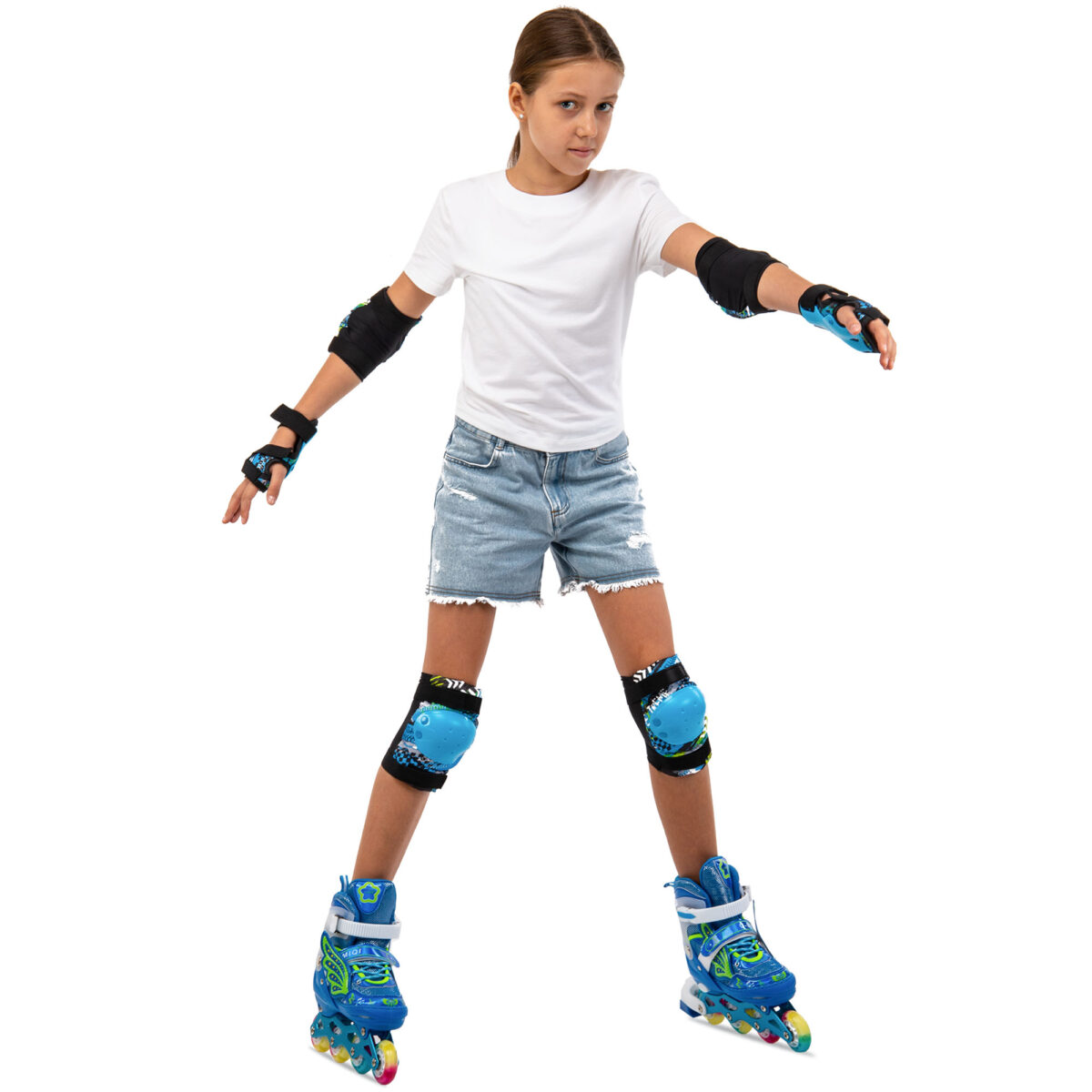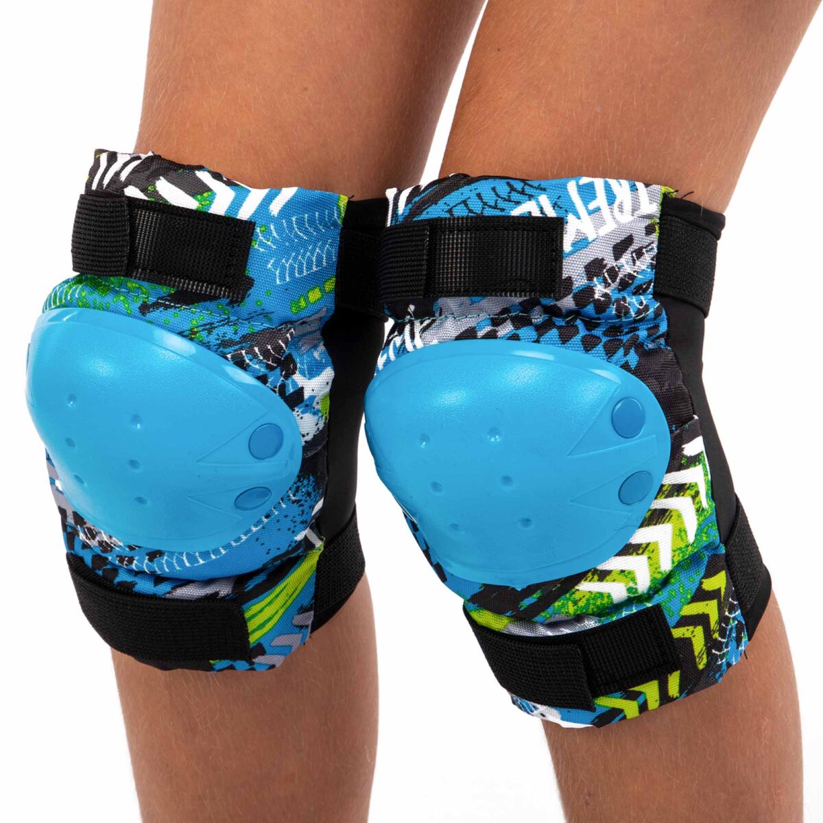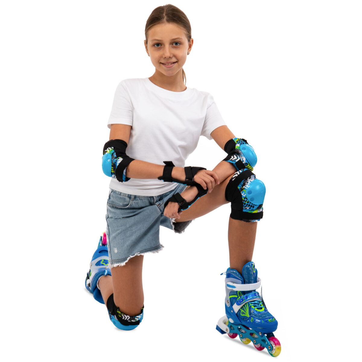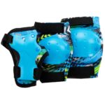 Комплект предназначен для защиты наиболее уязвимых частей тела – коленей, локтей и запястий – от ссадин, ушибов и других травм, которые могут возникнуть при падениях во время катания на роликовых коньках или скейтборде.