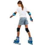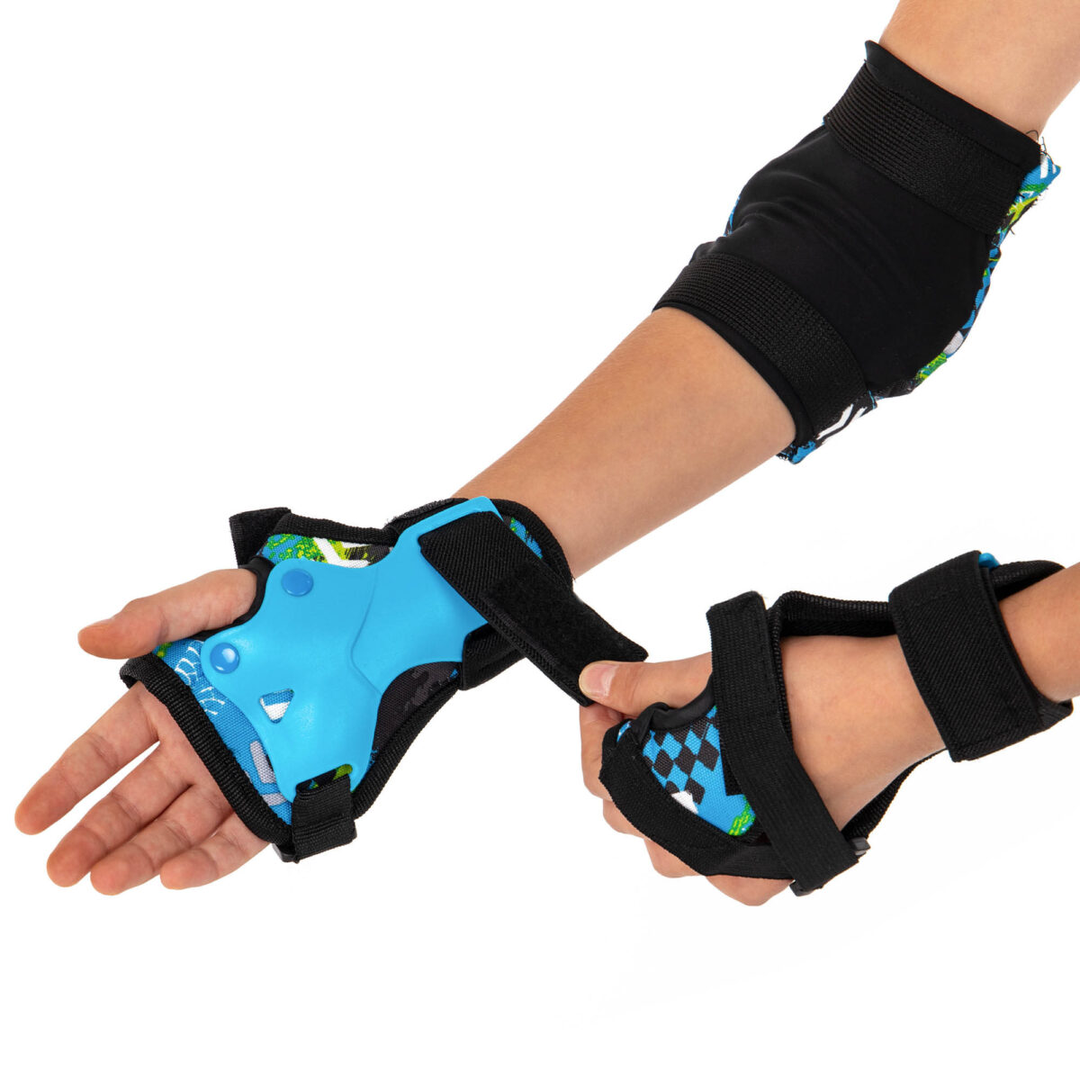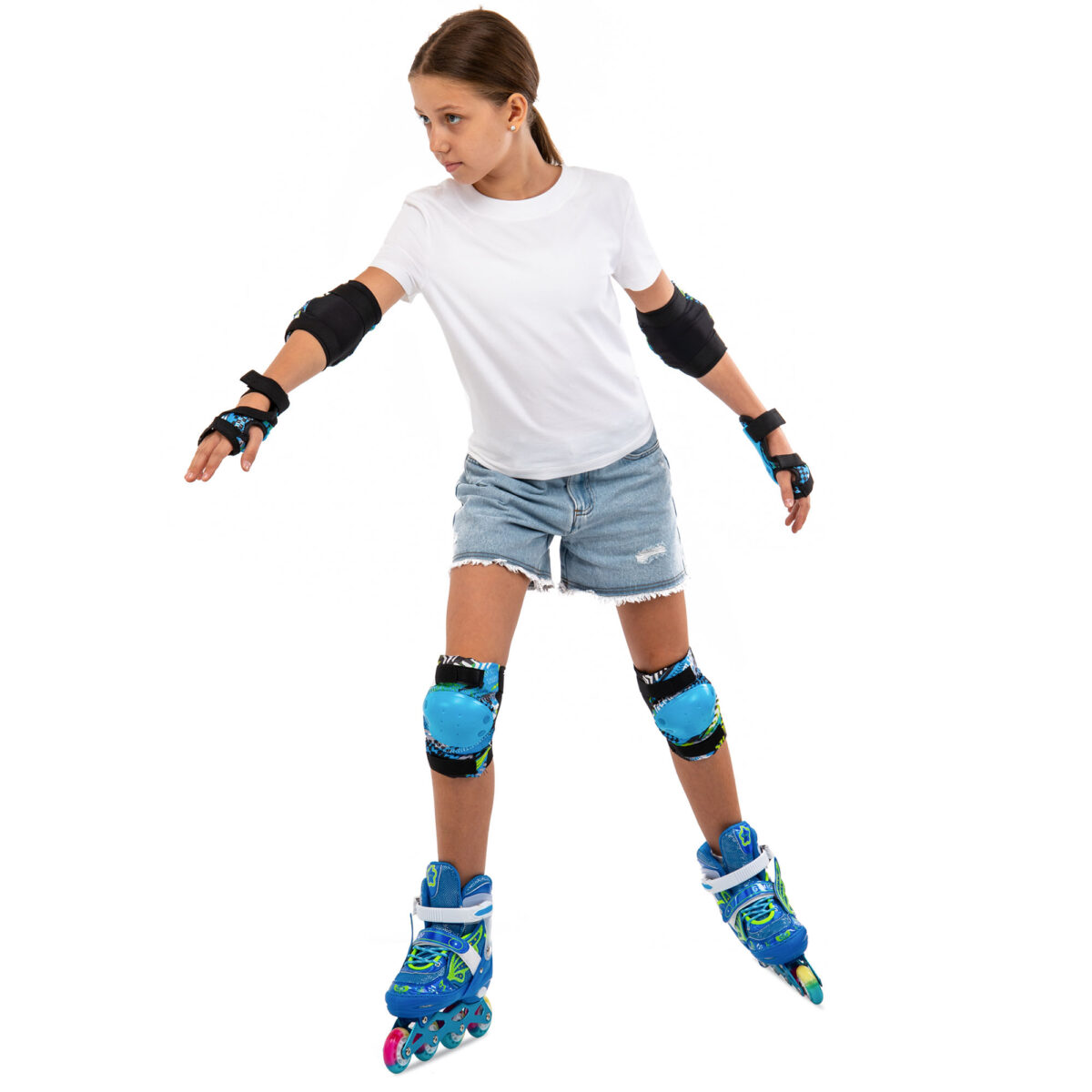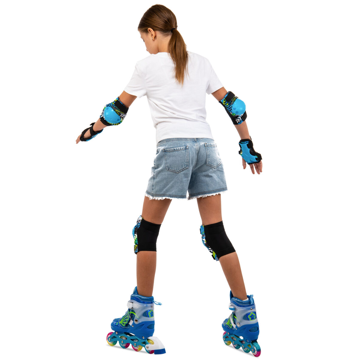 Комплект предназначен для защиты наиболее уязвимых частей тела – коленей, локтей и запястий – от ссадин, ушибов и других травм, которые могут возникнуть при падениях во время катания на роликовых коньках или скейтборде.
