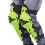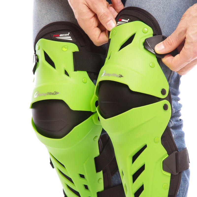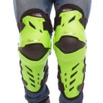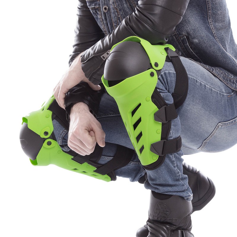 Экипировка для защиты ног в случае падения с мотоцикла изготовлена из прочного пластика. Аксессуар защищает колени и голени.