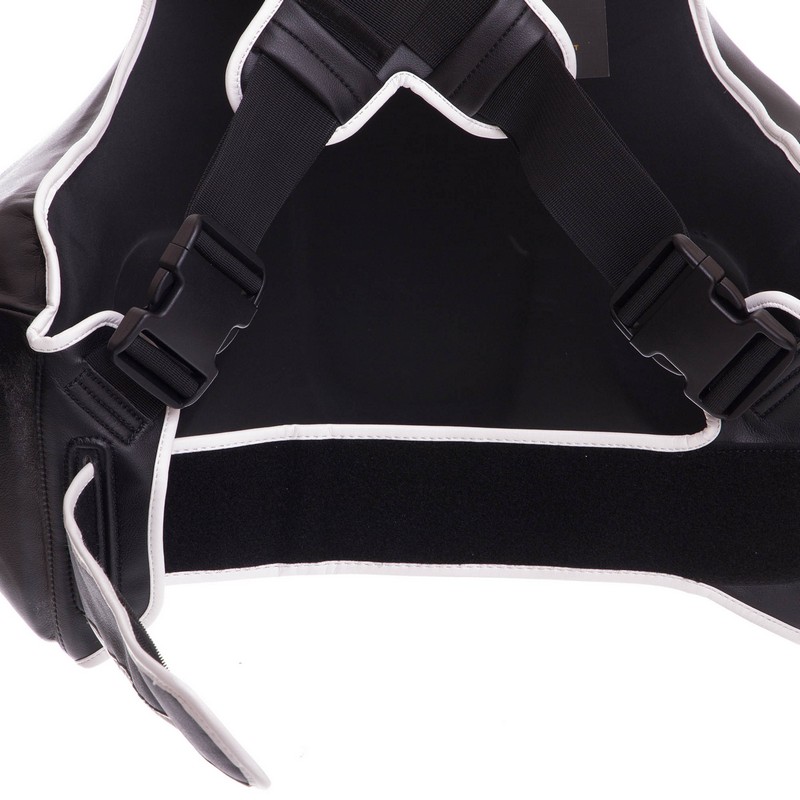 Защита корпуса в виде жилета выкроена так, чтобы прикрывать наиболее уязвимые области корпуса: живот, грудную клетку и подреберье по бокам. Такая концентрация материала не сковывает движения тренера/спаринг-партнера, позволяет уворачиваться от ударов бойца и имитировать реальный бой.