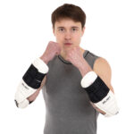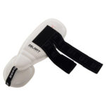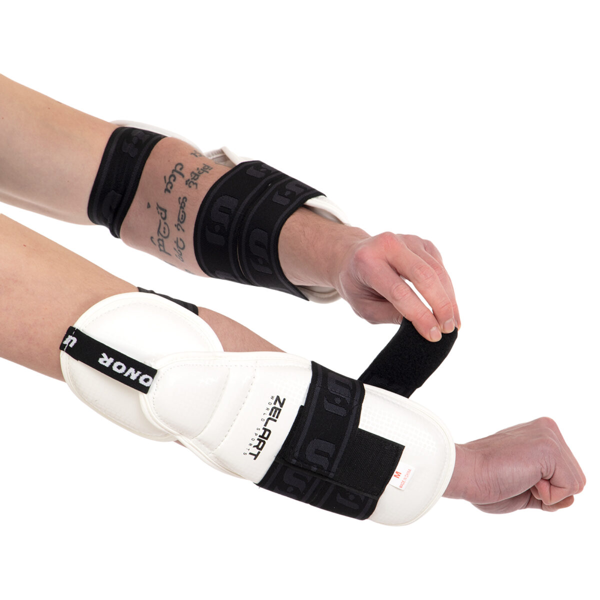 Для фиксации предусмотрены три эластичных ленты. Средняя пришита с обеих сторон к краям щитка и не дает ему сползти, пока вы застегиваете на липучки две крайние резинки. Такие застежки максимально удобны, в отличие от шнуровки, например, их можно застегнуть самостоятельно. Изделие выполнено из износостойкого и легкого полиуретана, он не рвется, но и не утяжеляет руки бойца.