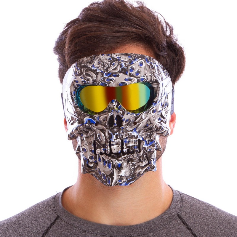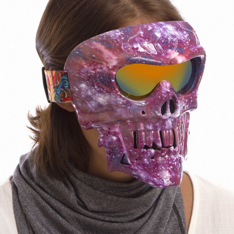 Маска изготовлена в виде черепа. Она закрывает глаза, рот и нос.