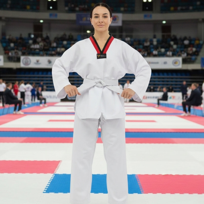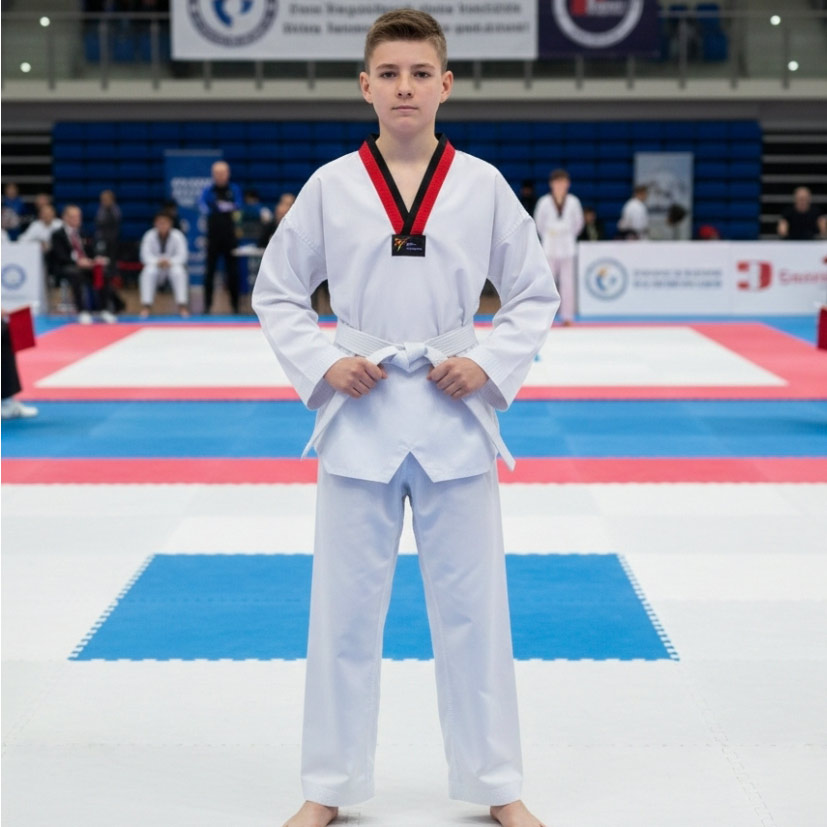 Кимоно для тхэквондо — это традиционная спортивная форма, которая состоит из куртки (добок), брюк и пояса. Она играет важную роль не только как экипировка, но и как символ дисциплины, уважения и духа боевых искусств. Добок разработан так, чтобы обеспечивать свободу движений, способствуя выполнению сложных технических элементов и динамичных ударов, которые характерны для тхэквондо. Брюки дополнены эластичной резинкой на талии, что гарантирует удобную посадку и фиксацию даже при активных тренировках.