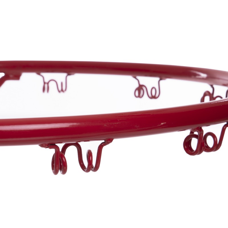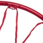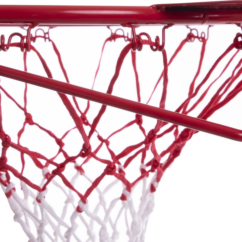 Баскетбольная корзина фиксируется на четыре точки крепления к баскетбольному щитку и комплектуется сеткой из нейлона. Двухцветная сетка выполнена в красном и белом цветах и легко фиксируется на специальные крепления, предусмотренные в конструкции кольца. Кольцо имеет диаметр 46 см и выполнено из трубы диаметром 12 мм. Оно окрашено в красный цвет и надёжно защищено от воздействия влаги и появления коррозии. Это расширяет сферу применения данного спортивного инвентаря. Кольцо, изготовленное из металлической трубы, обладает большим запасом прочности и подходит для тренировок с взрослым мячом 7 размера.