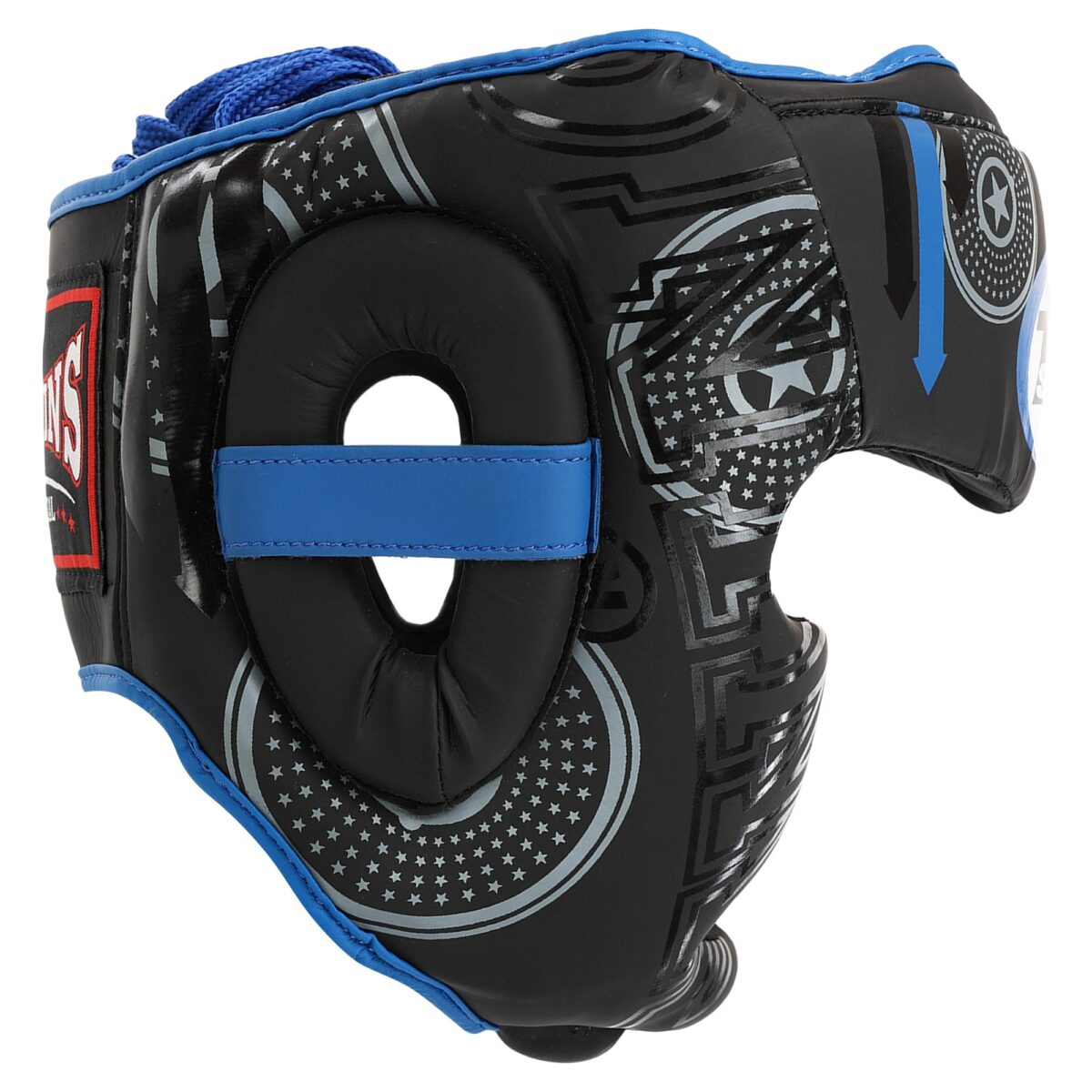 Шлем закрывает не только голову, но и скулы, ушные раковины и подбородок. Это позволяет защититься от ударов сбоку и снизу. Конструкция надежно фиксируется с помощью ремней на липучках, которые регулируются для наиболее точной подгонки под индивидуальные параметры головы. Шлем не смещается во время боя и оставляет спортсмену максимальный обзор.