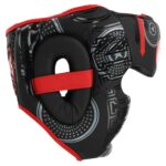 Шлем закрывает не только голову, но и скулы, ушные раковины и подбородок. Это позволяет защититься от ударов сбоку и снизу. Конструкция надежно фиксируется с помощью ремней на липучках, которые регулируются для наиболее точной подгонки под индивидуальные параметры головы. Шлем не смещается во время боя и оставляет спортсмену максимальный обзор.