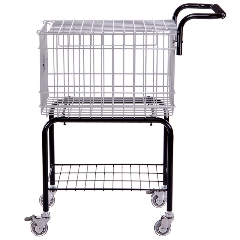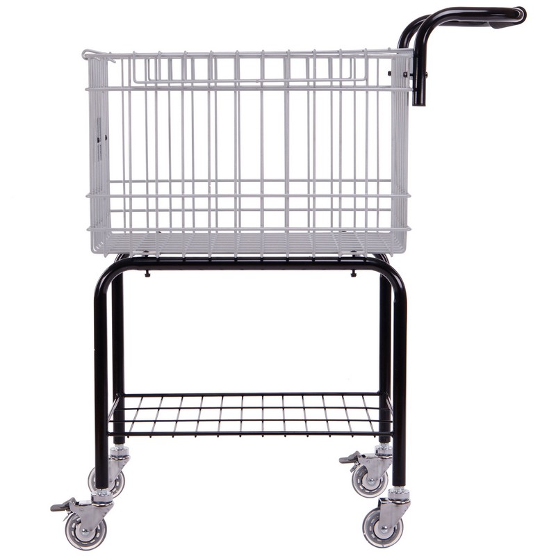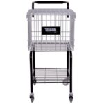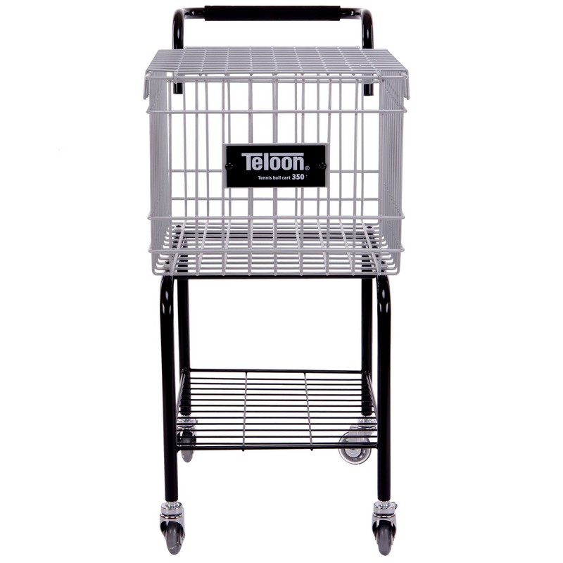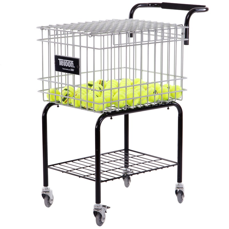 Большая металлическая корзина для теннисного инвентаря TELOON — удобный способ хранить и транспортировать мячи и ракетки. Конструкция состоит из большой, закрывающейся корзины и полки для ракеток. Удобная ручка покрыта мягким приятным на ощупь материалом, она не скользит в руках и не нагревается на солнце как металлические. Стойки оборудованы прочными полиуретановыми колесами с двумя стопами. Это позволяет с легкостью передвигать нагруженную тележку и фиксировать ее в одном положении даже на покрытии с уклоном. Корзина имеет цвет металлик, ручка, стойки и полка — черные. Спереди расположен логотип бренда.