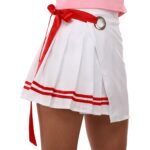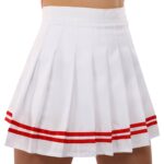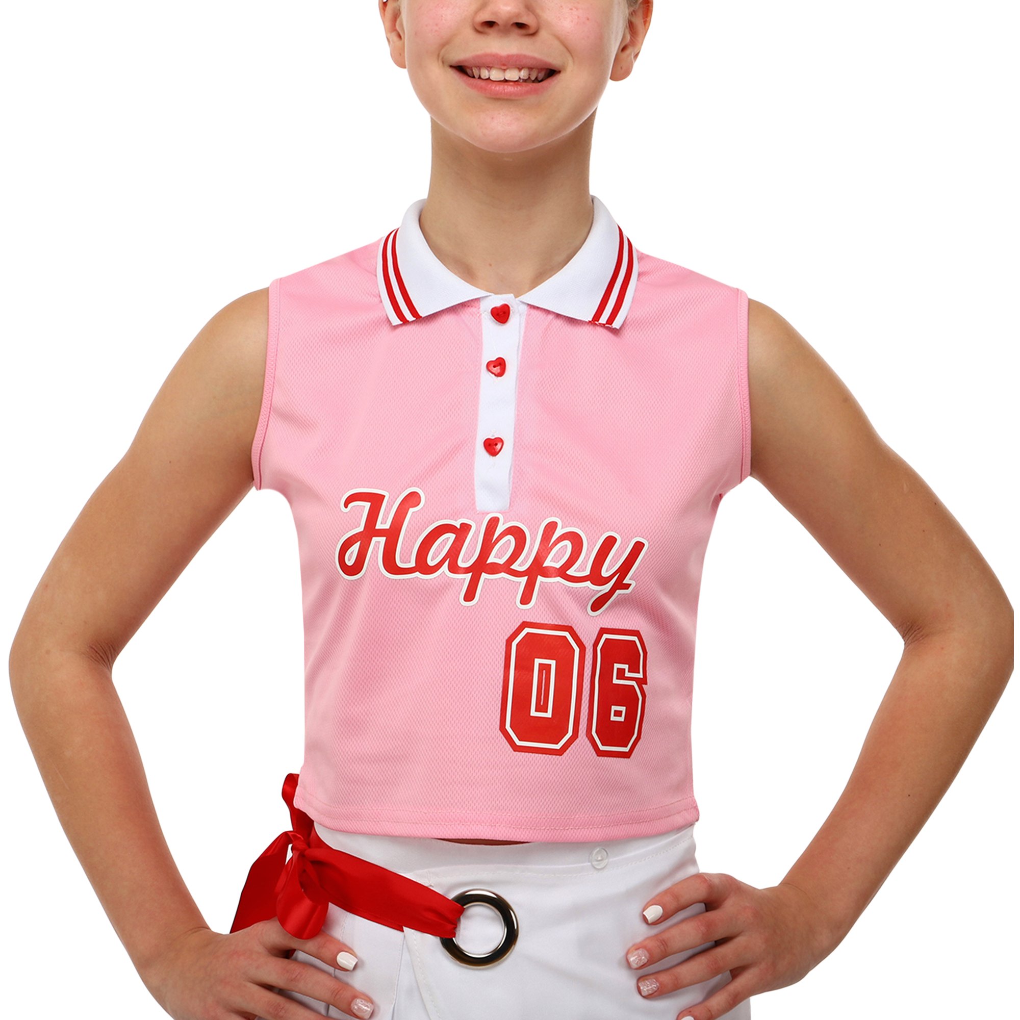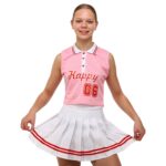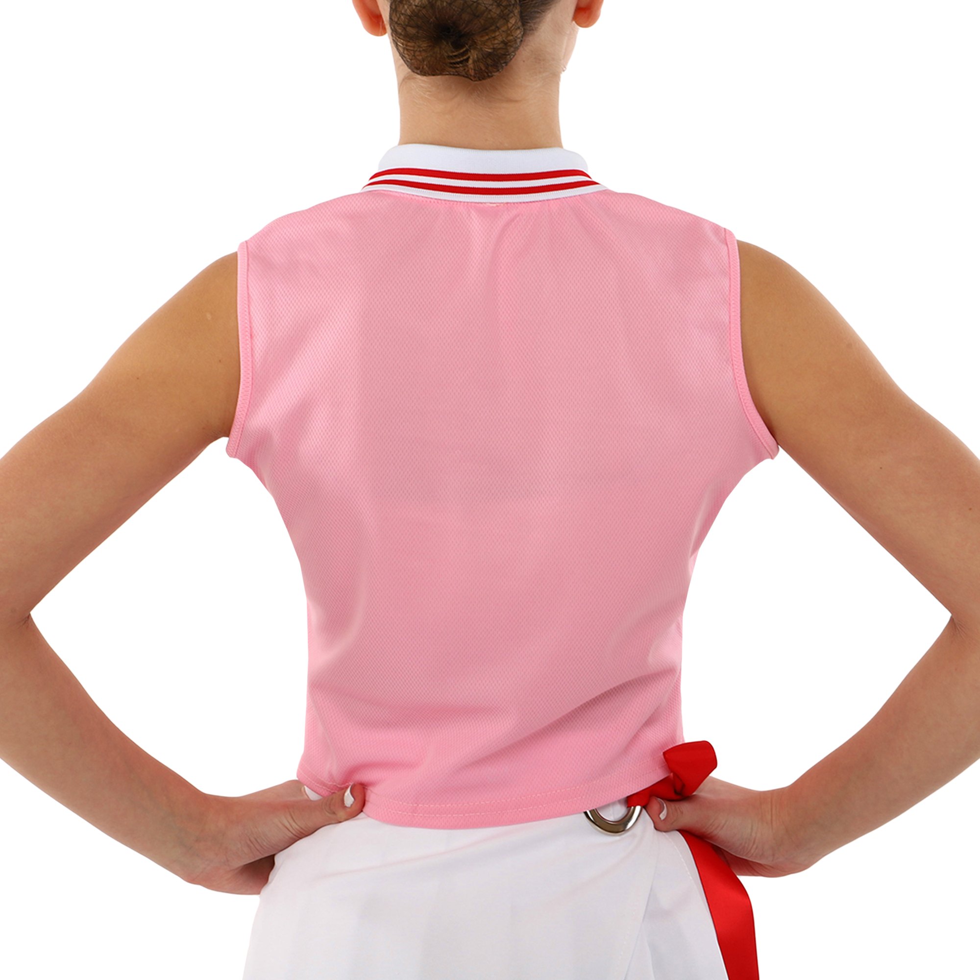 Топ без рукавов имеет воротник и несколько пуговиц спереди. Юбка имеет свободный крой, не препятствует любой активности. В комплекте можно выполнять гимнастические и танцевальные элементы.