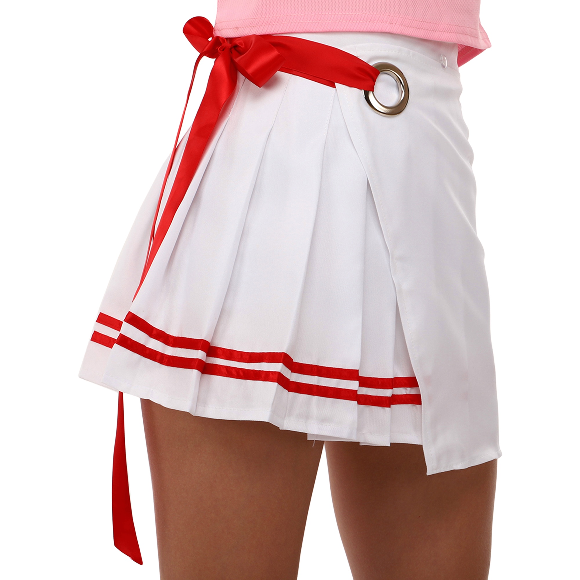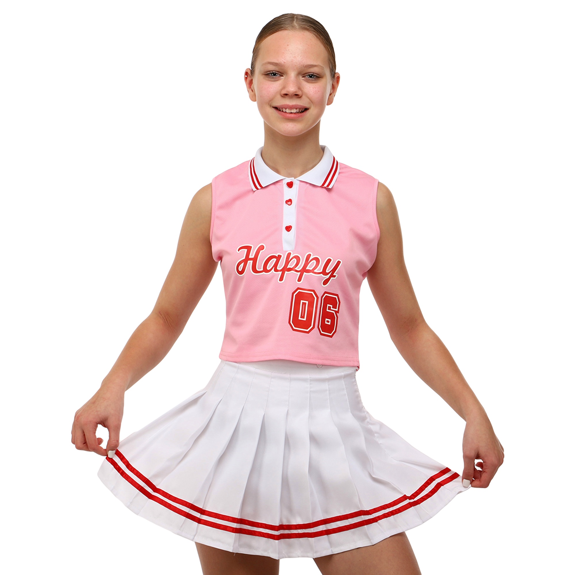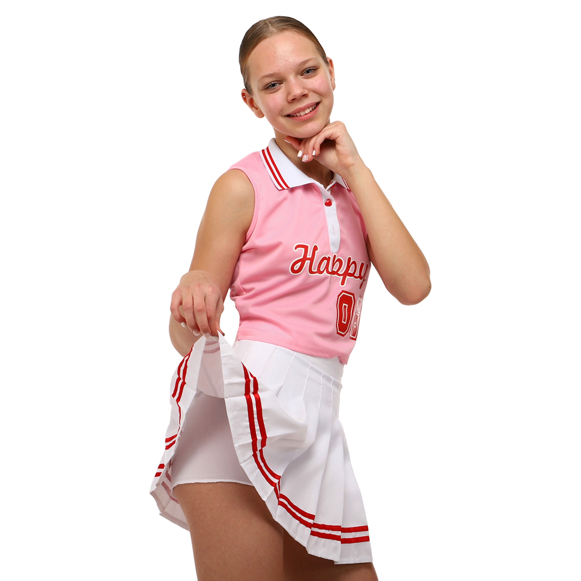В комплект для чирлидинга входит юбка и топ. Оба элемента набора изготовлены из синтетического эластичного материала — полиэстера. Материал не мнется, не нуждается в глажке, не впитывает неприятные запахи. Синтетическая ткань отводит от тела влагу, и не препятствует воздухообмену.