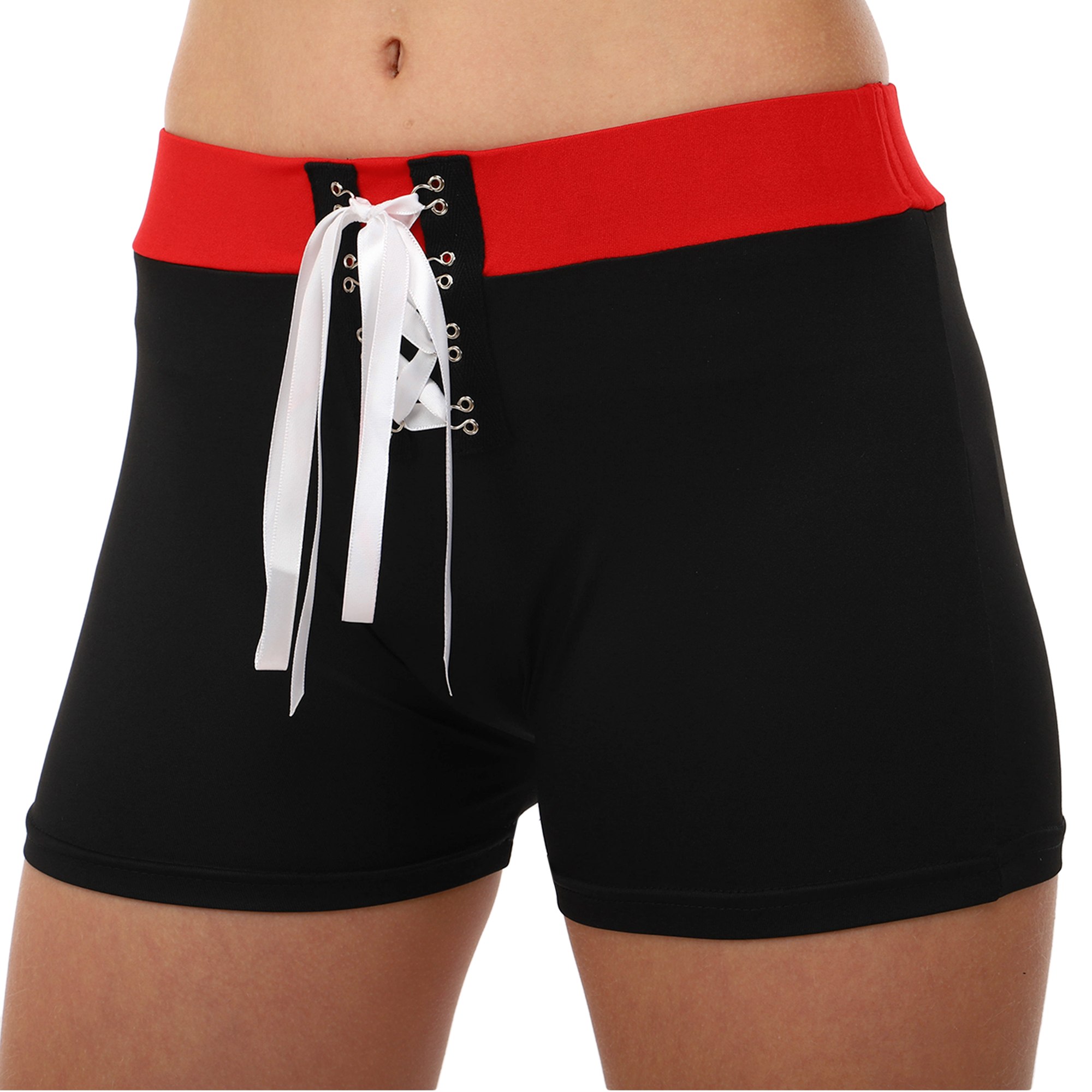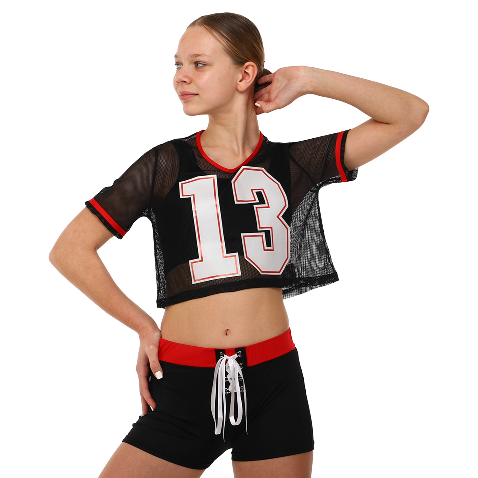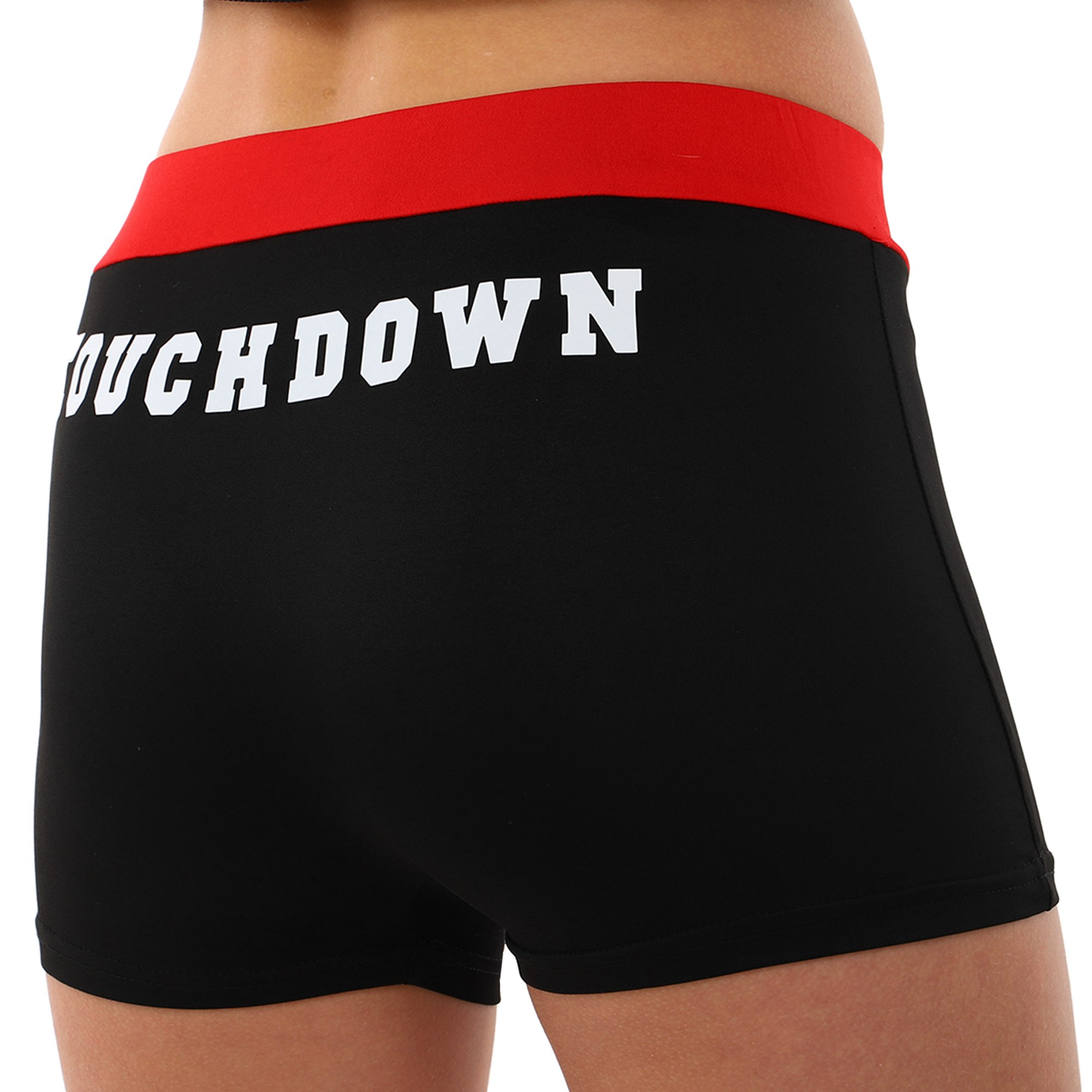 Комплект для чирлидинга состоит из шорт и топа. Короткие шорты изготовлены полиэстера. Эластичные шорты обтягивают тело и подчеркивают спортивную фигуру. На поясе фиксируются с помощью резинки и шнурка.