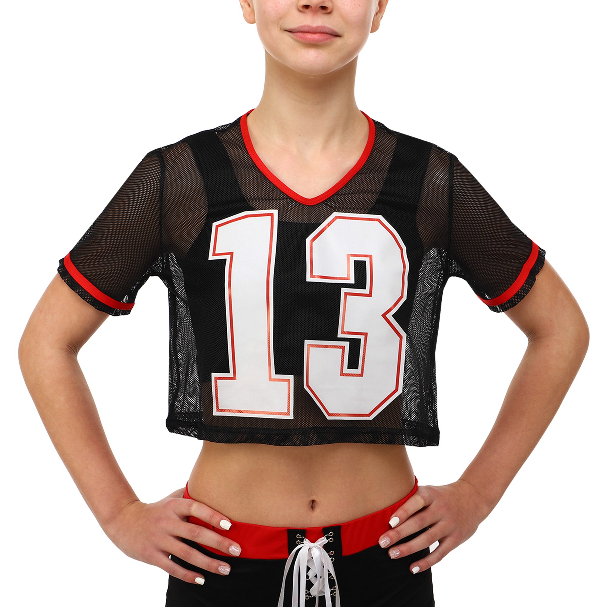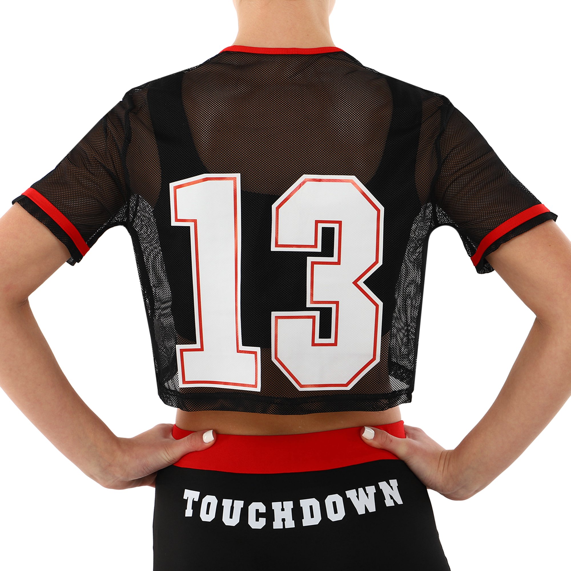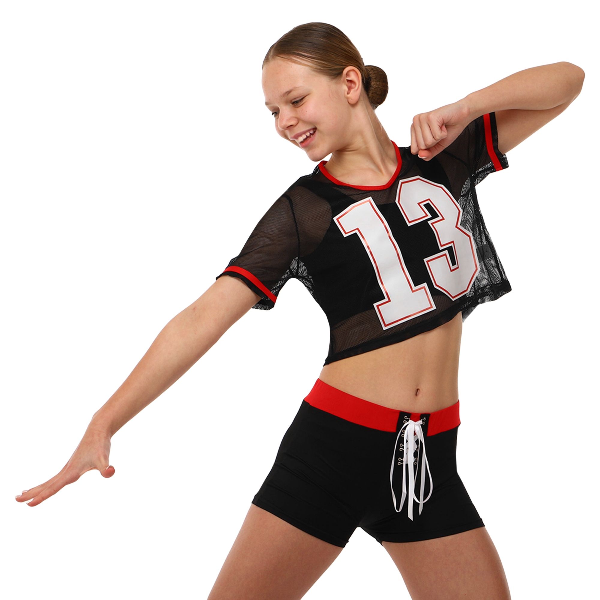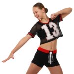 Комплект для чирлидинга состоит из шорт и топа. Короткие шорты изготовлены полиэстера. Эластичные шорты обтягивают тело и подчеркивают спортивную фигуру. На поясе фиксируются с помощью резинки и шнурка.