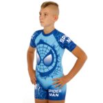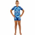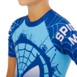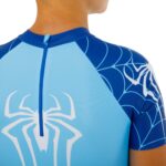 Костюм имеет слитный фасон с коротким рукавом, что обеспечивает дополнительную защиту плеч и рук от солнца, а также удобство в ношении. Застежка на спине, выполненная в виде небольшой молнии, делает надевание и снятие костюма простым и быстрым, что особенно удобно для родителей. В комплекте с костюмом идет солнцезащитная шапочка, выполненная в том же стиле, что и основной костюм. Шапочка не только дополняет образ, но и обеспечивает защиту головы и шеи ребенка от солнечных лучей.