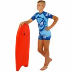 Купальный костюм выполнен из высококачественного материала, сочетающего полиэстер и спандекс, что придает изделию высокую эластичность, прочность и комфорт. Полиэстер обеспечивает устойчивость к износу и быстрому высыханию, а спандекс добавляет костюму гибкость, позволяя ему идеально прилегать к телу, не стесняя движений ребенка. Благодаря этим материалам, костюм надежно защищает кожу от воздействия ультрафиолетовых лучей, что особенно важно для чувствительной детской кожи.