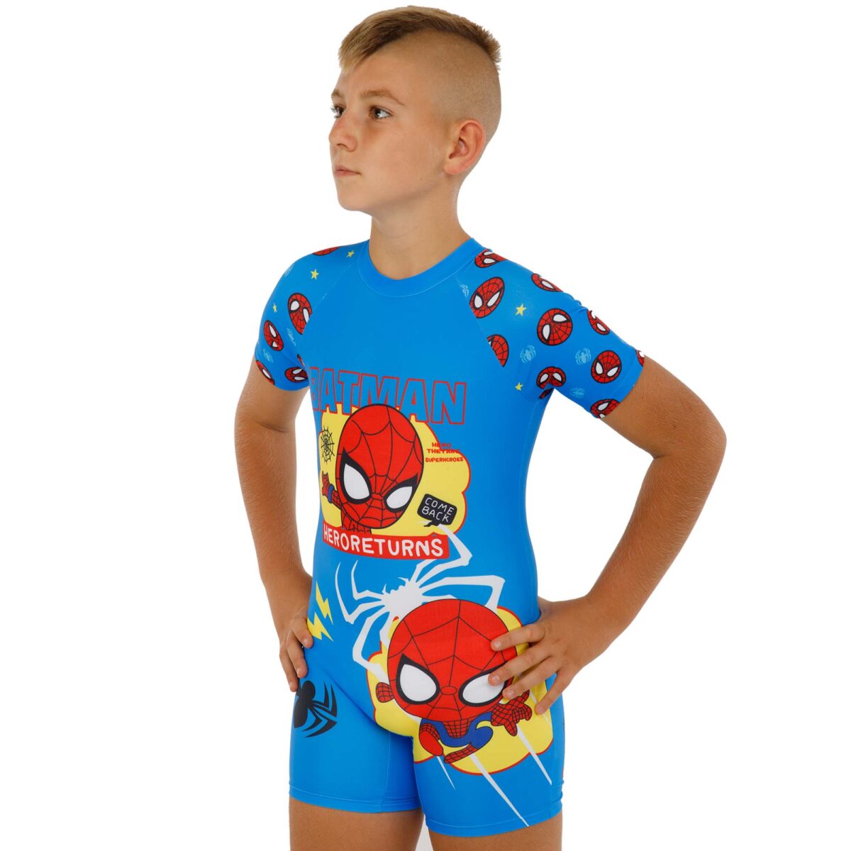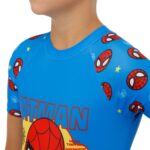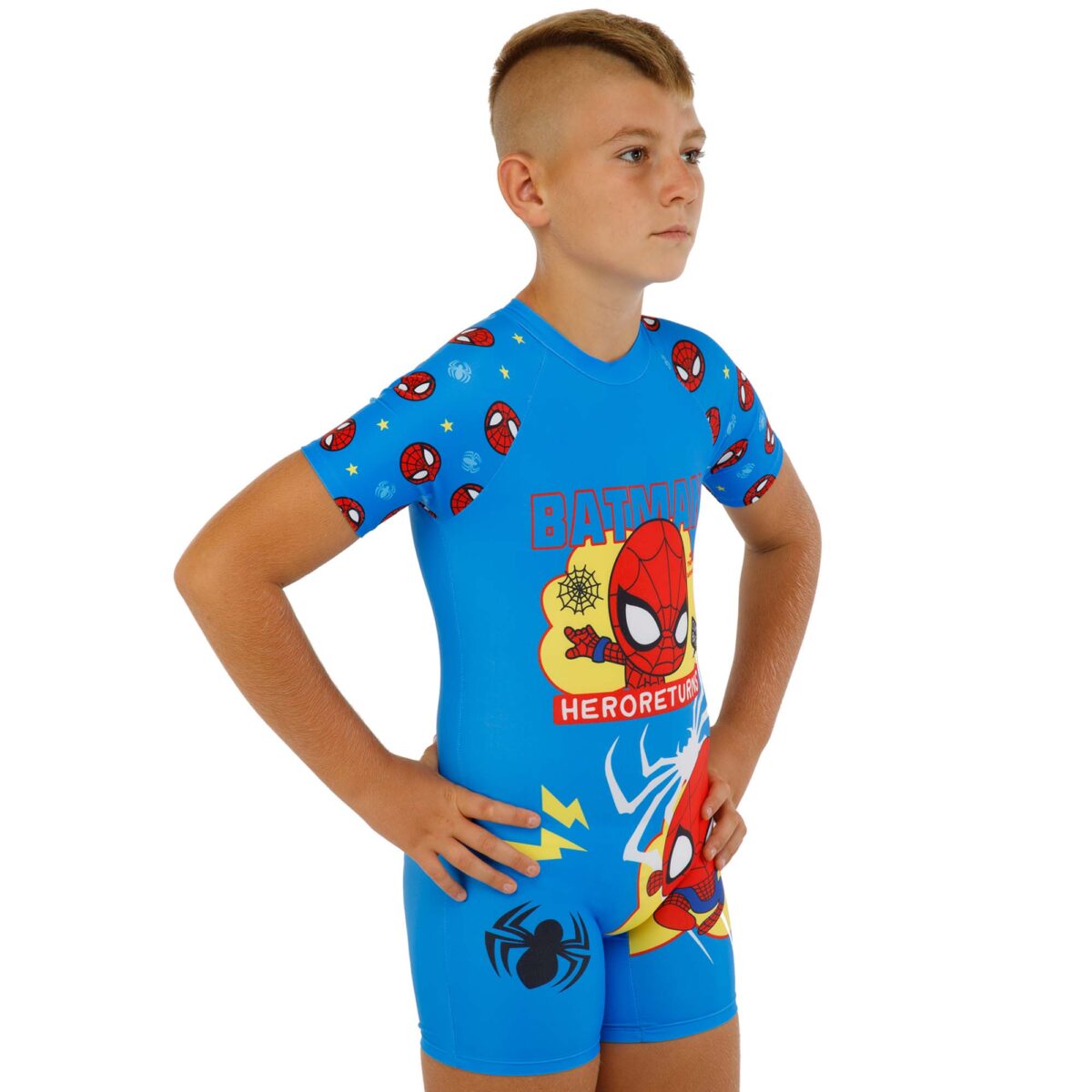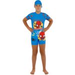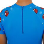 Костюм имеет слитный фасон с коротким рукавом, что обеспечивает дополнительную защиту плеч и рук от солнца, а также удобство в ношении. Застежка на спине, выполненная в виде небольшой молнии, делает надевание и снятие костюма простым и быстрым, что особенно удобно для родителей. В комплекте с костюмом идет солнцезащитная шапочка, выполненная в том же стиле, что и основной костюм. Шапочка не только дополняет образ, но и обеспечивает защиту головы и шеи ребенка от солнечных лучей.