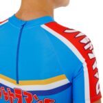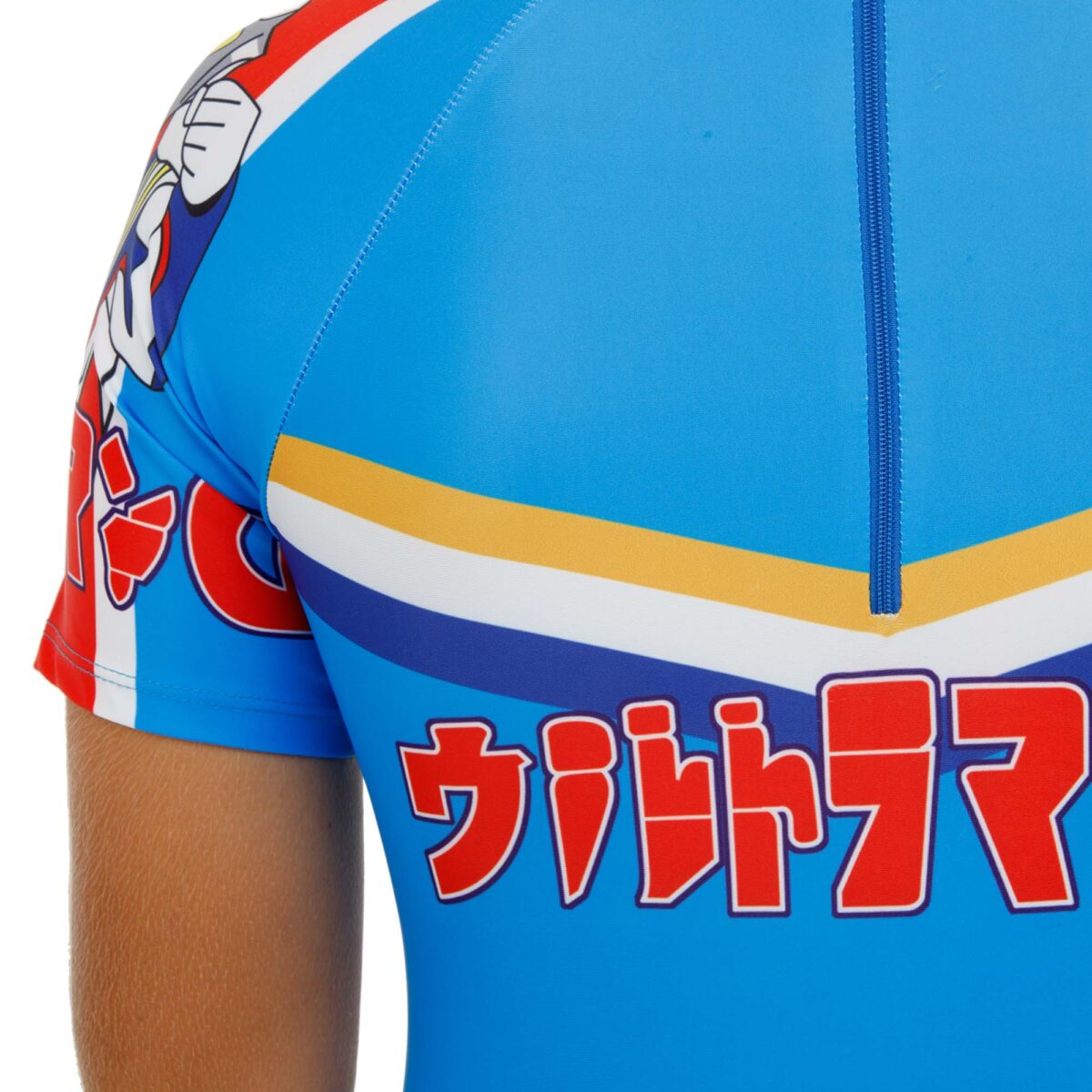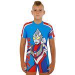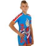 Костюм имеет слитный фасон с коротким рукавом, что обеспечивает дополнительную защиту плеч и рук от солнца, а также удобство в ношении. Застежка на спине, выполненная в виде небольшой молнии, делает надевание и снятие костюма простым и быстрым, что особенно удобно для родителей. В комплекте с костюмом идет солнцезащитная шапочка, выполненная в том же стиле, что и основной костюм. Шапочка не только дополняет образ, но и обеспечивает защиту головы и шеи ребенка от солнечных лучей.