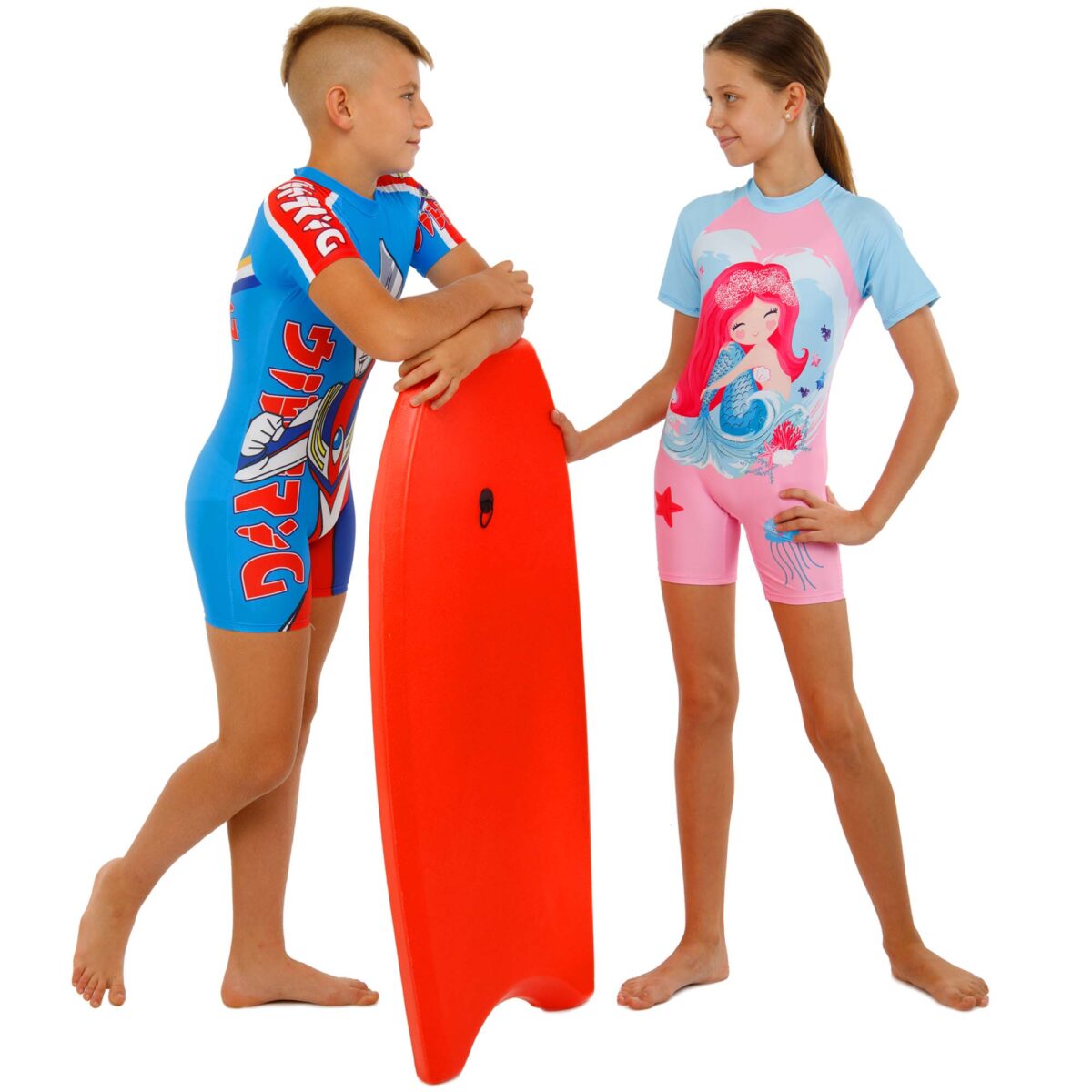 Купальный костюм выполнен из высококачественного материала, сочетающего полиэстер и спандекс, что придает изделию высокую эластичность, прочность и комфорт. Полиэстер обеспечивает устойчивость к износу и быстрому высыханию, а спандекс добавляет костюму гибкость, позволяя ему идеально прилегать к телу, не стесняя движений ребенка. Благодаря этим материалам, костюм надежно защищает кожу от воздействия ультрафиолетовых лучей, что особенно важно для чувствительной детской кожи.