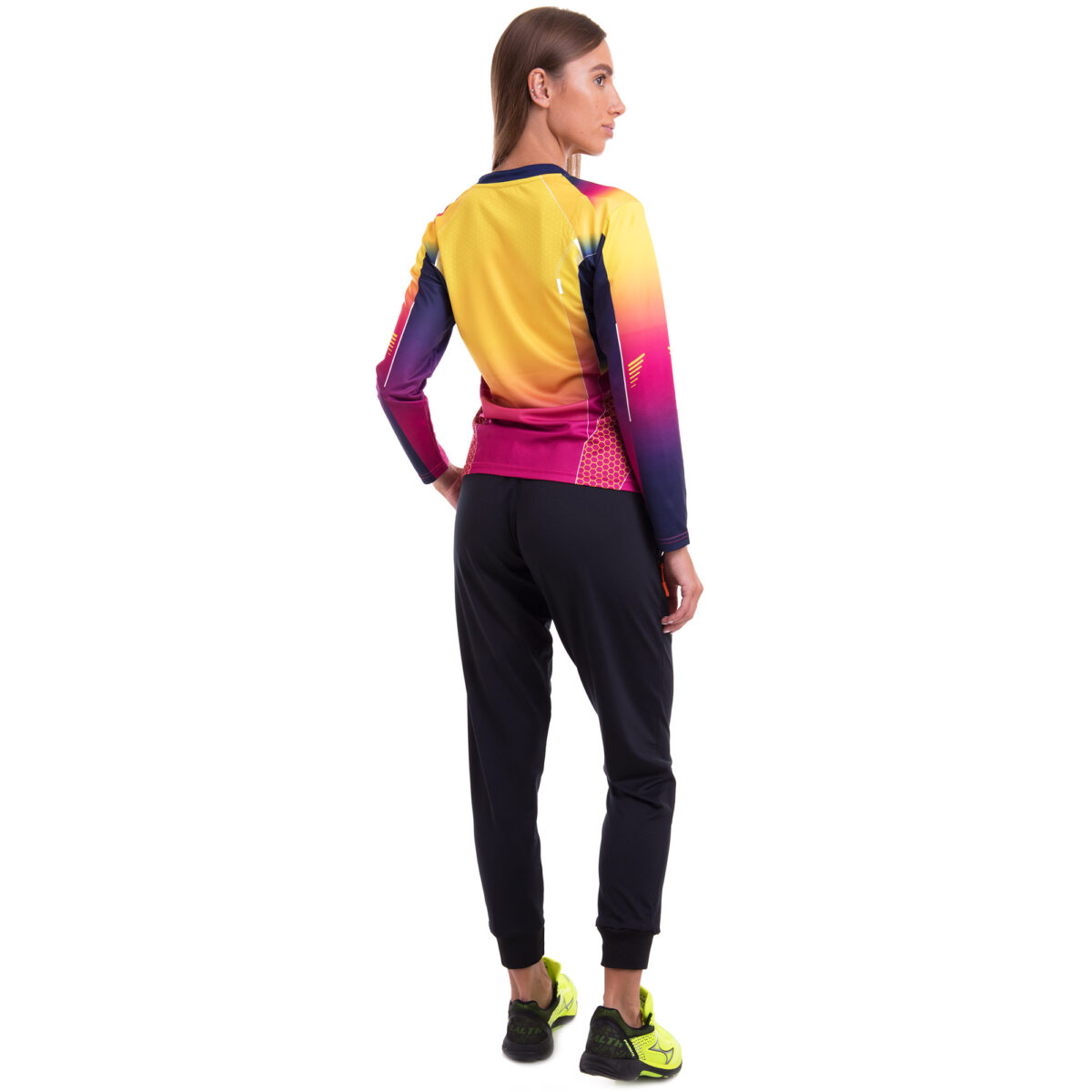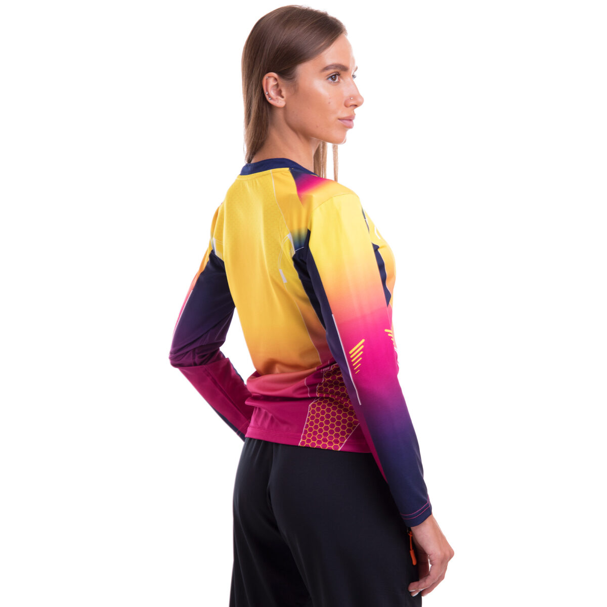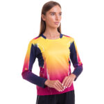 Лонгслив выполнен в приталенном крое с круглым вырезом, что придает фигуре женственность и подчеркивает ее достоинства. Благодаря использованию спандекса, он идеально облегает тело, обеспечивая свободу движений и комфорт во время интенсивных тренировок. Ткань обладает хорошей воздухопроницаемостью, что позволяет коже дышать и предотвращает перегревание.