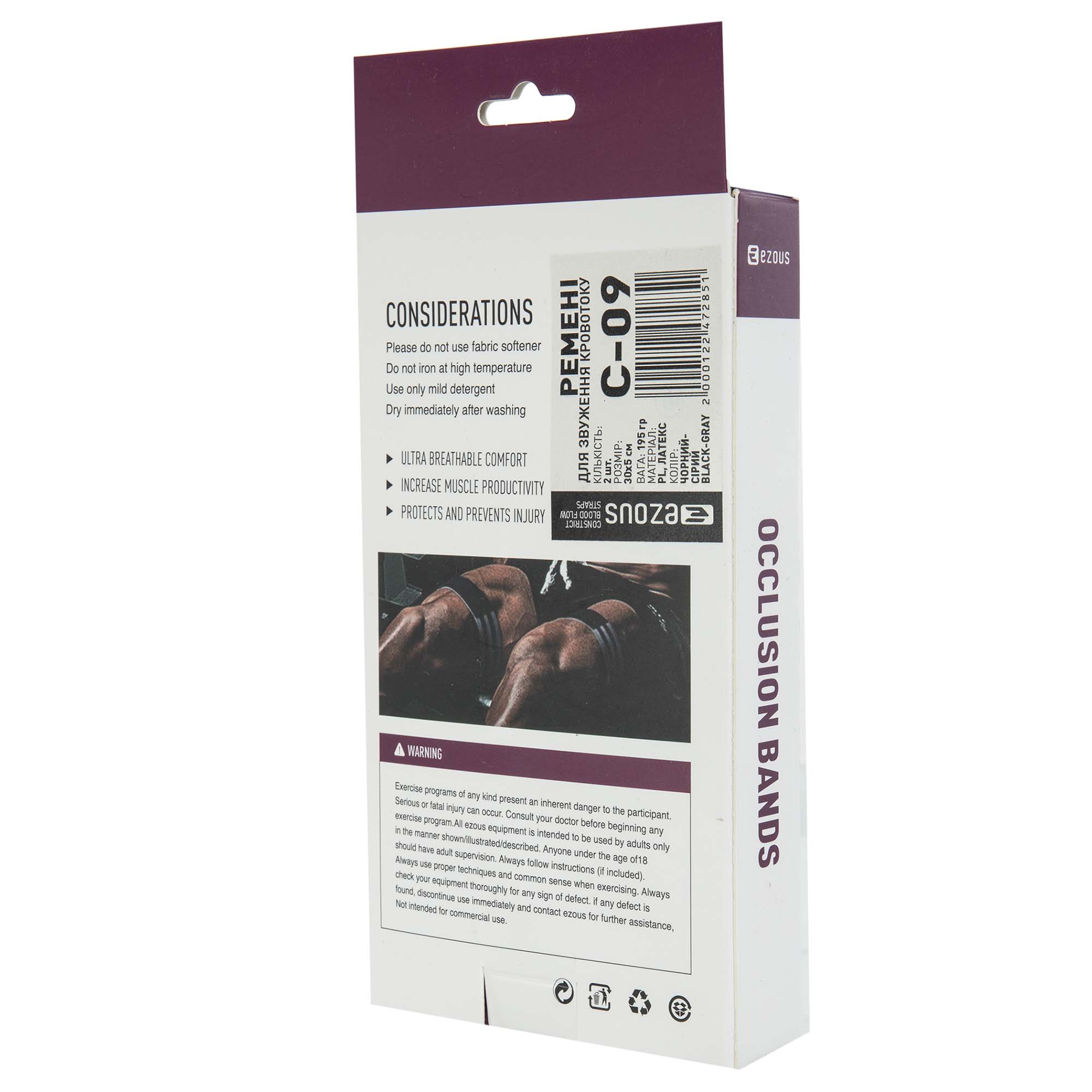 Ремни для сужения кровотока OCCLUSION BANDS EZOUS изготовлены из полиэстера и латекса. Полиэстер обладает большим запасом прочности, а латекс обеспечивает хорошую эластичность изделия. Ремешки предназначены для сужения кровотока и, как следствие, улучшения мышечного отклика на нагрузку. Изделие необходимо зафиксировать перед мышечной группой, которую вы планируете тренировать следующей. Степень фиксации можно регулировать благодаря удобной застежке. Сужение кровотока приводит к увеличению синтеза белка в мышце и уменьшению поступления кислорода. Такая стрессовая ситуация приводит к улучшению мышечного отклика на привычную для вас нагрузку.
