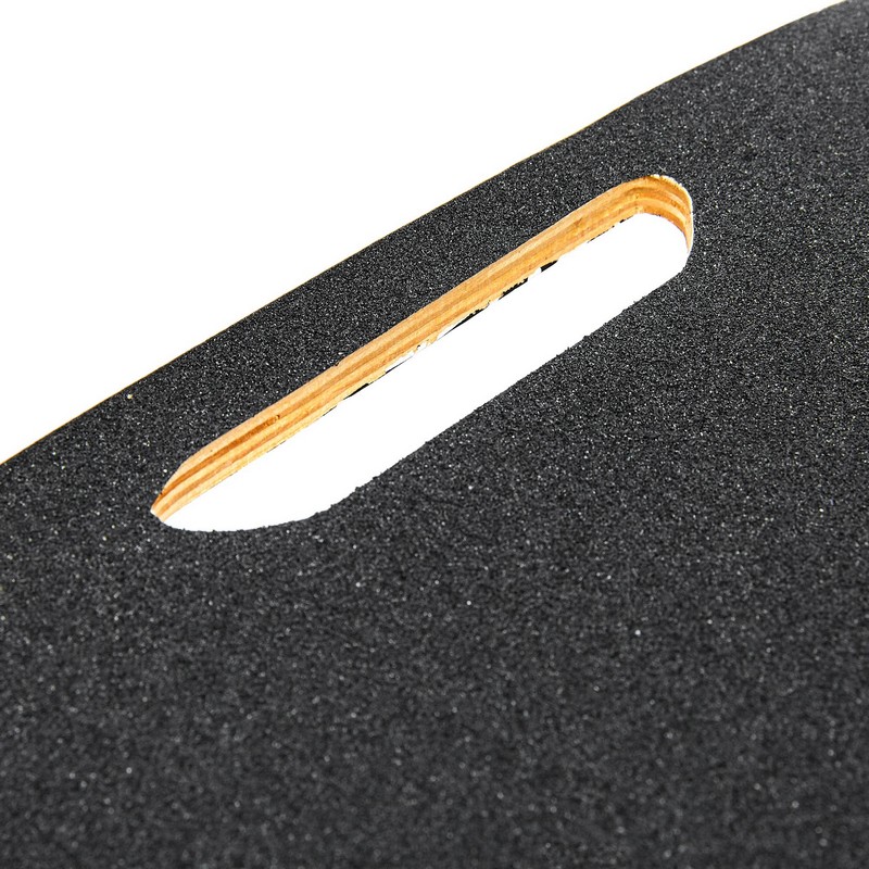 Дека изготовлена из дерева и покрыта нескользящим материалом. На деке расположено отверстие, которое позволяет удобно носить борд в руке.