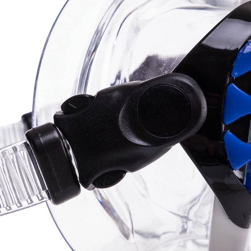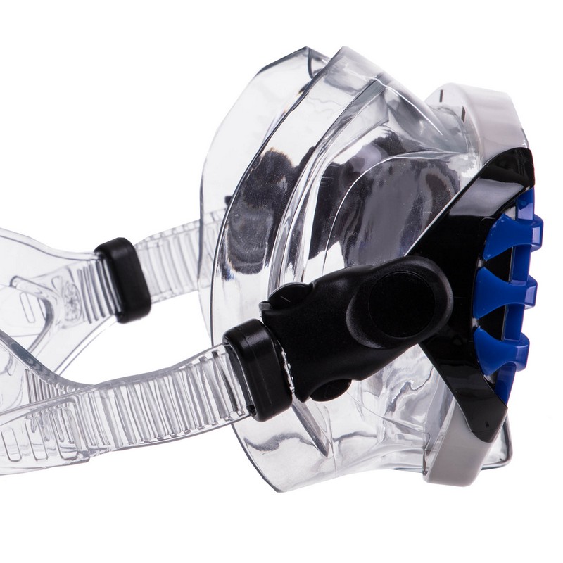 Обтюратор из мягкого эластичного поливинилхлорида плотно прилегает к лицу, повторяя его очертания, благодаря чему под маску не попадает вода. На голове аксессуар фиксируется прочным эластичным ремешком, застежками которого можно подогнать его по размеру.
