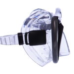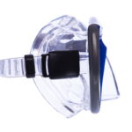 Обтюратор из мягкого эластичного поливинилхлорида плотно прилегает к лицу, повторяя его очертания, благодаря чему под маску не попадает вода. На голове аксессуар фиксируется прочным эластичным ремешком, застежками которого можно подогнать его по размеру.