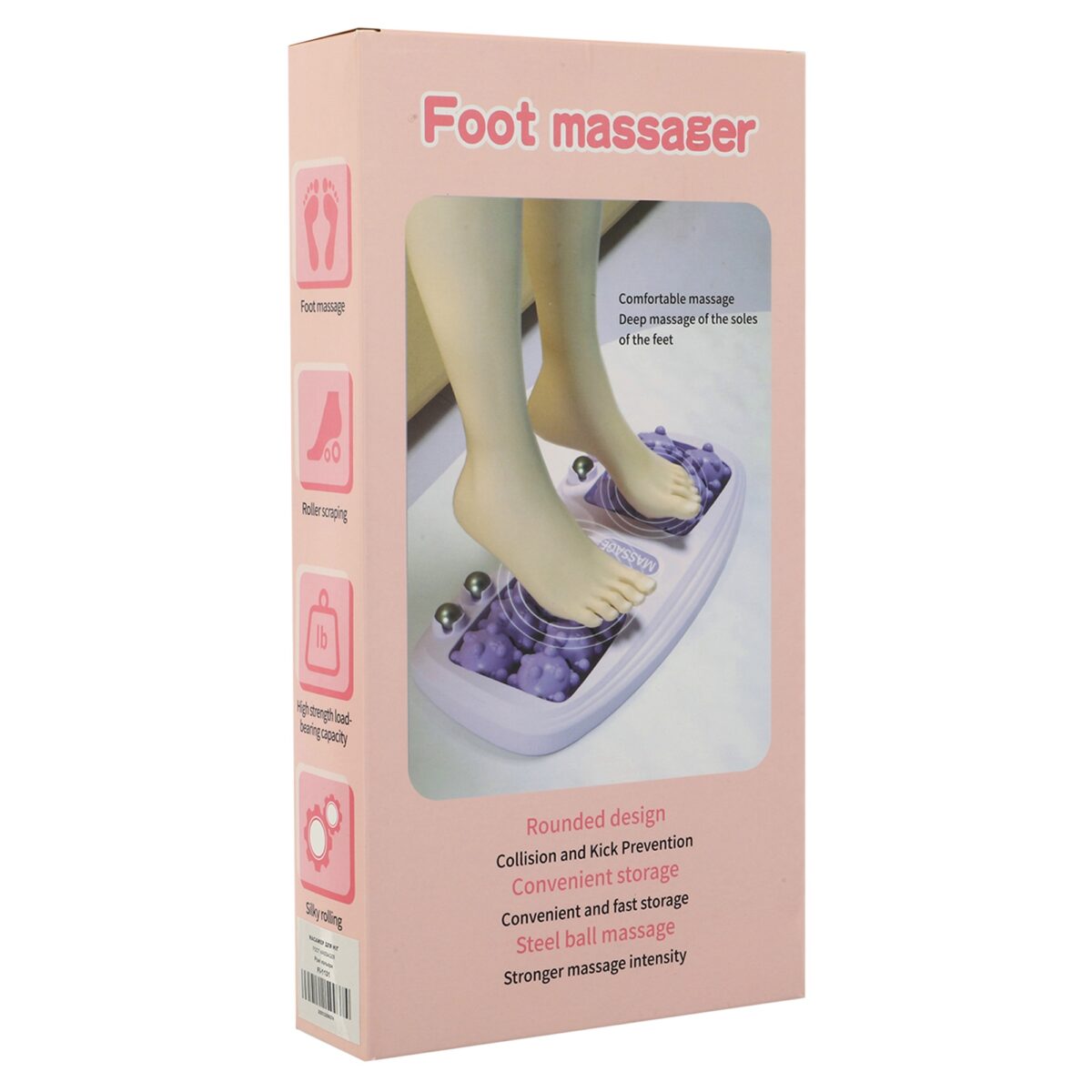 Массажер представляет собой компактное устройство длиной 27 см, шириной 14 см и высотой 3 см, выполненное из качественного пластика и металла. Основной элемент устройства — 16 роликов, которые обеспечивают глубокий массаж стоп, стимулируя активные точки на поверхности подошвы.