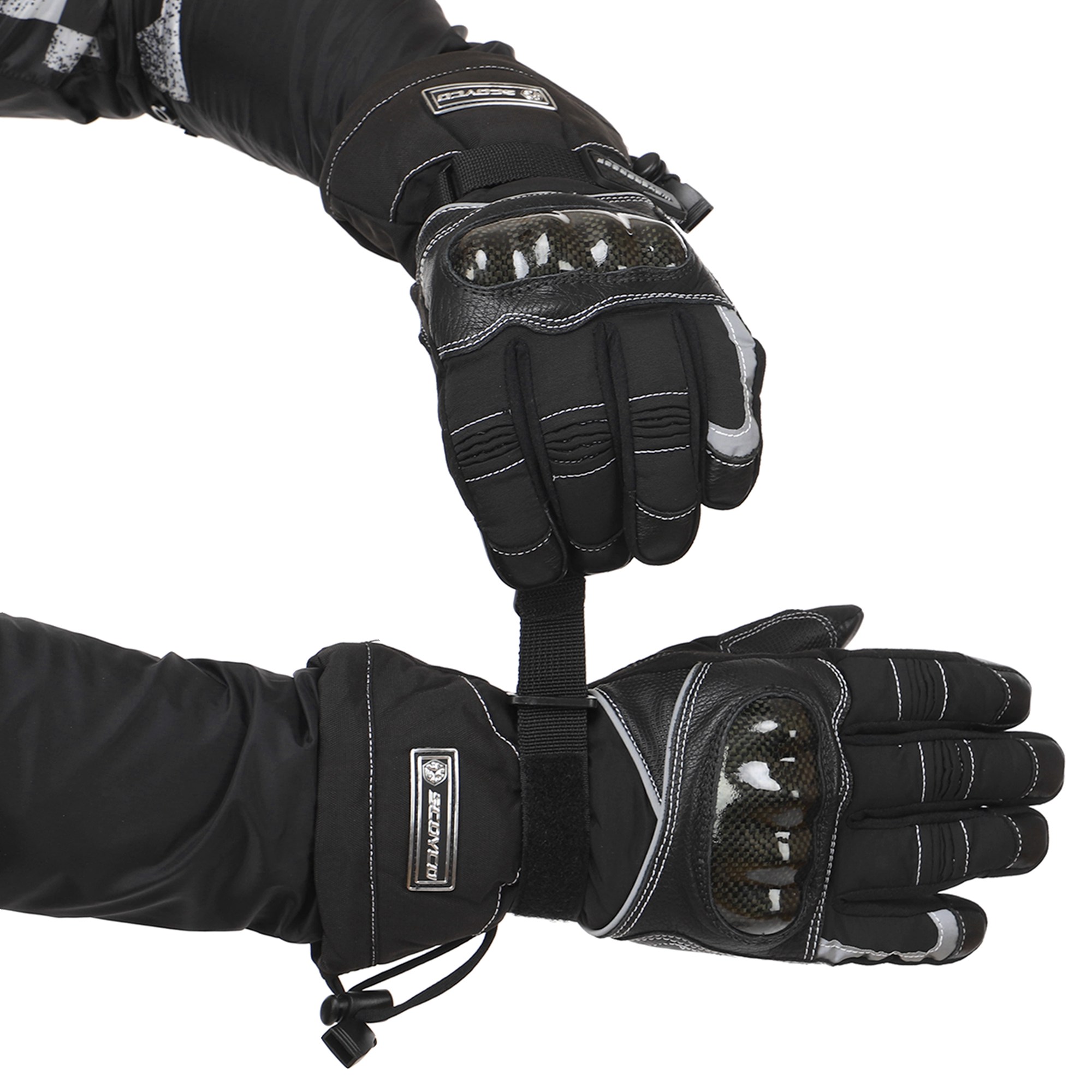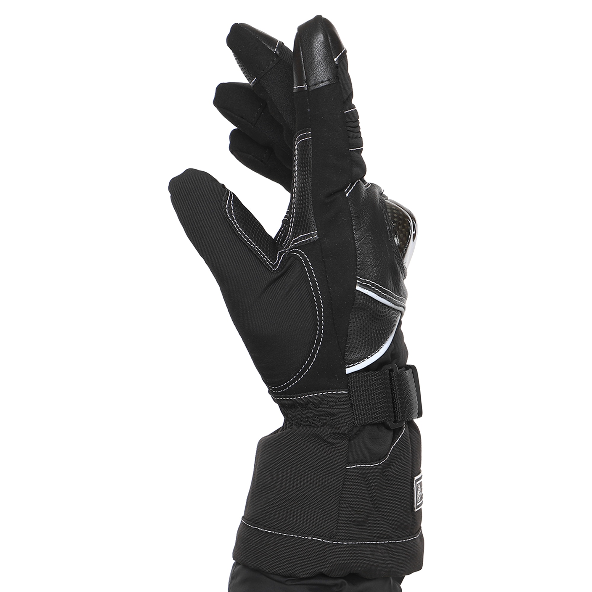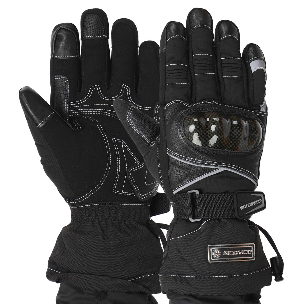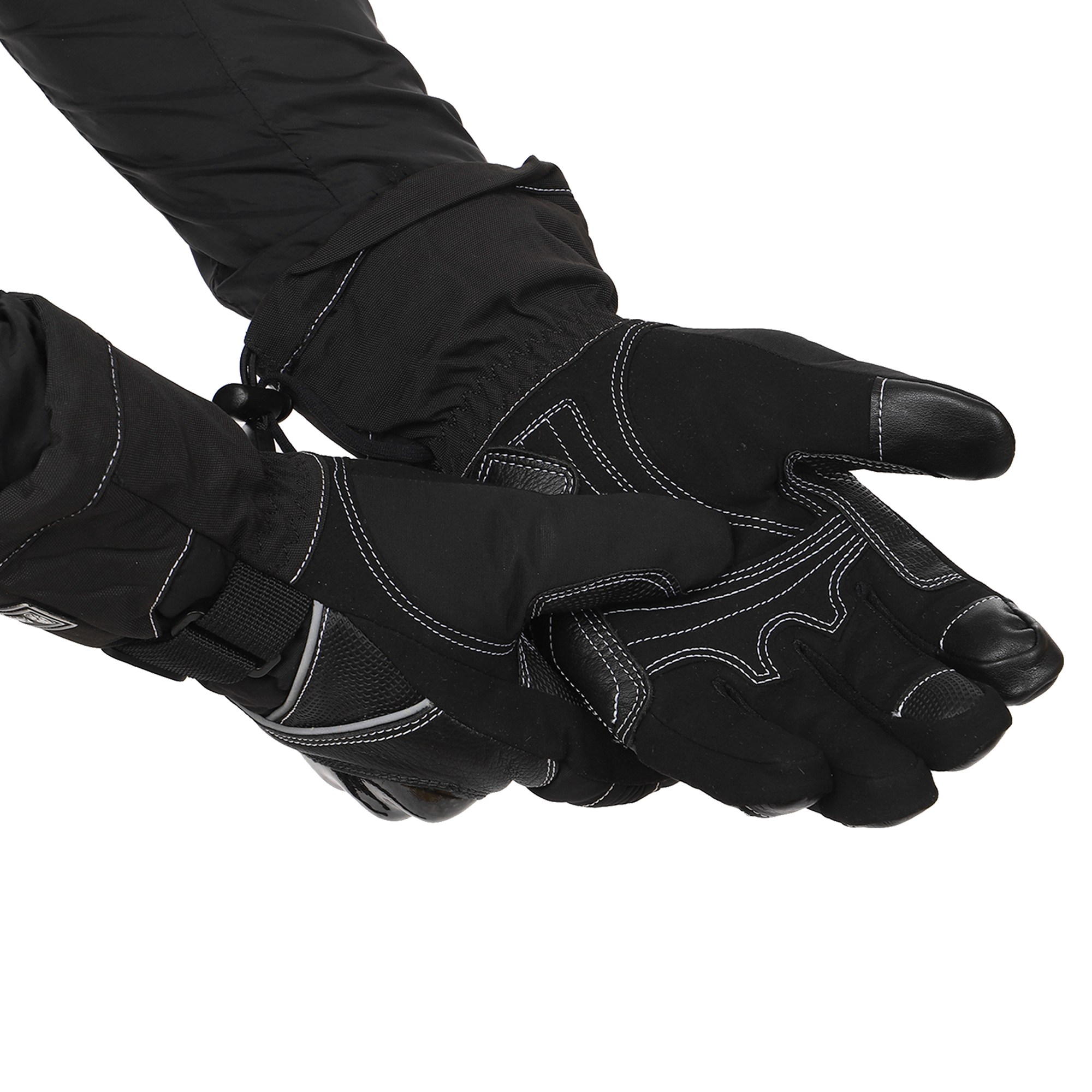 Для изготовления мотоперчаток используются высококачественные натуральные и синтетические материалы – полиэстер, поливинилхлорид (PVC). Благодаря такой комбинации они отличаются лёгкостью, которая сочетается с невероятной прочностью на раздир и устойчивостью к износу. Помимо этого они не промокают, в них не жарко летом и не холодно зимой. Суставы (костяшки) пальцев прикрыты защитной накладкой из высокопрочного карбона. Между большим пальцем и ладонью перчатки вшита V-образная вставка с текстурированной поверхностью, которая добавляет хвату надёжности.