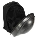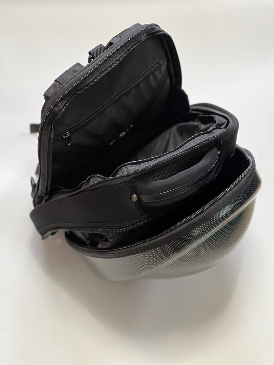 В рюкзаке 2 отделения, которые закрываются на молнию. Жесткий каркас рюкзака не мнется и хорошо держит форму. В нем можно перевозить ценные вещи и гаджеты. Содержимое моторюкзака не повредится.