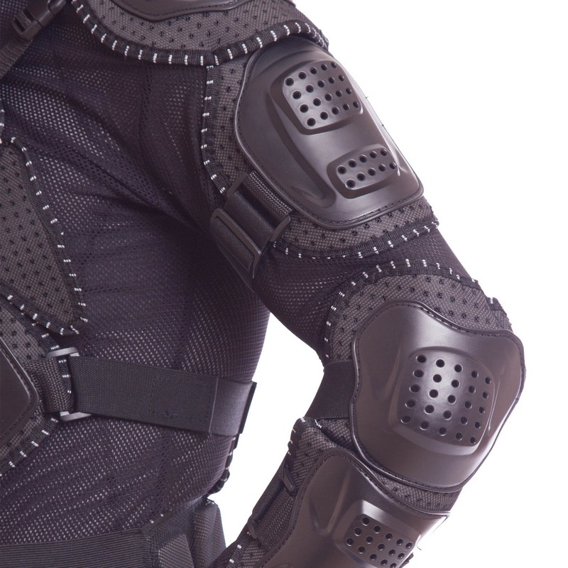 Защитная мотоэкипировка изготовлена из полиэстера и сетчатой ткани. Накладки для плечей, груди, спины и локтей изготовлены из сетчатой ткани. Ткань пропускает воздух и позволяет телу дышать. Потому экипировку можно использовать даже в жаркое время года.