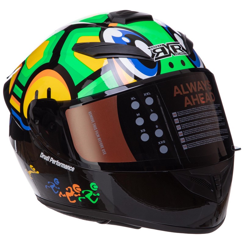 Мотошлем типа full face защищает все лицо и голову от удара в случае падения с мотоцикла. Защитная экипировка выбирается по размеру.