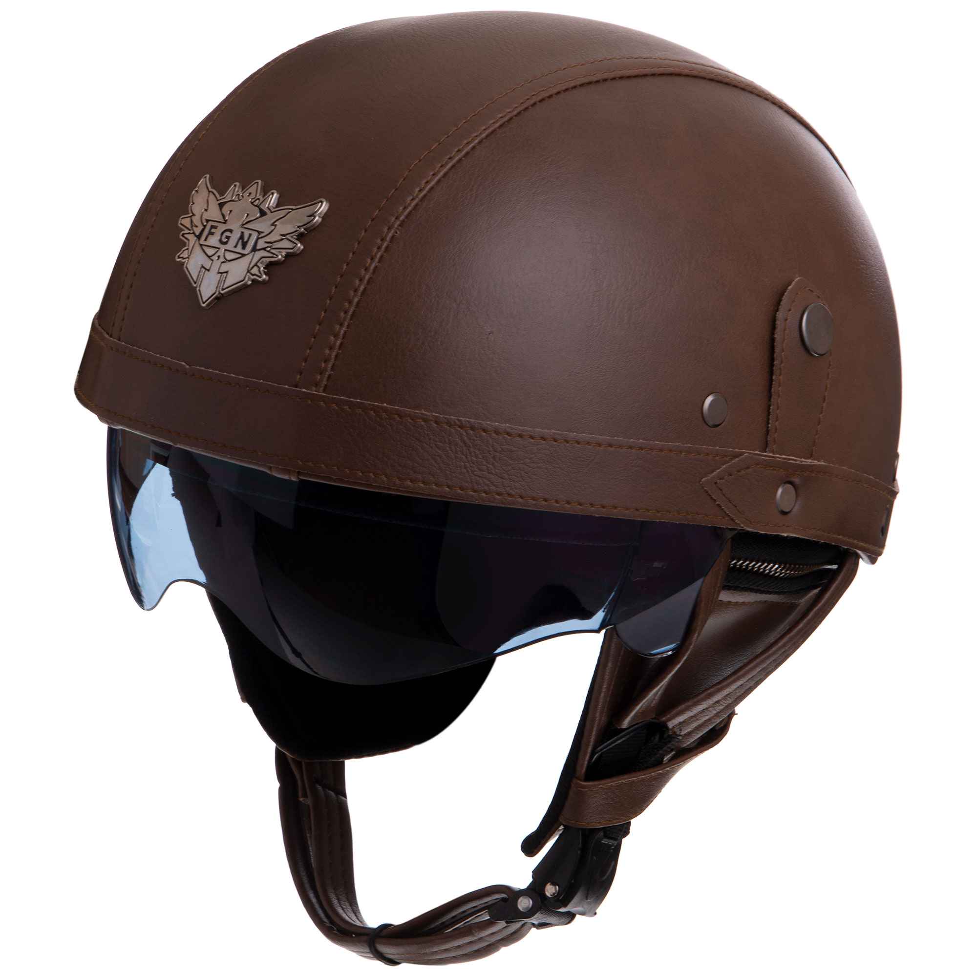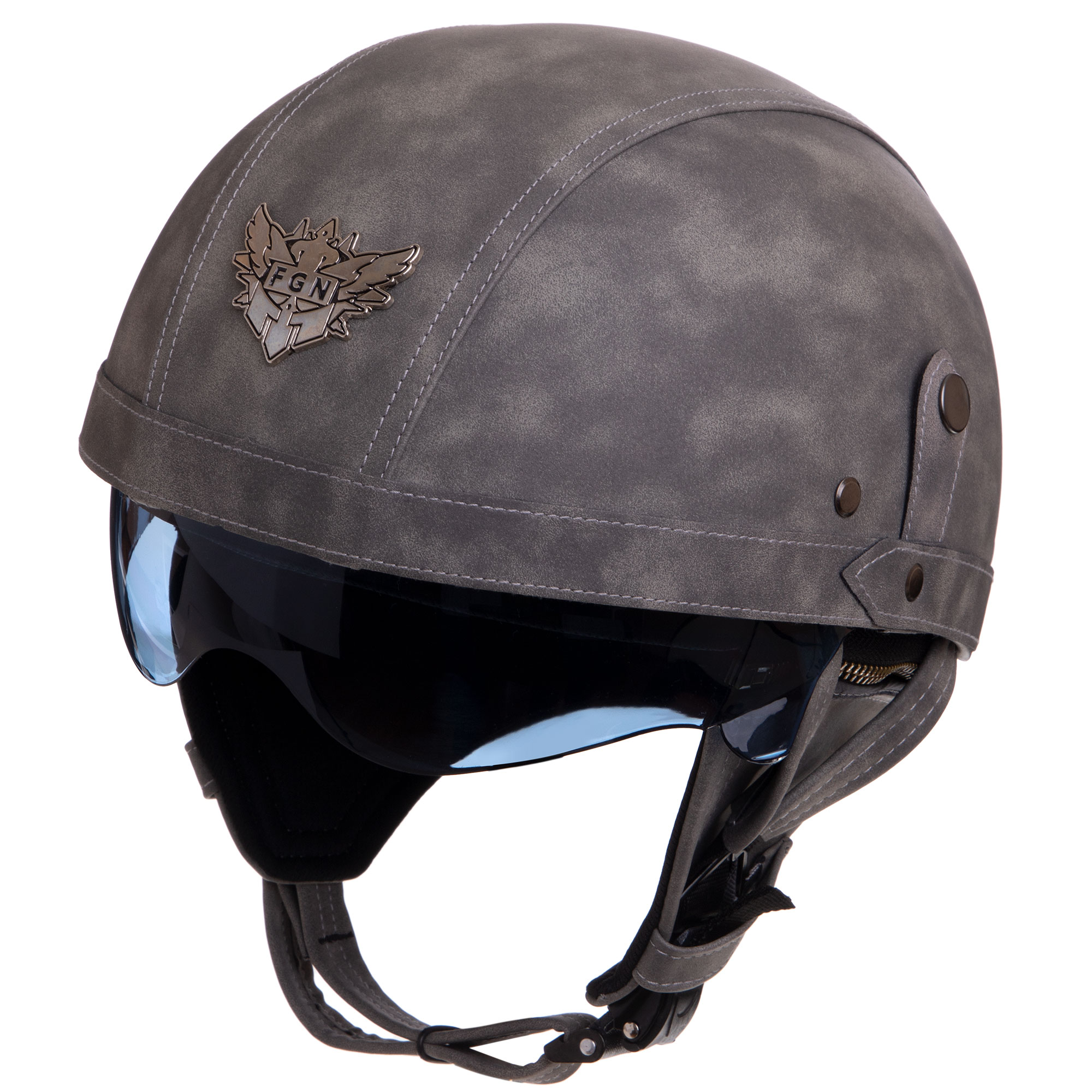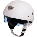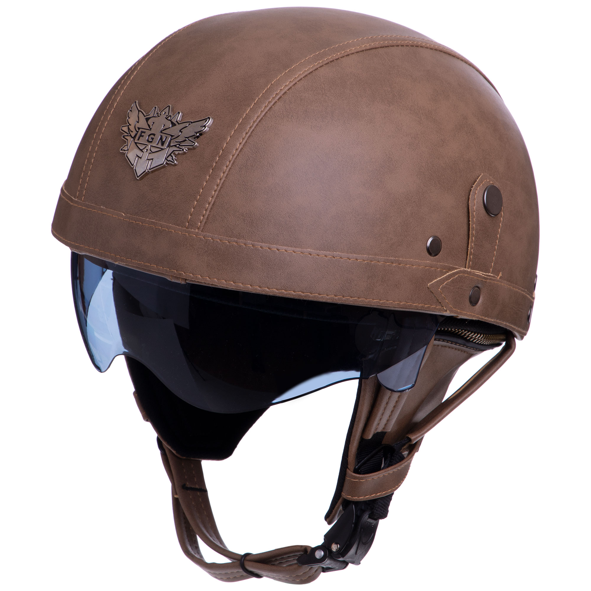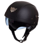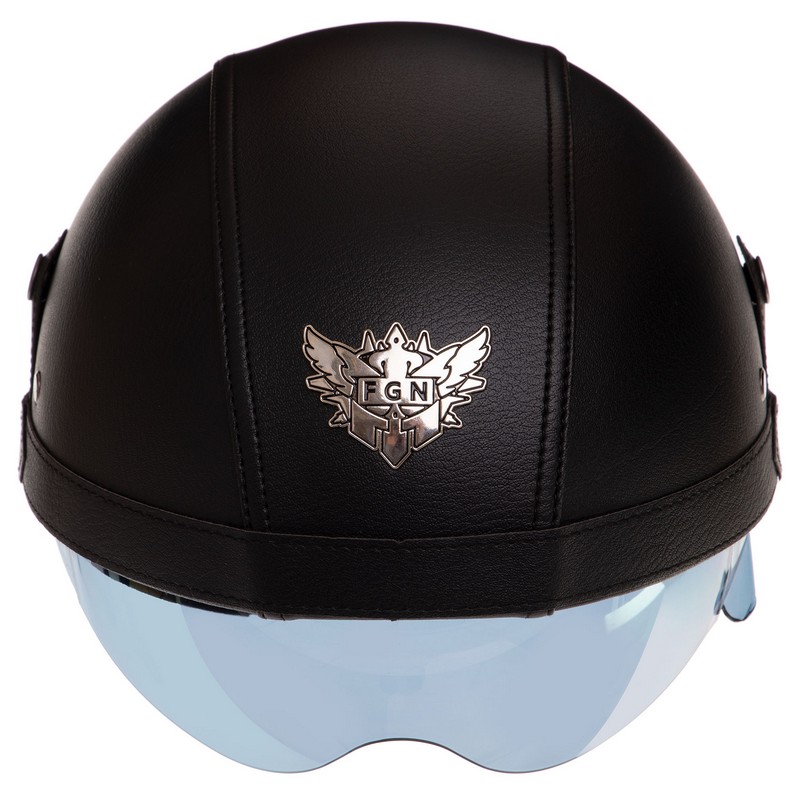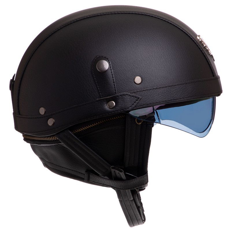 Стильный мотошлем в ретро стиле изготовлен из прочных материалов, которые в случае падения берут на себя основной удар. В конструкции шлема предусмотрена съемная накладка на затылок и визор. Цвет и размер шлема можно выбрать.