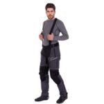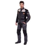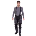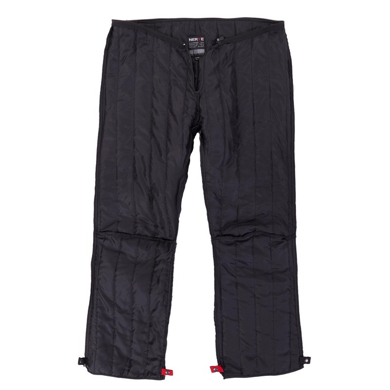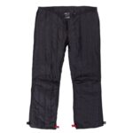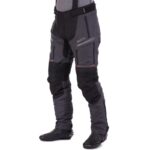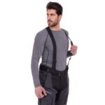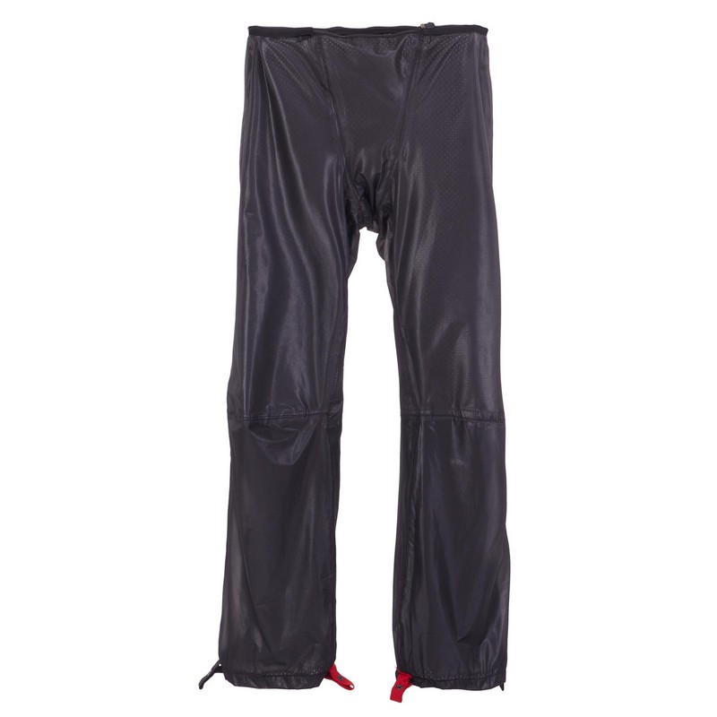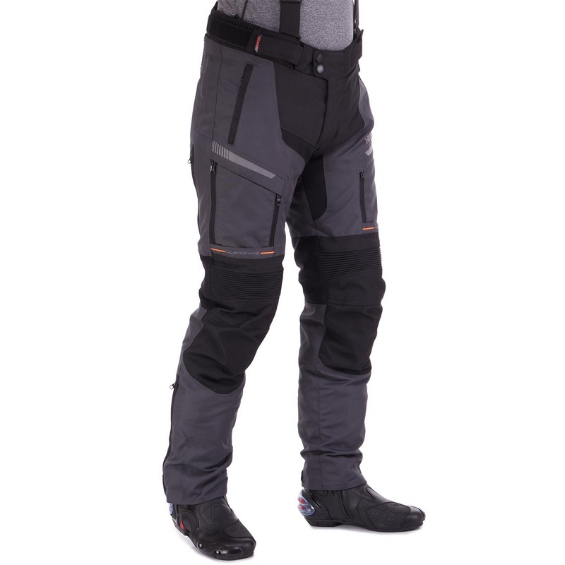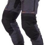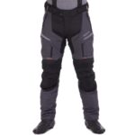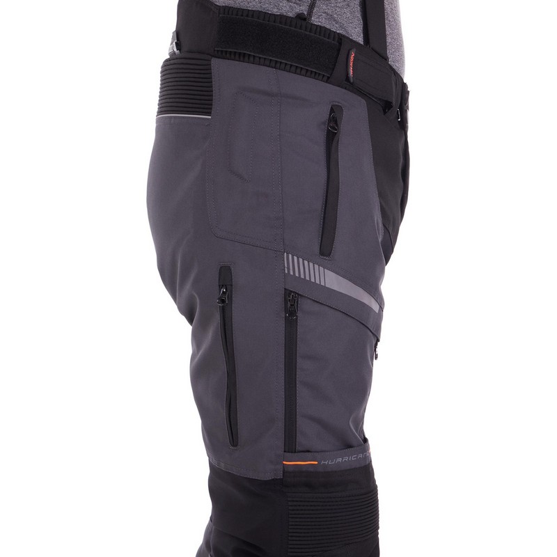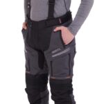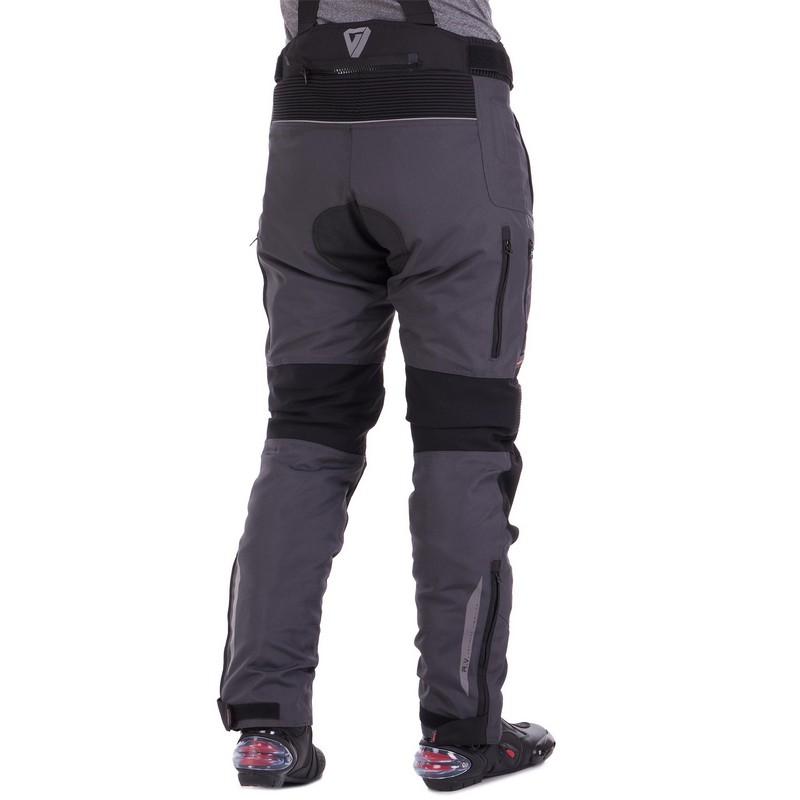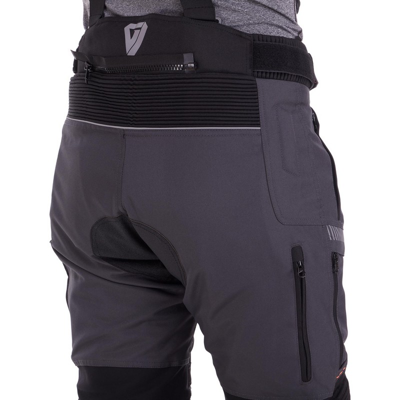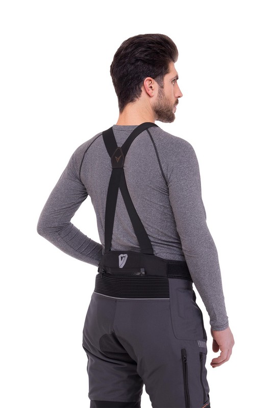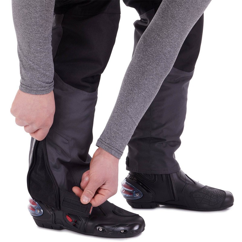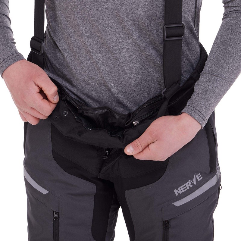 Штаны укомплектованы подтяжками. На поясе расположен ремень на липучке. Он позволяет регулировать штаны по обхвату. На поясе установлена ветрозащитная накладка и молния. С помощью молнии мотоштаны можно соединить с курткой.