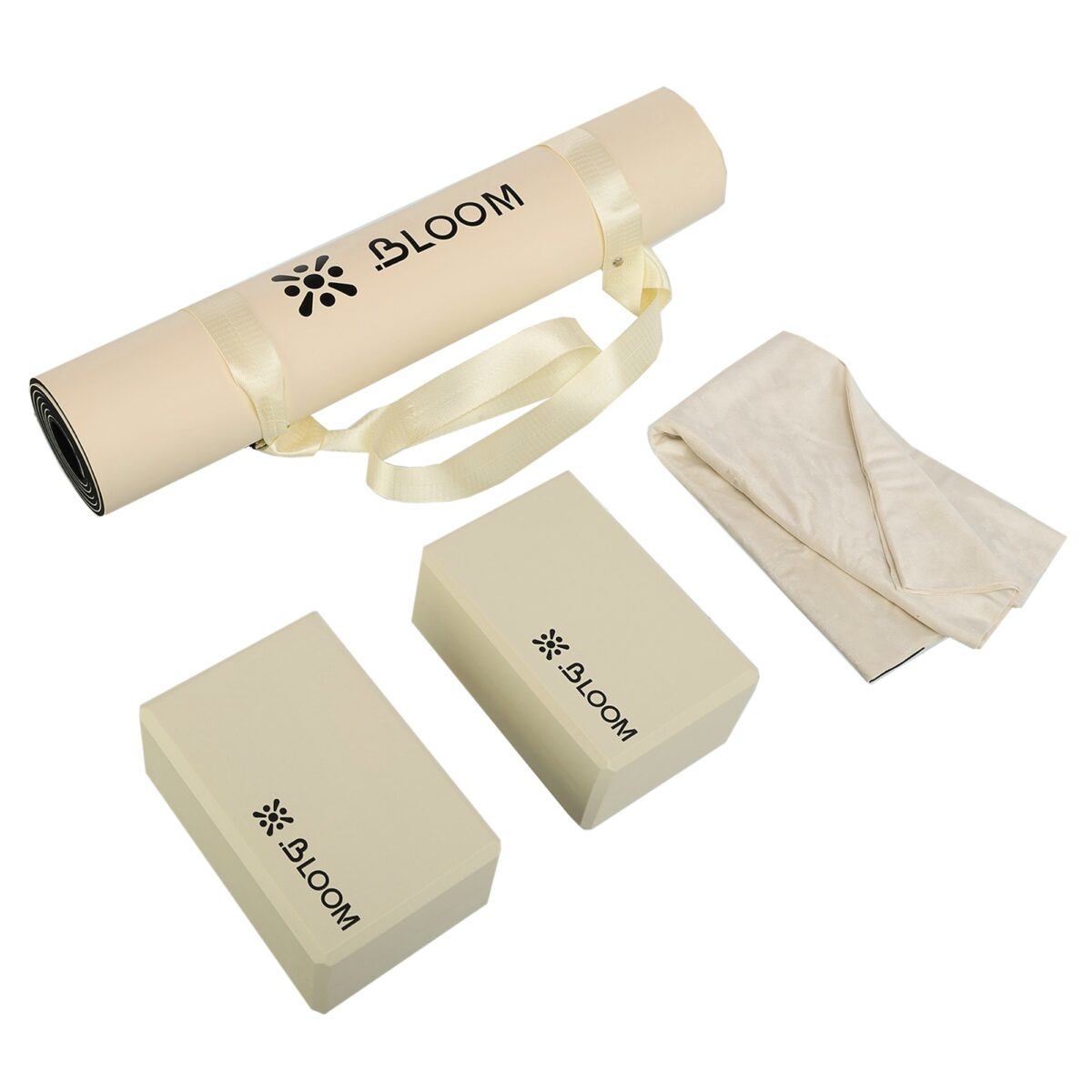 Набор для йоги 4в1 от BLOOM позволит приступить к занятиям йогой с максимальным комфортом. В набор входит коврик для йоги, который позволяет тренировать как дома, так и в зале. Он обеспечивает стабильность и устойчивость на любой поверхности. Блок для йоги позволяет снизить нагрузку на суставы, а также обеспечивает стабильную опоры во время выполнения некоторых асан. Для новичков использовать такой аксессуар особенно важно.