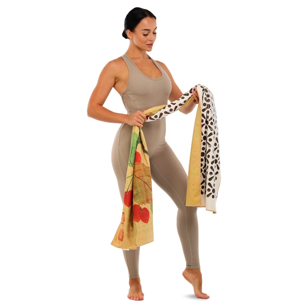 На полотенце нанесен рисунок бегонии. Его можно использовать поверх коврика для дополнительного комфорта во время занятий йогой. Блоки для йоги позволят на начальном этапе занятий снизить нагрузку на суставы. Стяжку для коврика можно использовать также во время выполнения упражнений на растяжку.