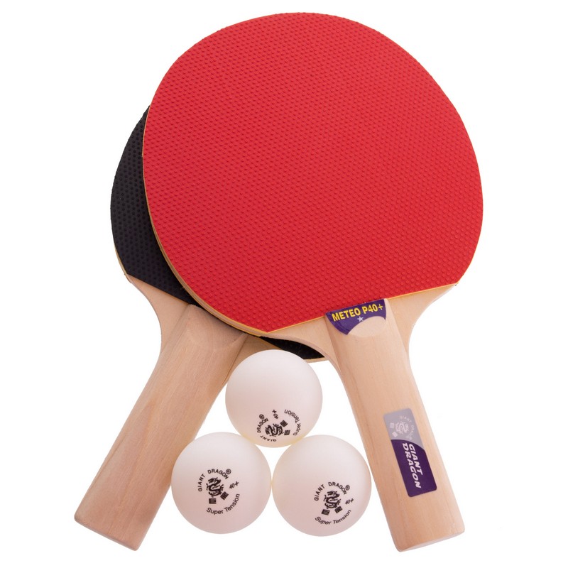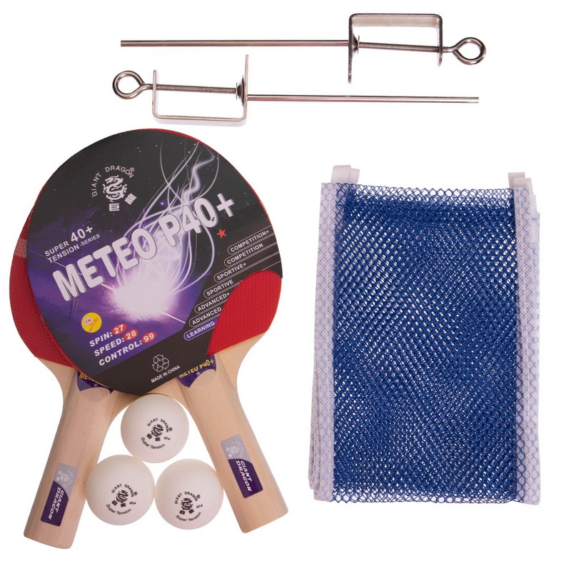 В комплект входят две ракетки, три мяча, сетка с креплением и чехол, обеспечивающие всё необходимое для игры. Ракетки сделаны из дерева и резины (RB), что обеспечивает высокую прочность и долговечность. Шипованная поверхность ракеток улучшает контроль и позволяет разнообразить стили игры, делая их идеальными для защитного стиля (DEF).